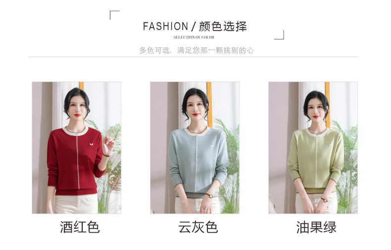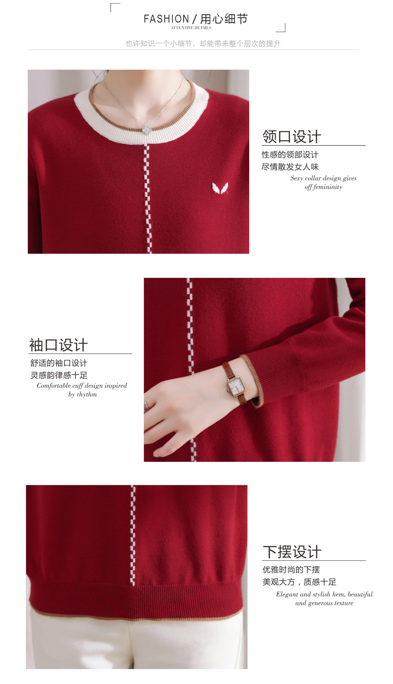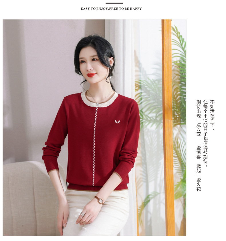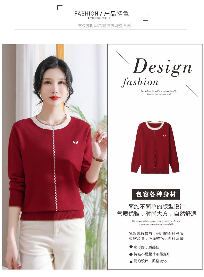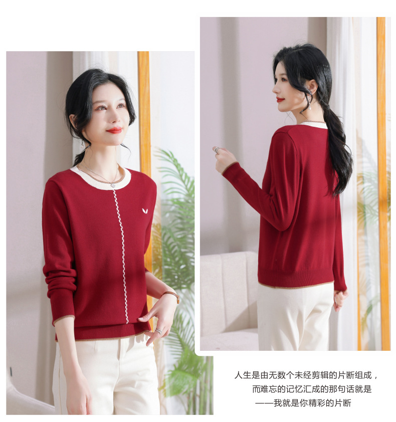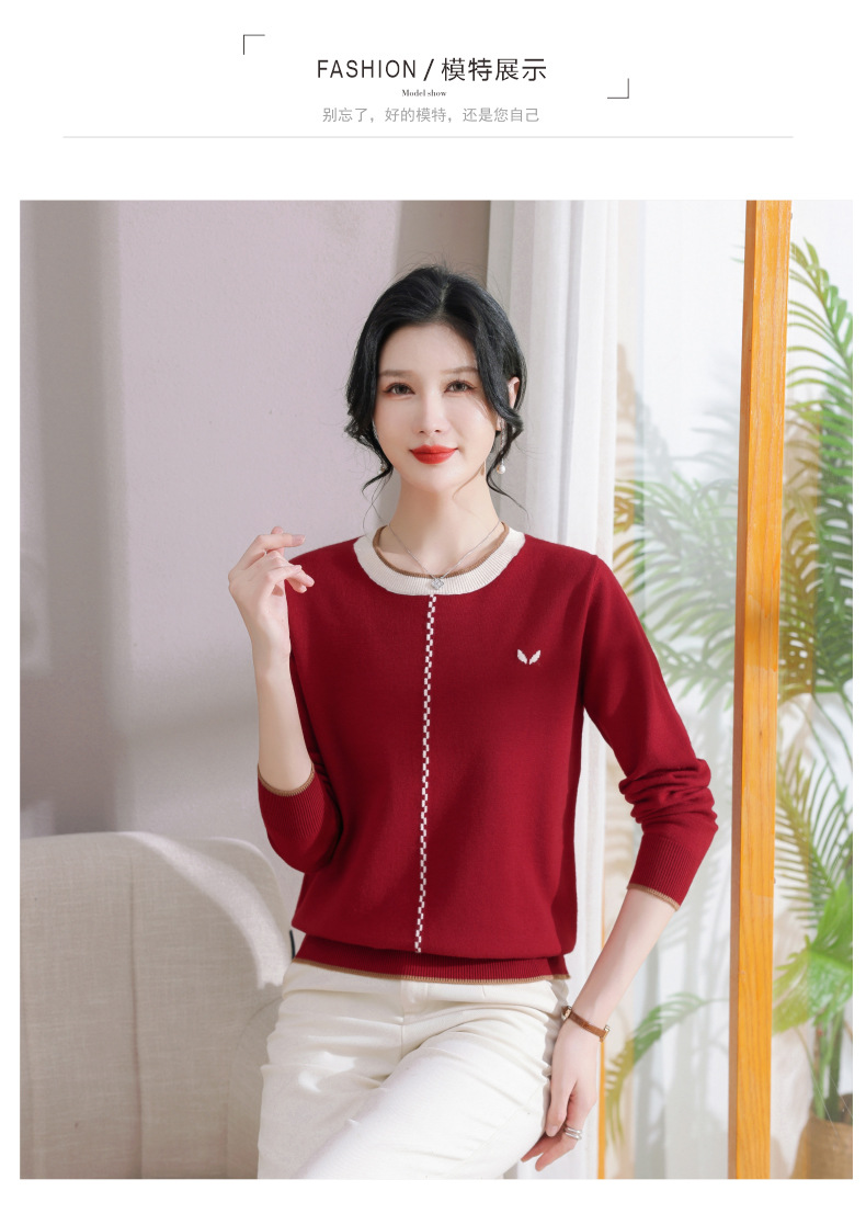 低领红色针织衫上衣春装,2024年新款妈妈薄款长袖t恤打底小衫CC-101-91270