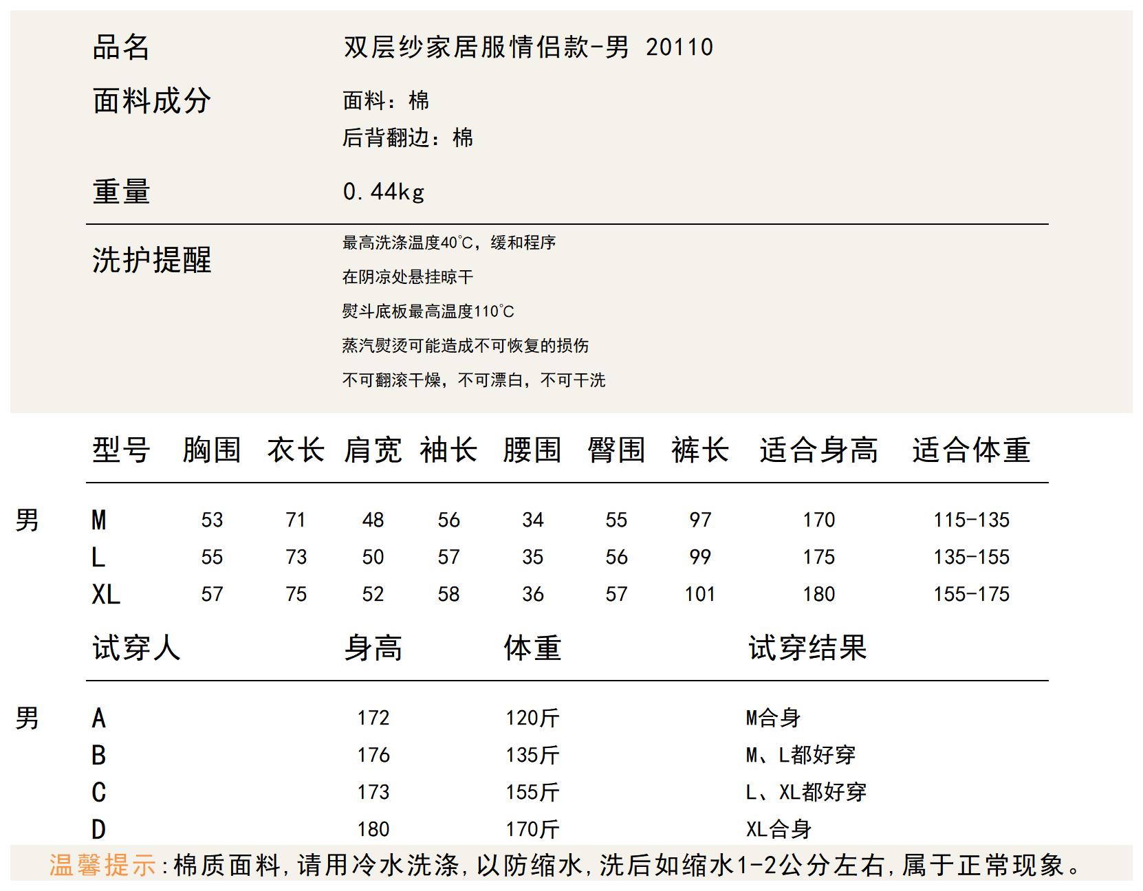 100%棉 双层纱家居服男款 A-5323