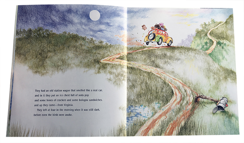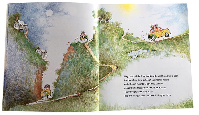 In a rainbow-colored station wagon that smelled like a real car, the relatives came. When they arrived, they hugged and hugged from the kitchen to the front room. All summer they tended the garden and ate up all the strawberries and melons. They plucked banjos and strummed guitars.When they finally had to leave, they were sad, but not for long. They all knew they would be together next summer.