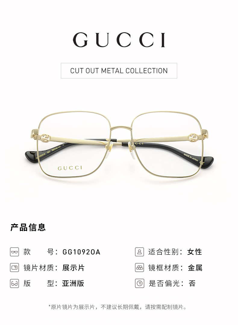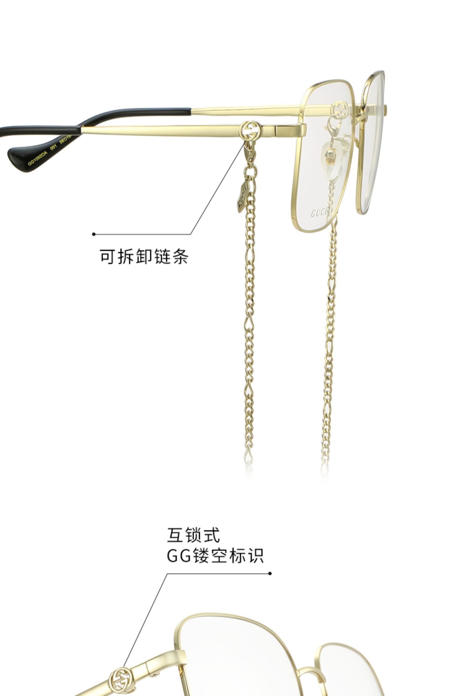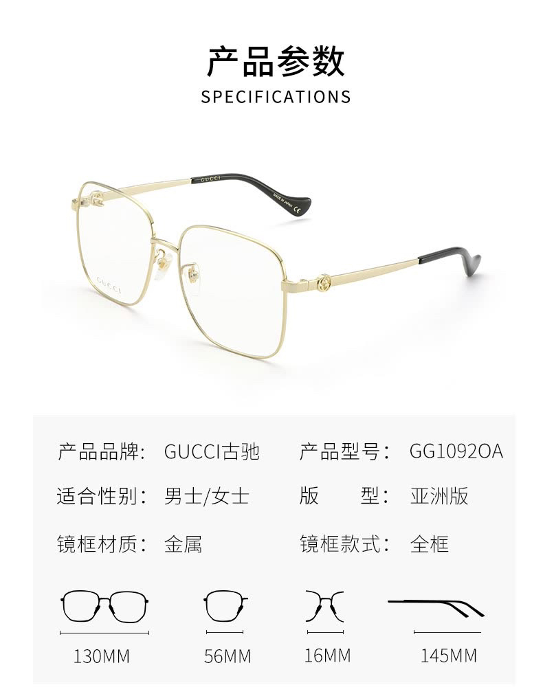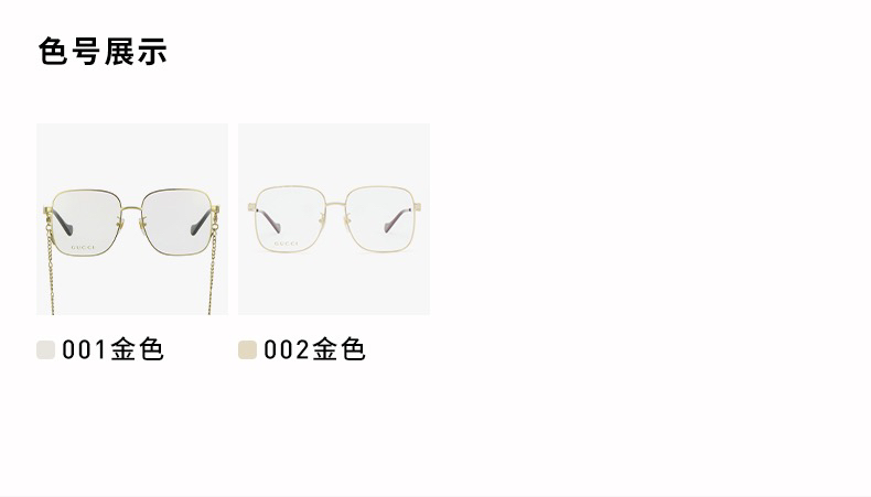 说明:2022年新款,挺火的款式。倪妮同款。001色号带链条,镜腿上有专门穿链条的孔。002色号不带链条。链条没有原装的,所以不卖001色号,只有002,形状款式没区别。没有开云眼镜的序列号,没有made in xxxx的产地印字。其他没区别。正品保真。送的眼镜盒非原装,不具品牌意义。