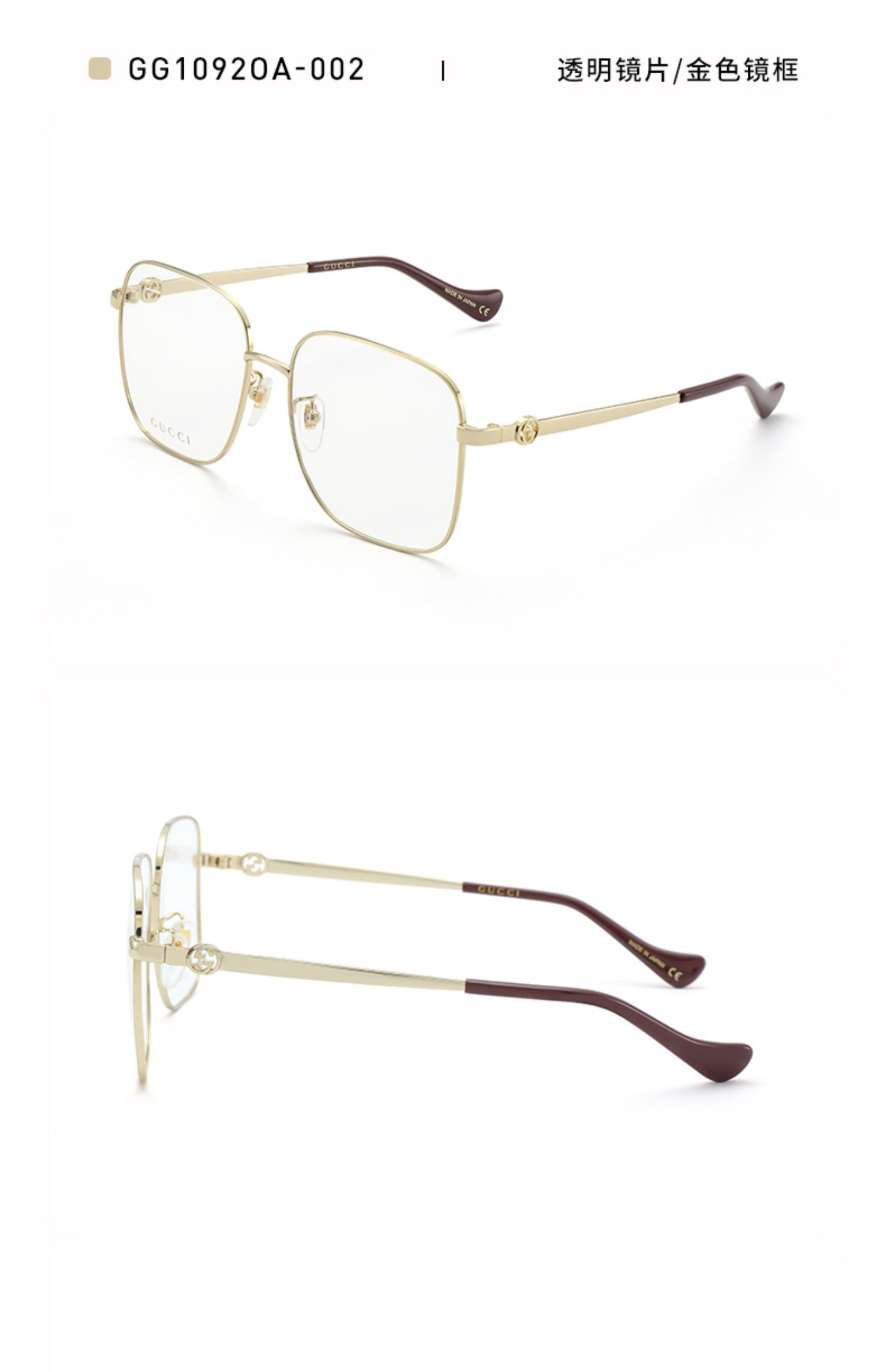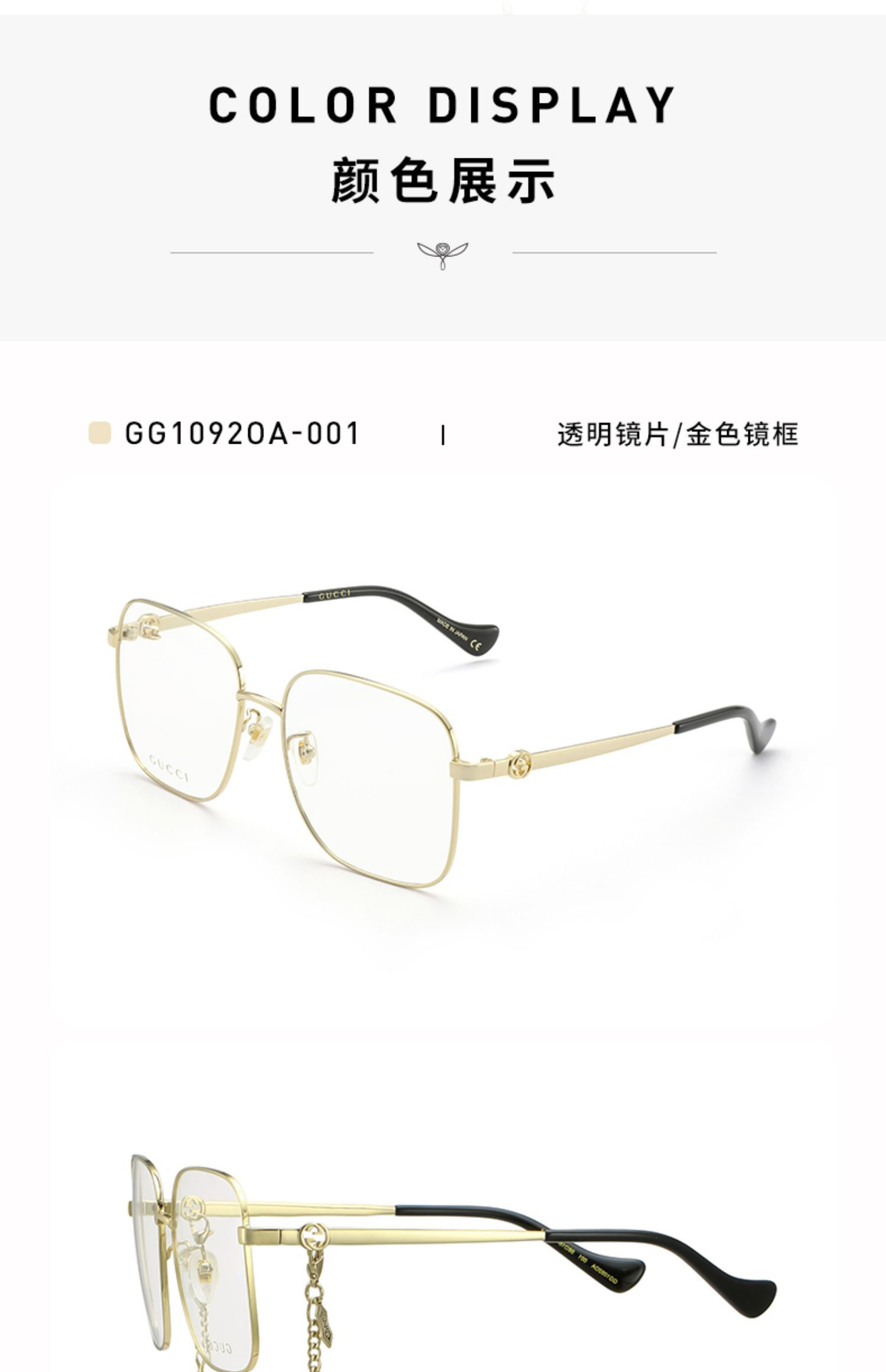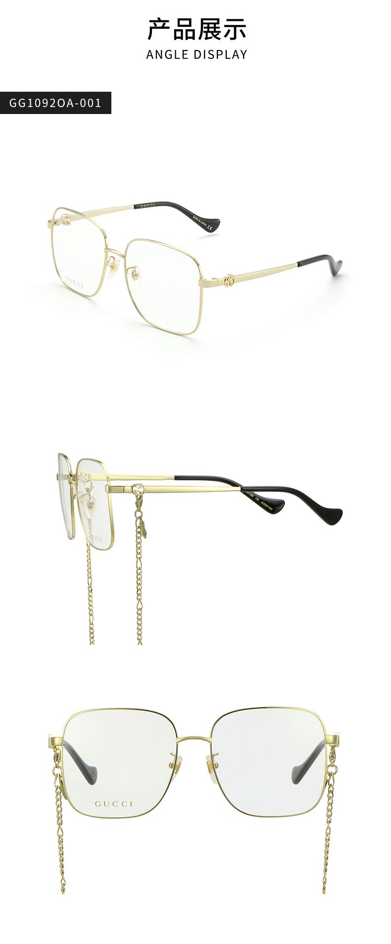说明:2022年新款,挺火的款式。倪妮同款。001色号带链条,镜腿上有专门穿链条的孔。002色号不带链条。链条没有原装的,所以不卖001色号,只有002,形状款式没区别。没有开云眼镜的序列号,没有made in xxxx的产地印字。其他没区别。正品保真。送的眼镜盒非原装,不具品牌意义。