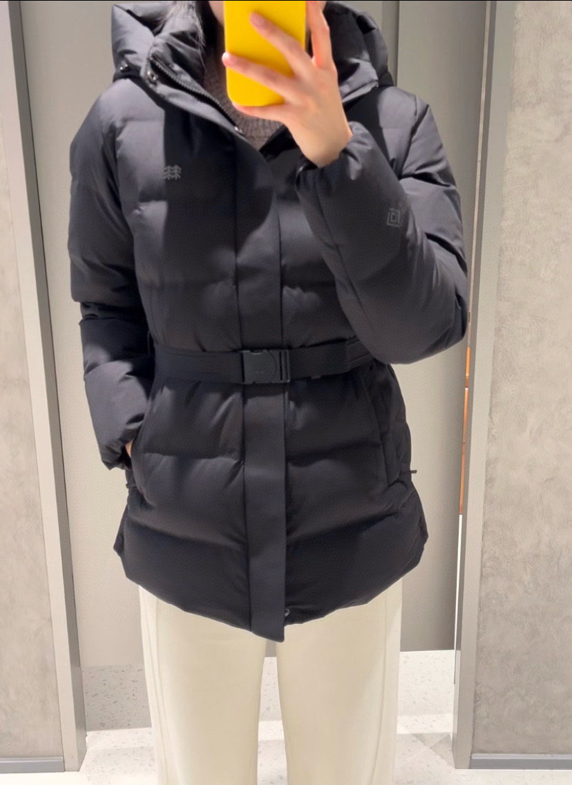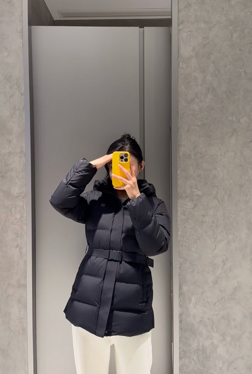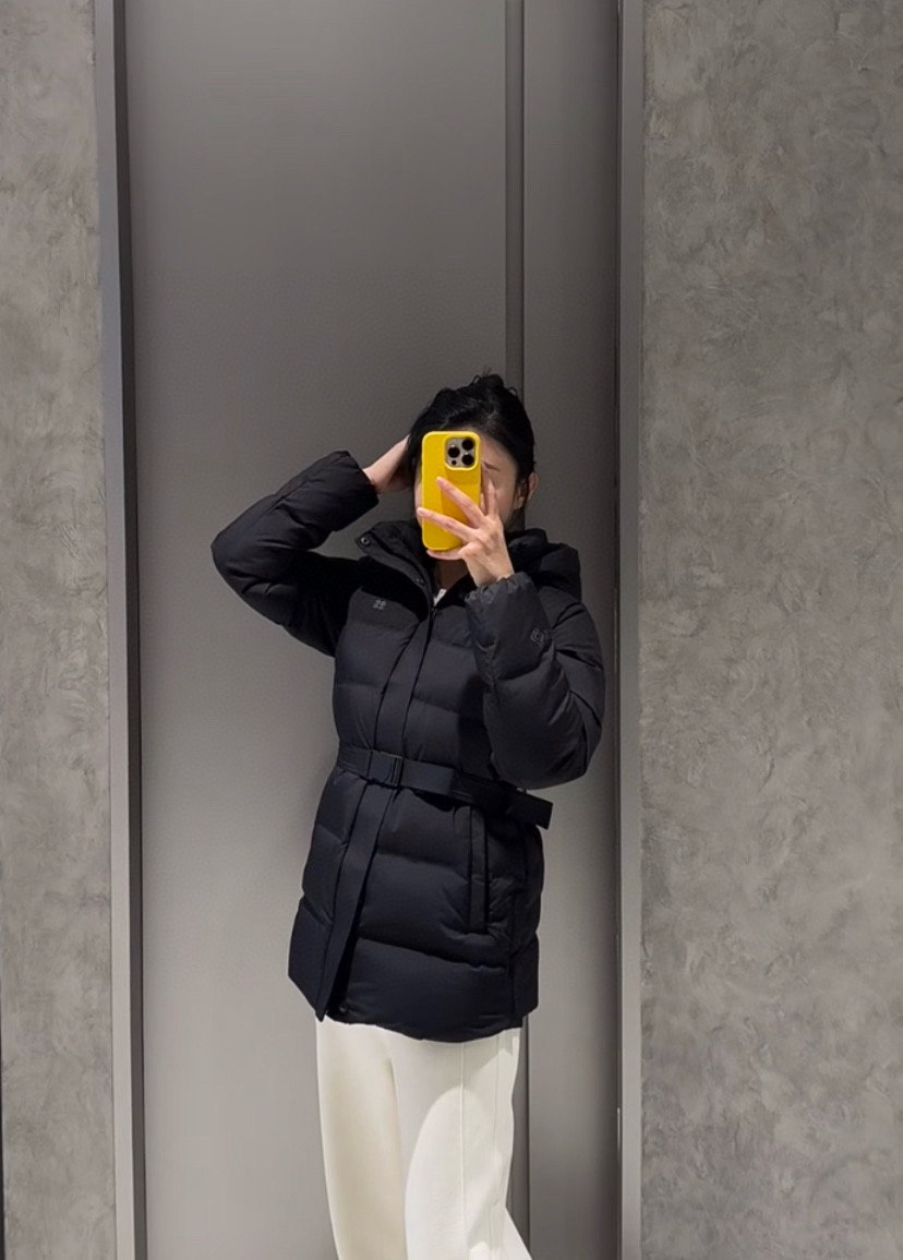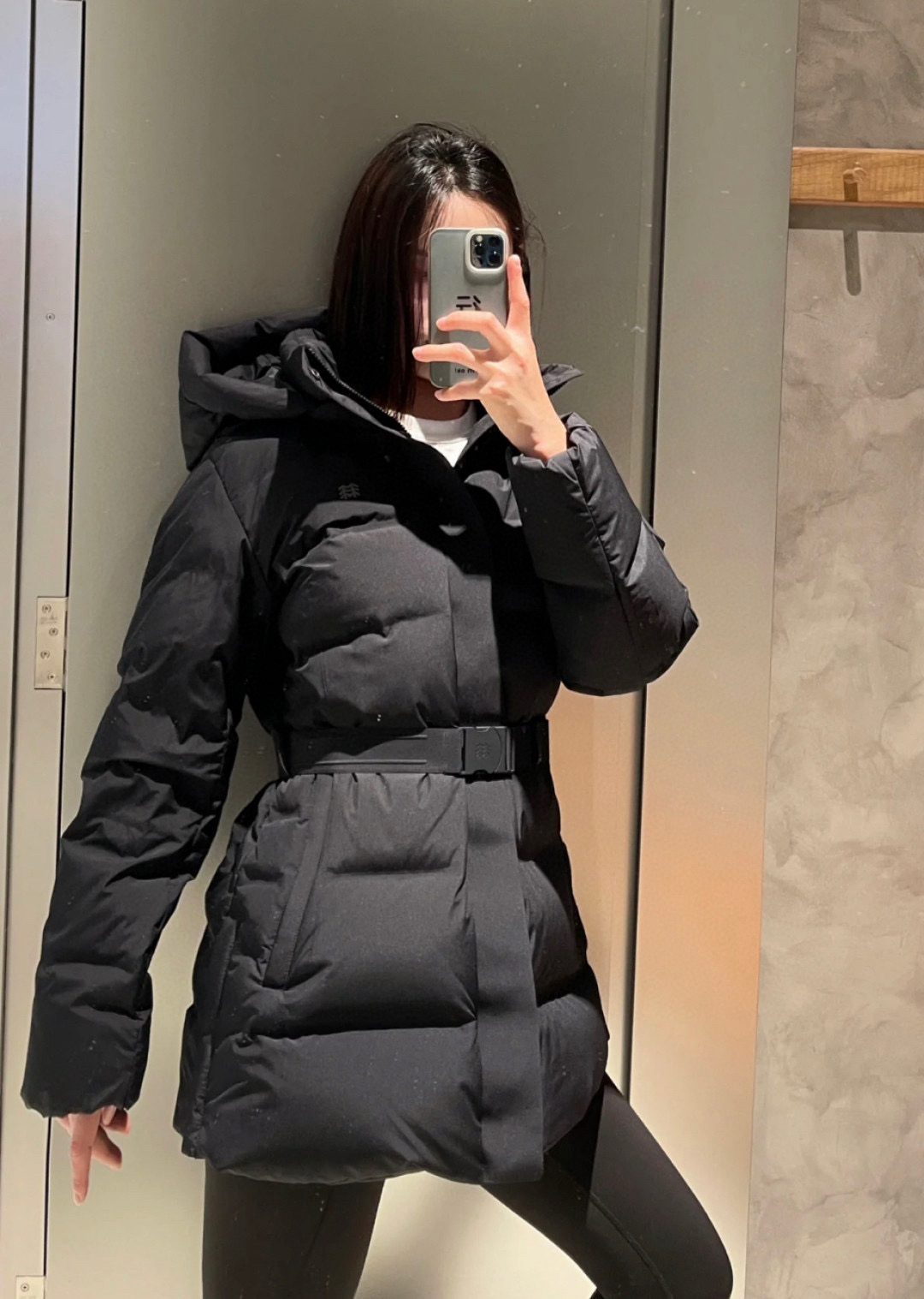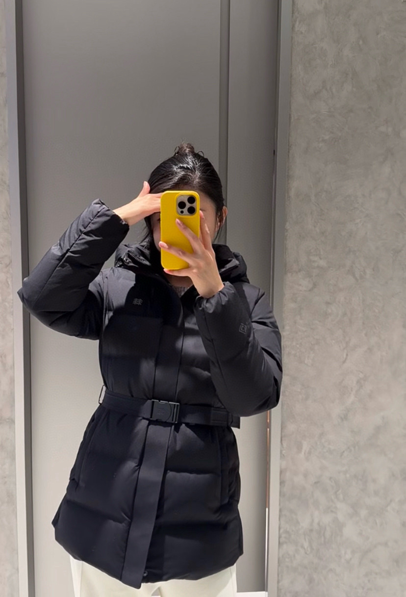 少量补到货 韩国单 纯圆正 两颗树 防风挡雨透气不钻绒 女士腰带连帽鹅绒 羽绒服 可户外可日常 只有黑色