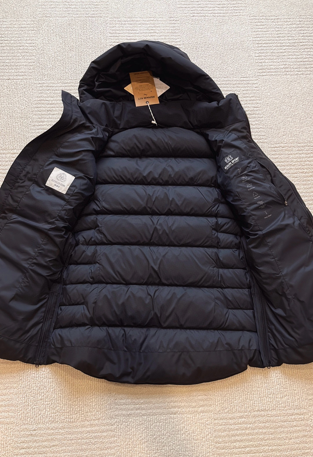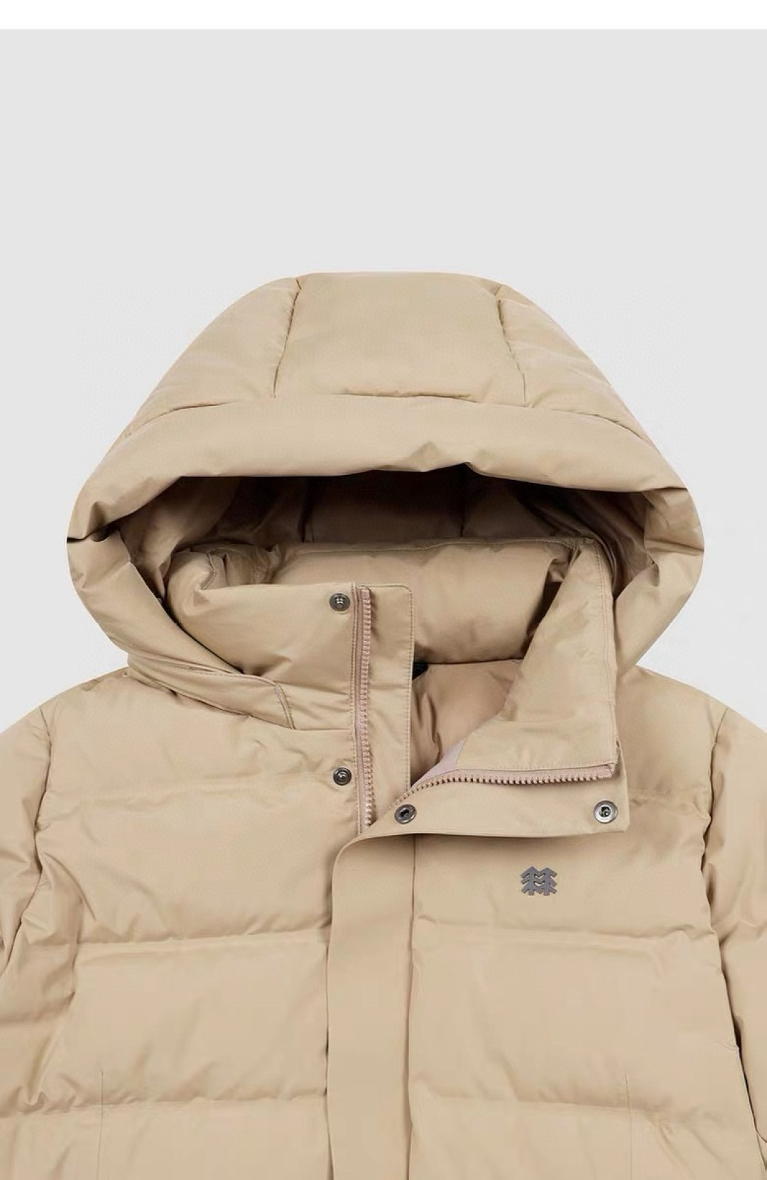 轻盈保暖的鹅绒填充,整个大连帽都是鹅绒,完全不厚重臃肿,但轻盈保暖。拉链可以上下调节,腰带可以拆卸。