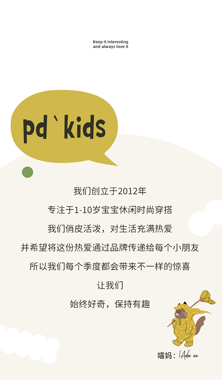 Purrfect-Diary专注于贴近自然随性的穿着概念,轻奢平价的童装文化传播,在产品设计上更加注重婴童穿着的舒适性、安全性、更出众的国际化品牌,将欧美的育婴文化在中国进行深入的传播与推广。