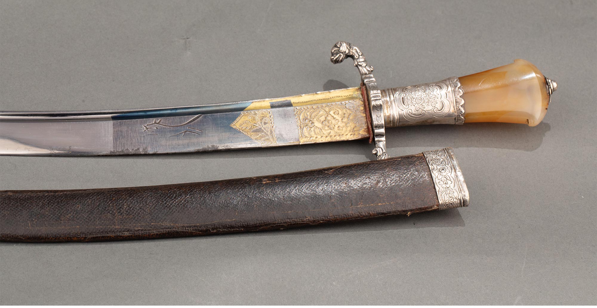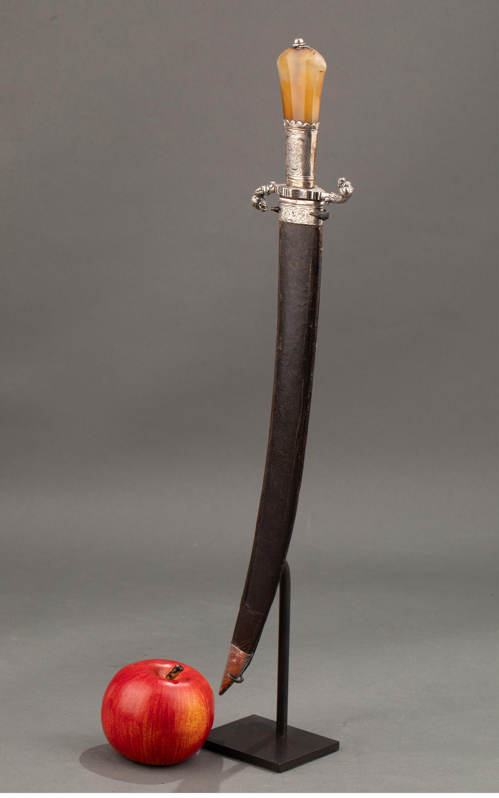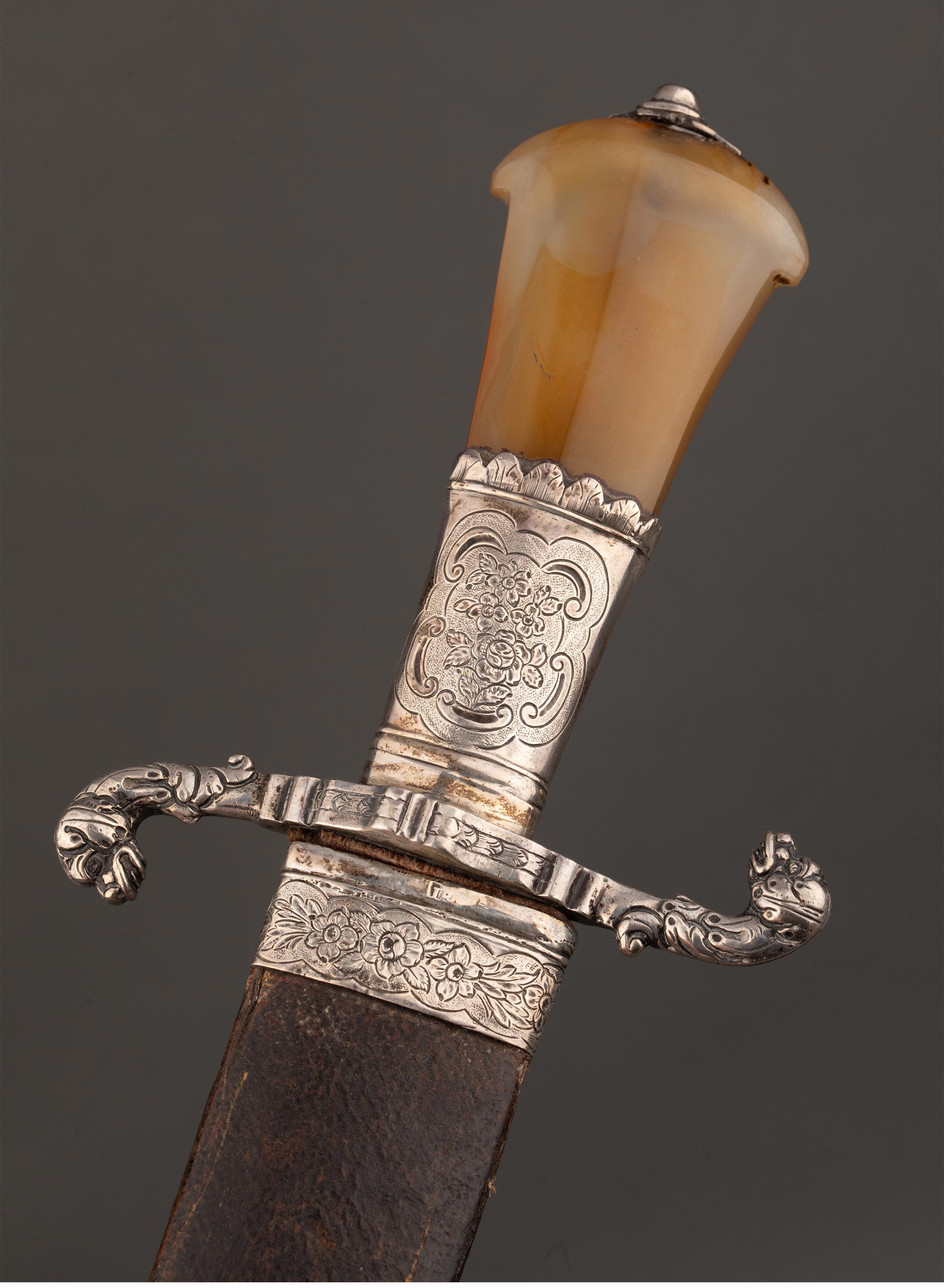 1700年代英国出品皮革刀鞘犬首花卉主题纯银精雕嵌玛瑙刀柄装饰卷叶纹镀金钢制刀刃狩猎弯刀