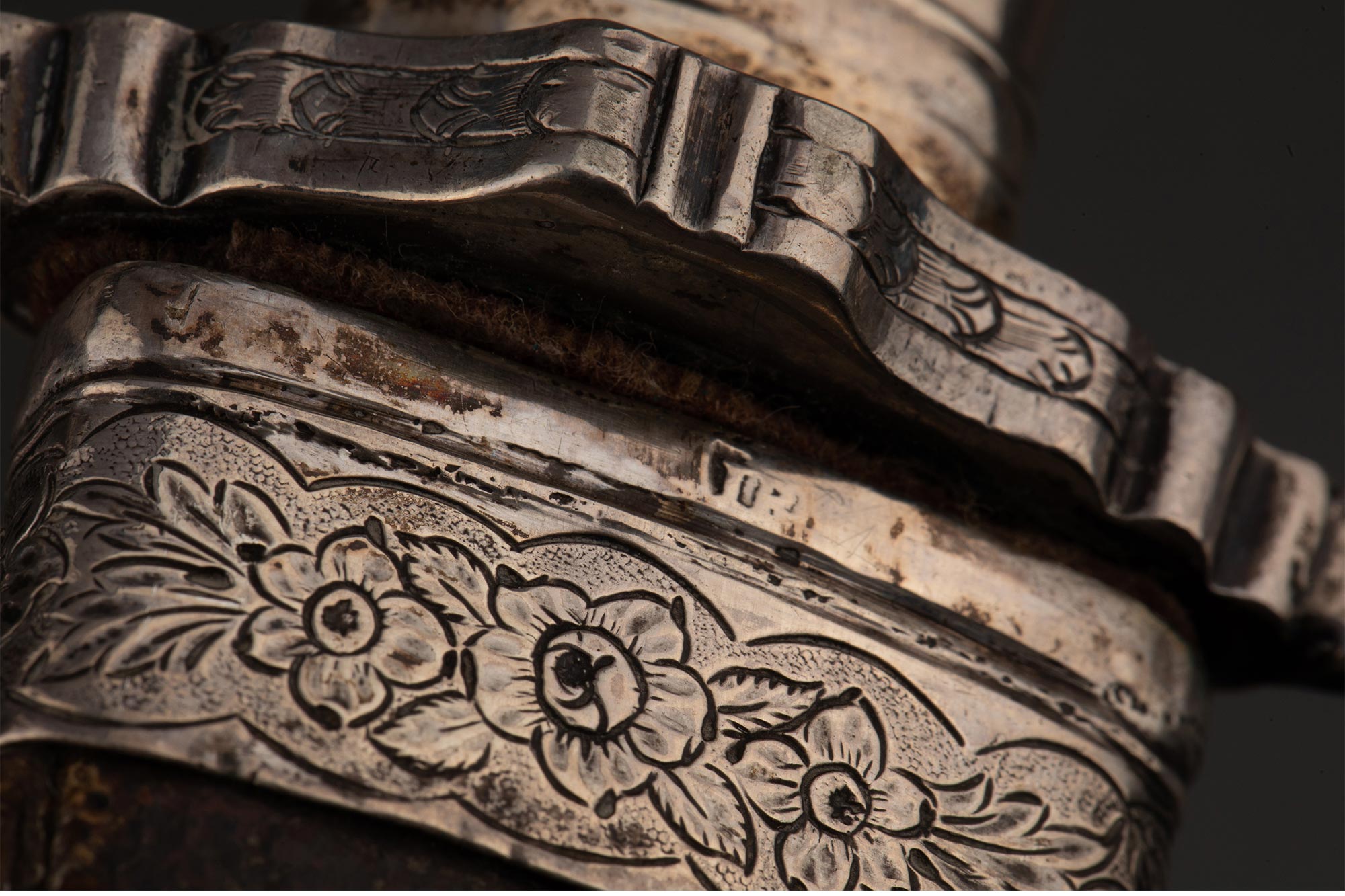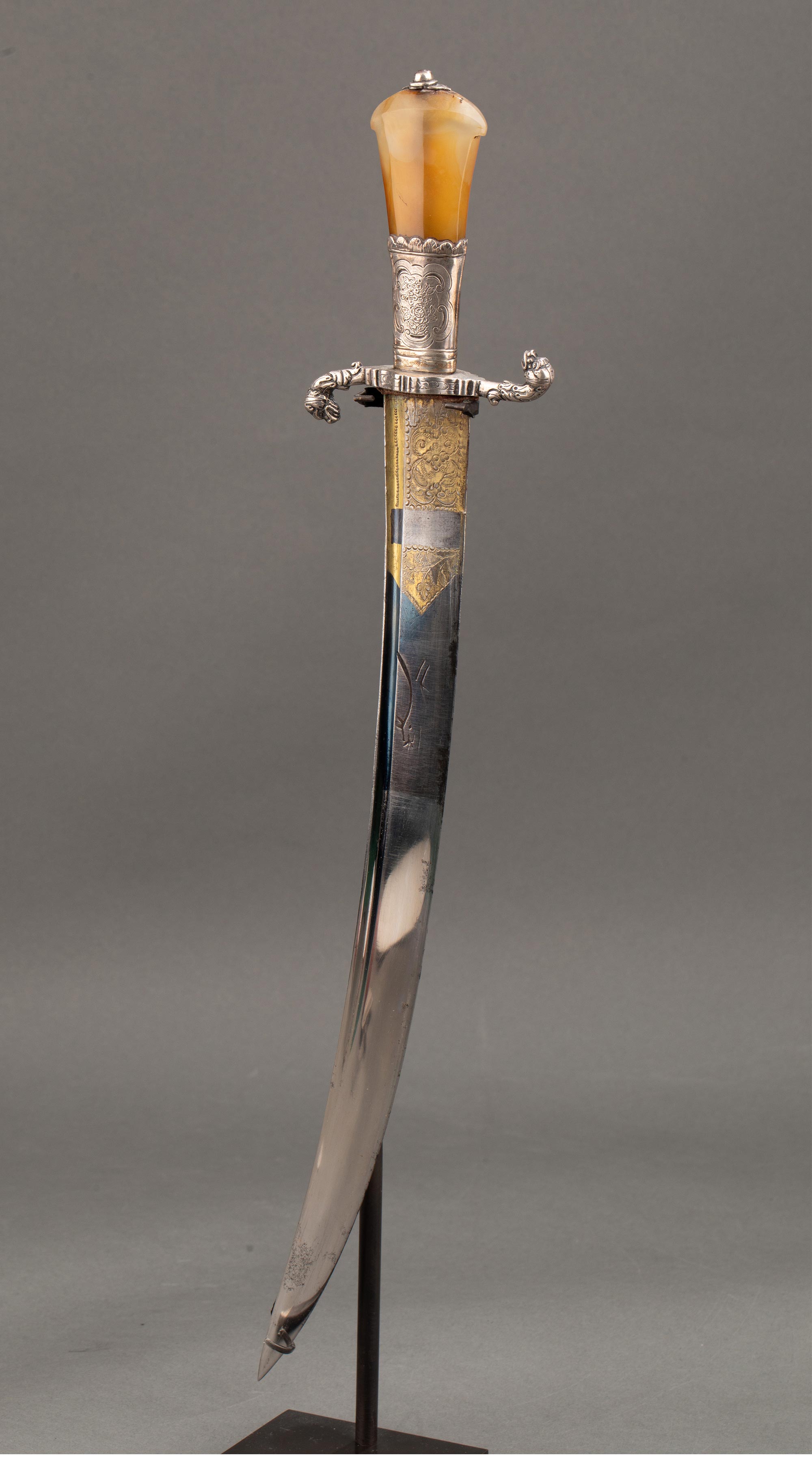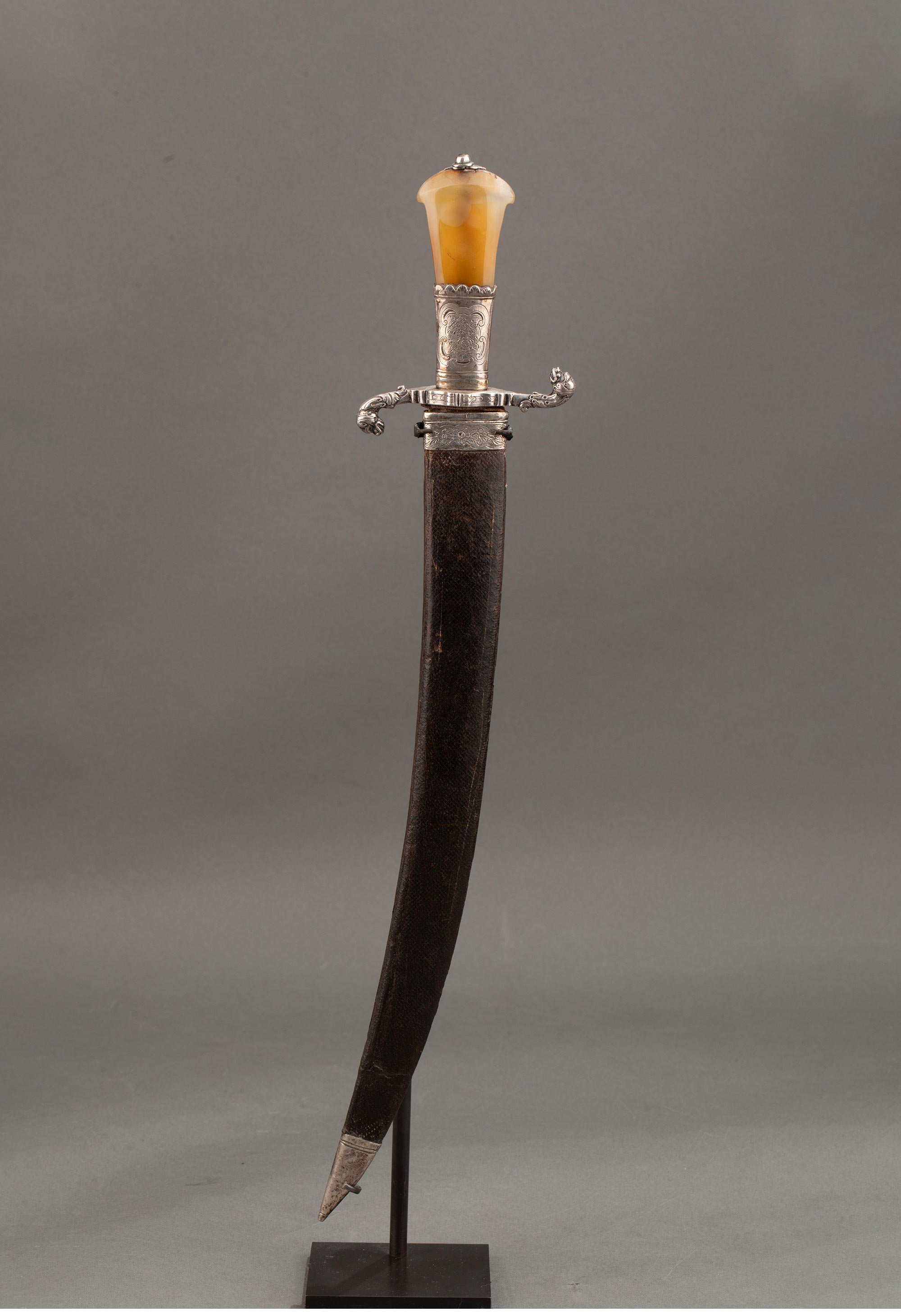 1700年代英国出品皮革刀鞘犬首花卉主题纯银精雕嵌玛瑙刀柄装饰卷叶纹镀金钢制刀刃狩猎弯刀