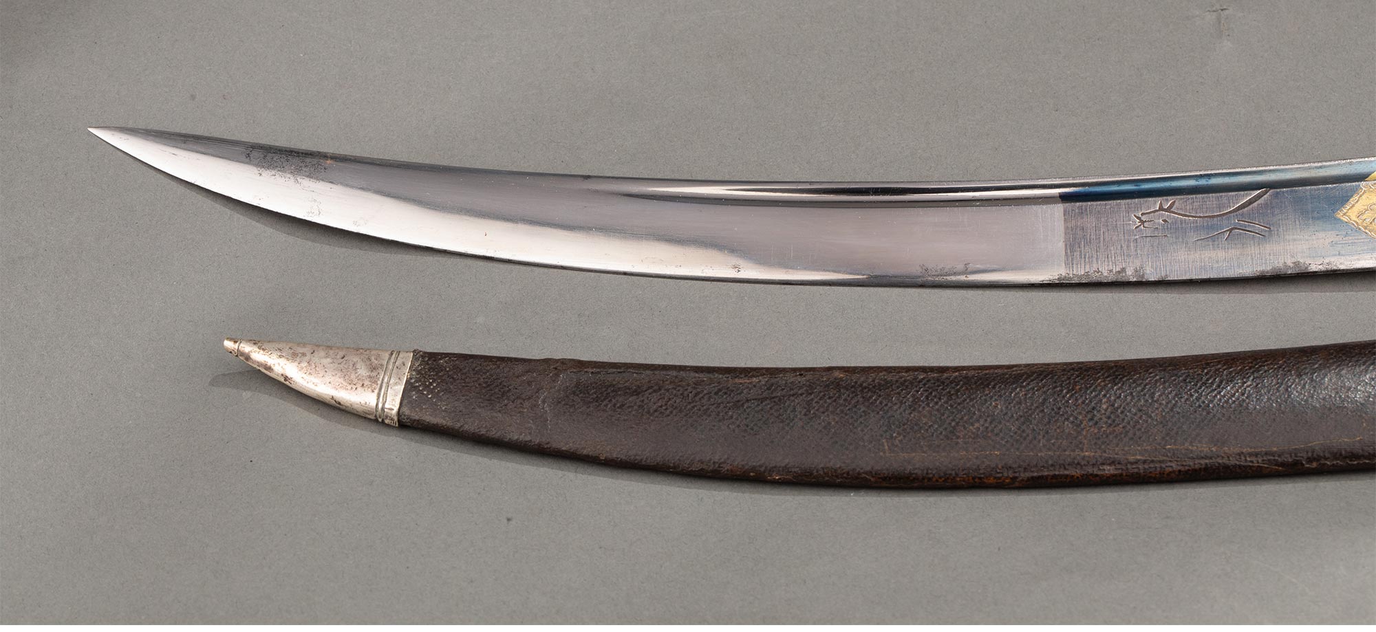 独角鹿西洋古董英国出品皮革刀鞘犬首花卉主题纯银精雕嵌玛瑙刀柄装饰卷叶纹镀金钢制刀刃狩猎弯刀【未开刃】