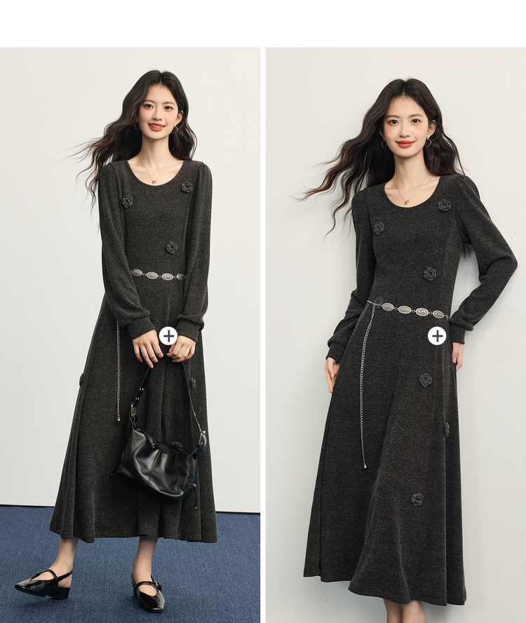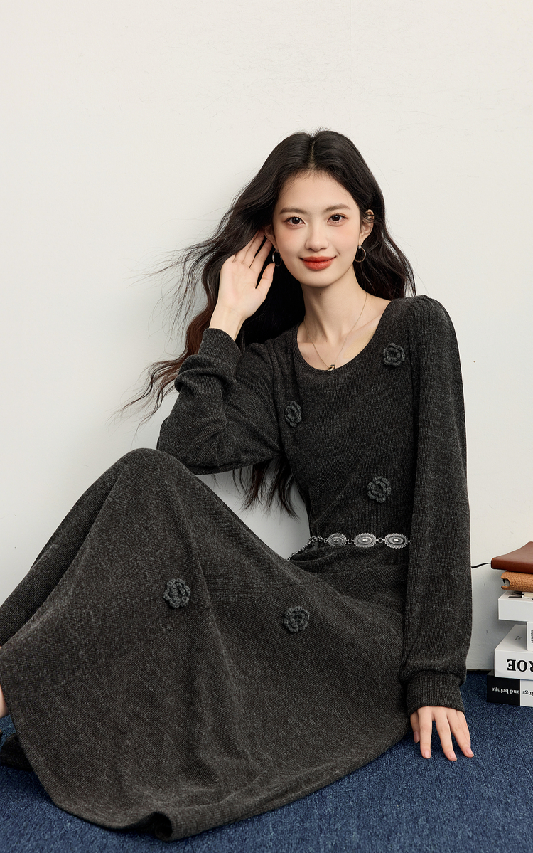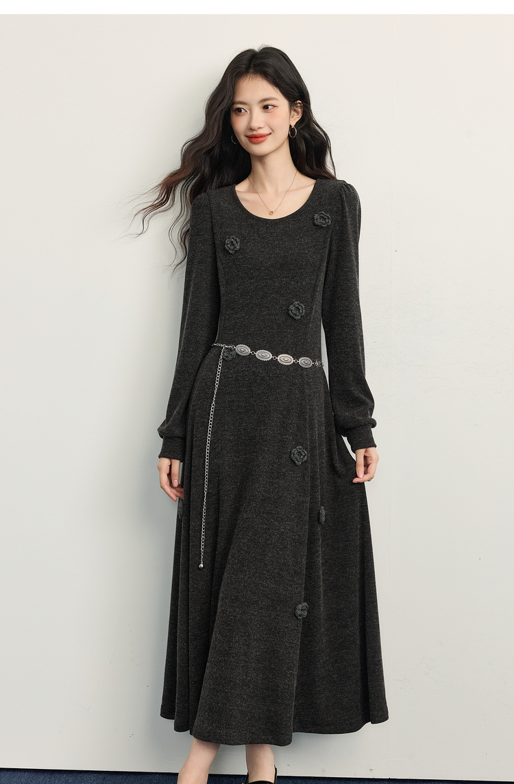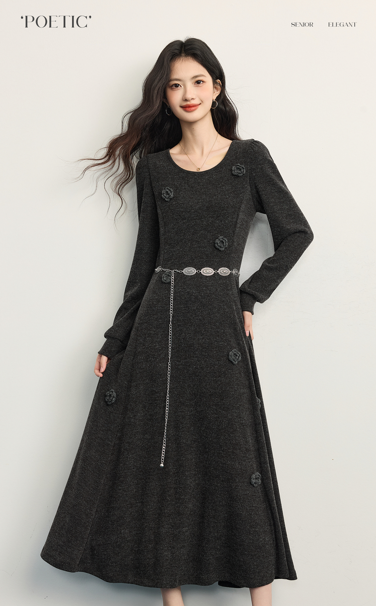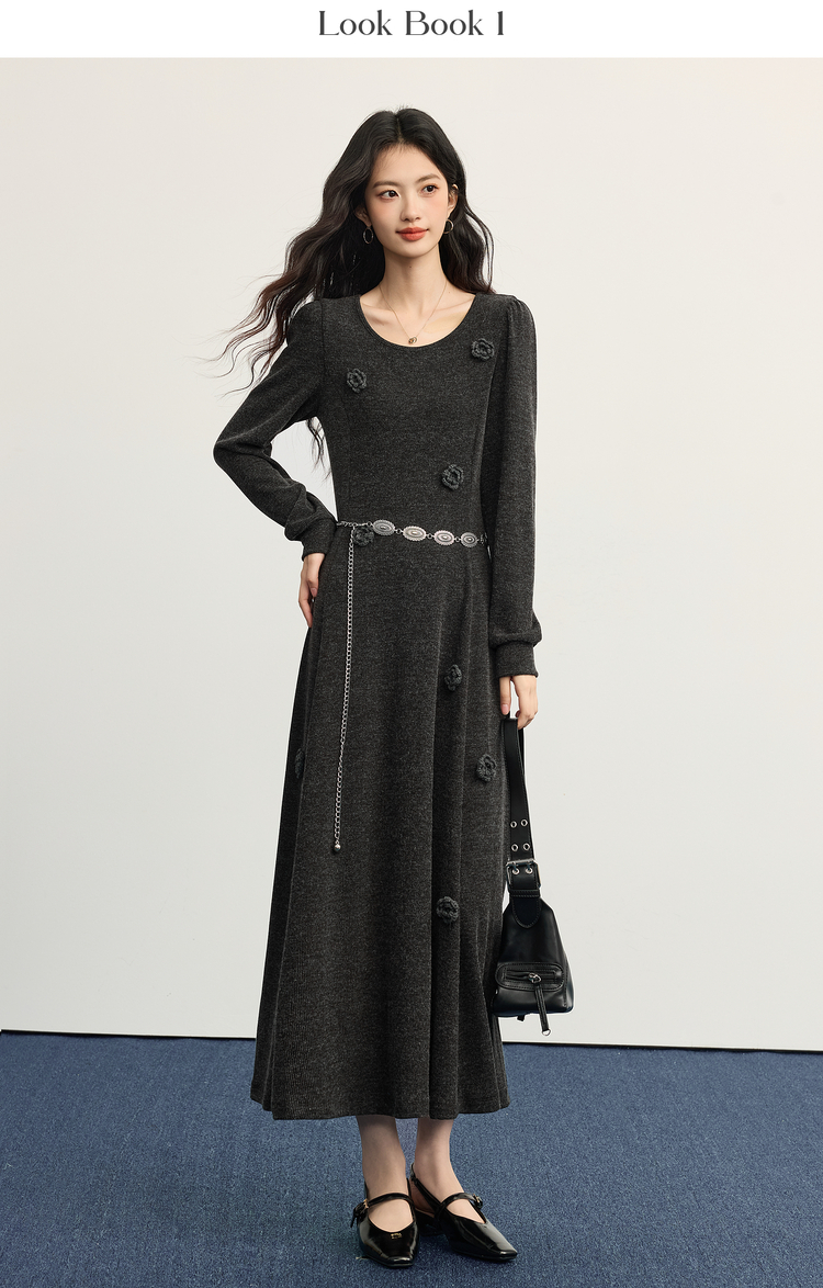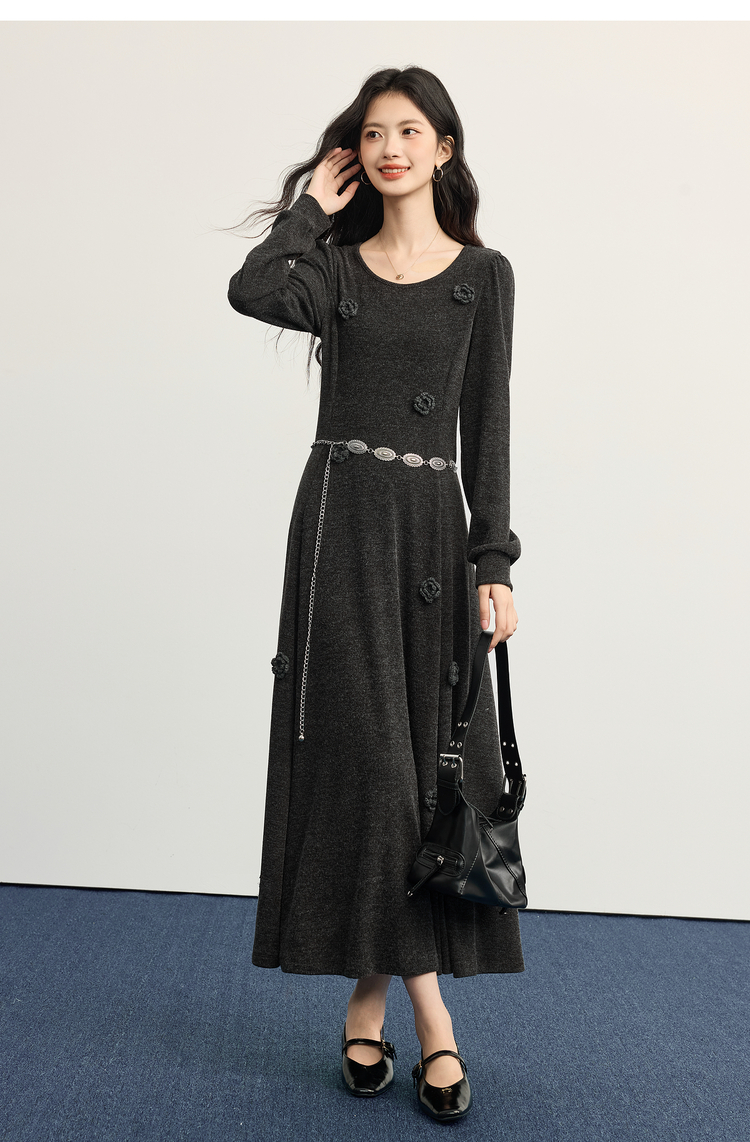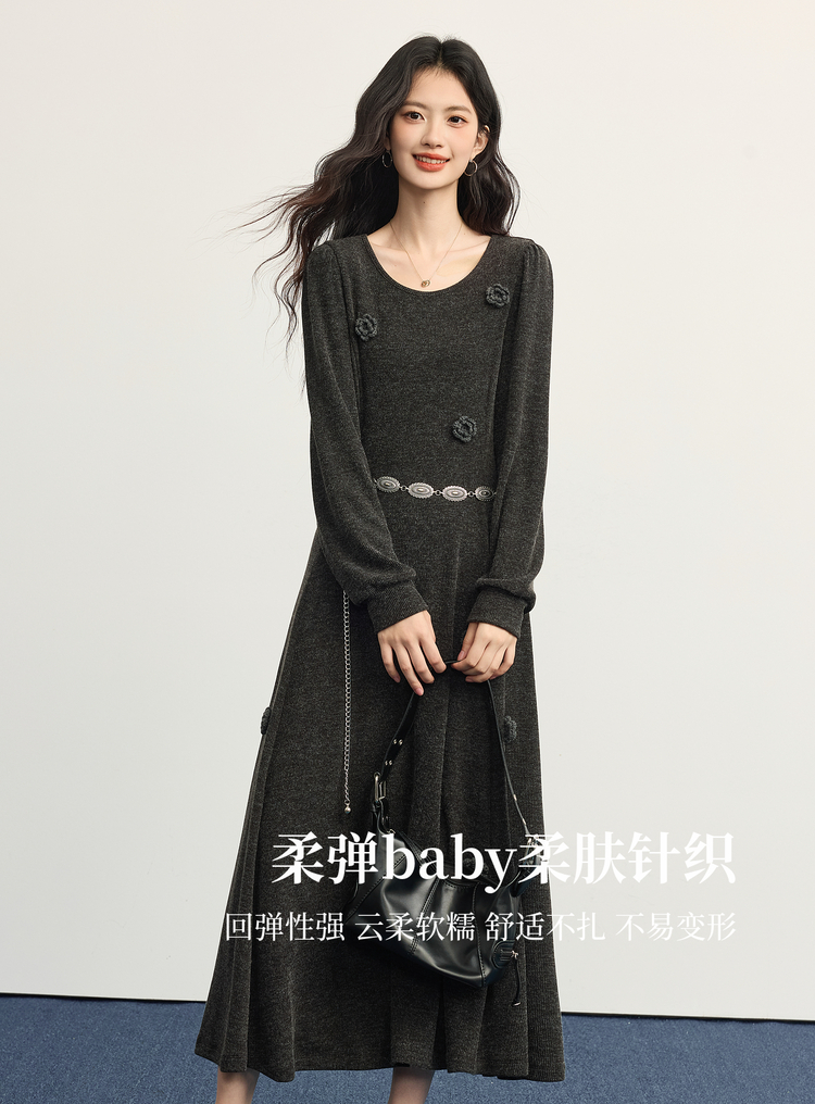 【10/23新品】熙世界高级感灰色立体花朵针织连衣裙女2025新款冬天配大衣的裙子