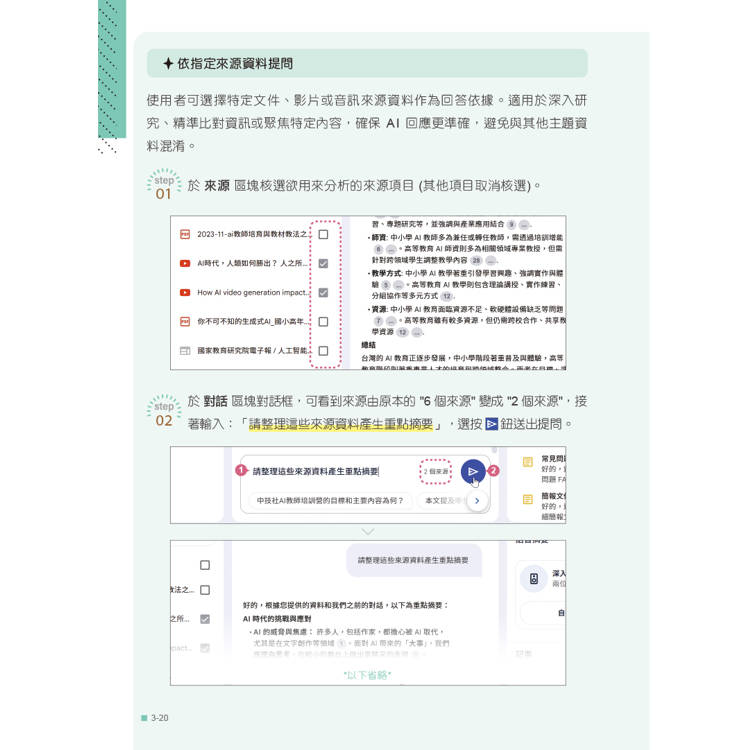 ‧建立專屬 AI 知識庫,了解精準提問獲取回覆的關鍵方式,輕鬆整理筆記內容。