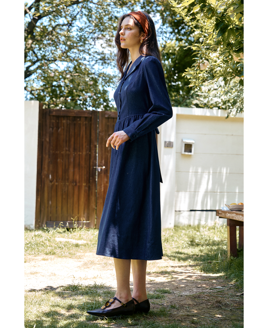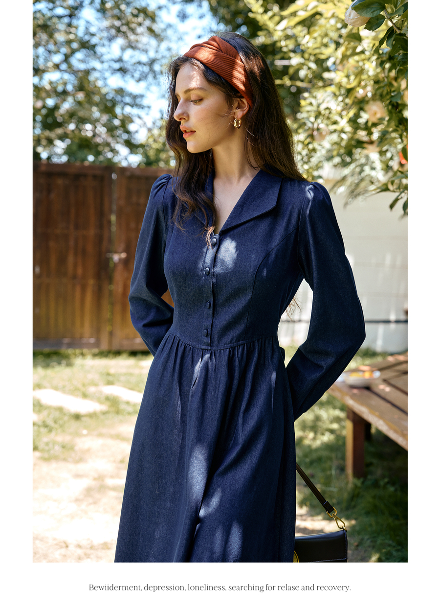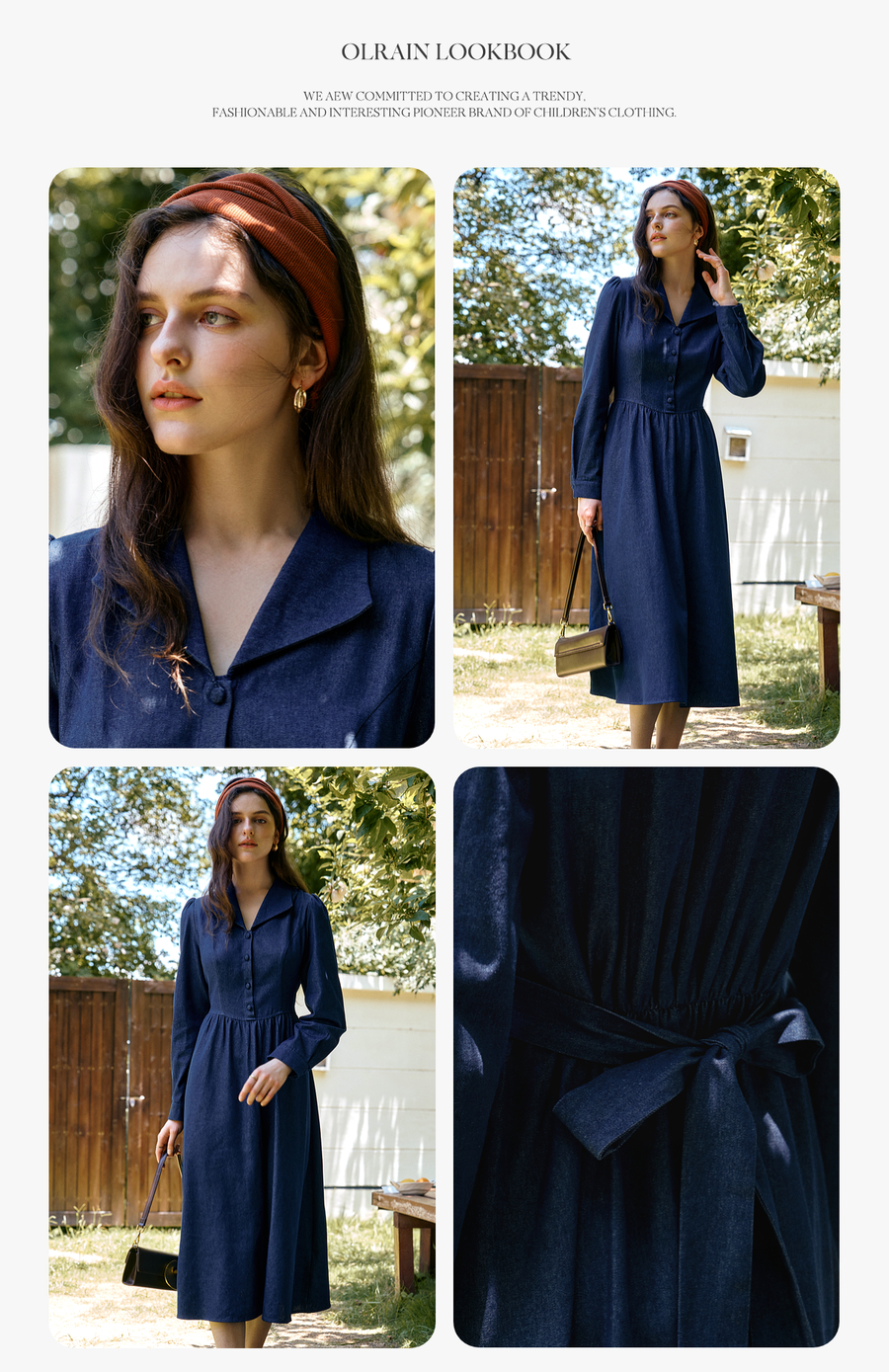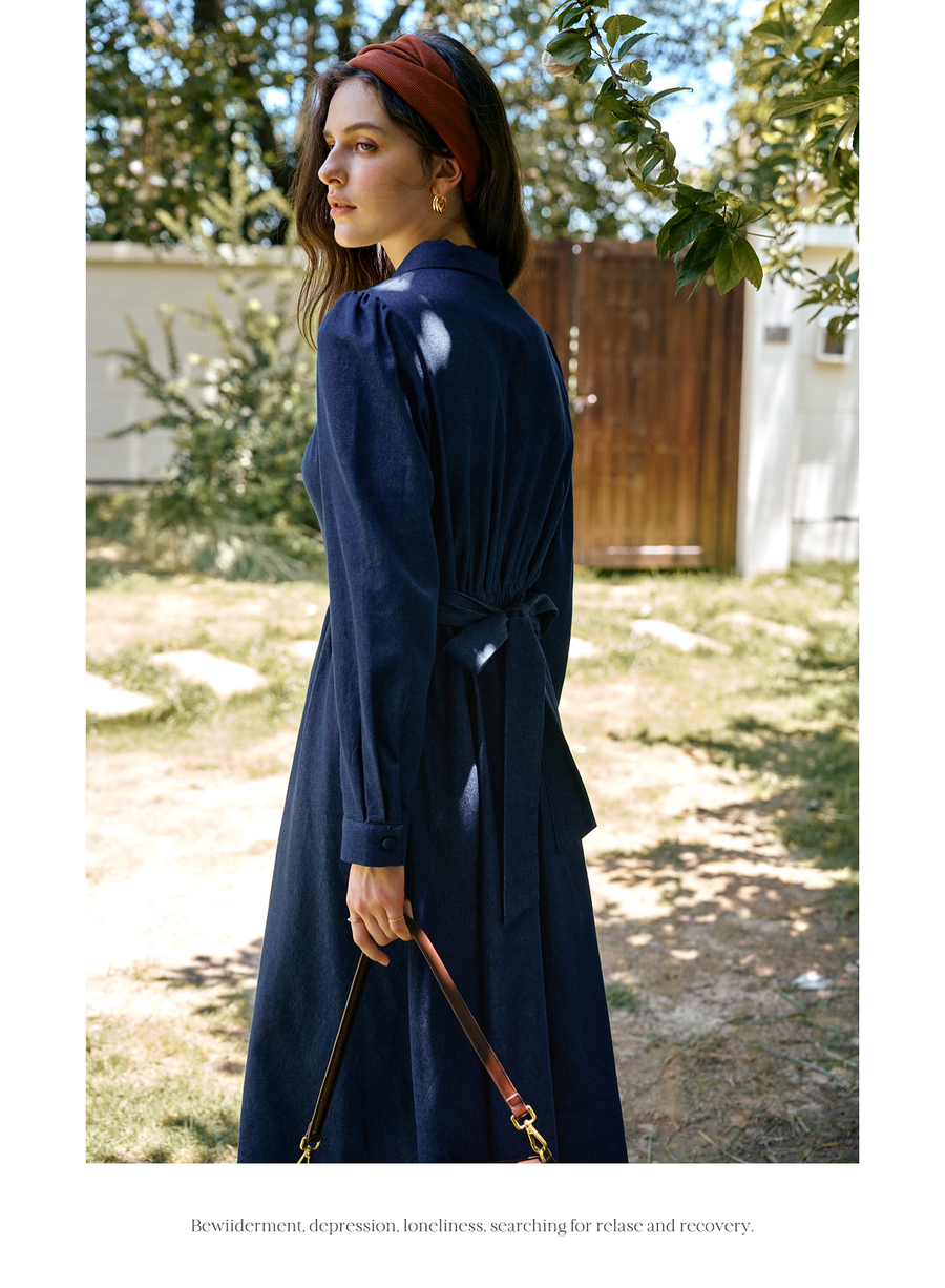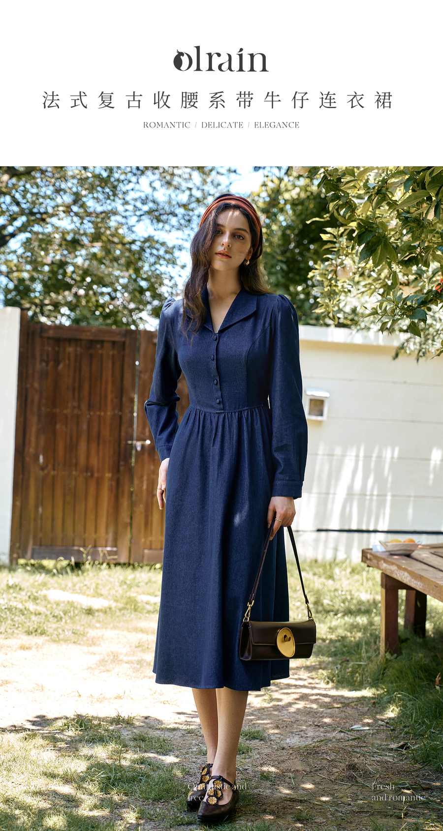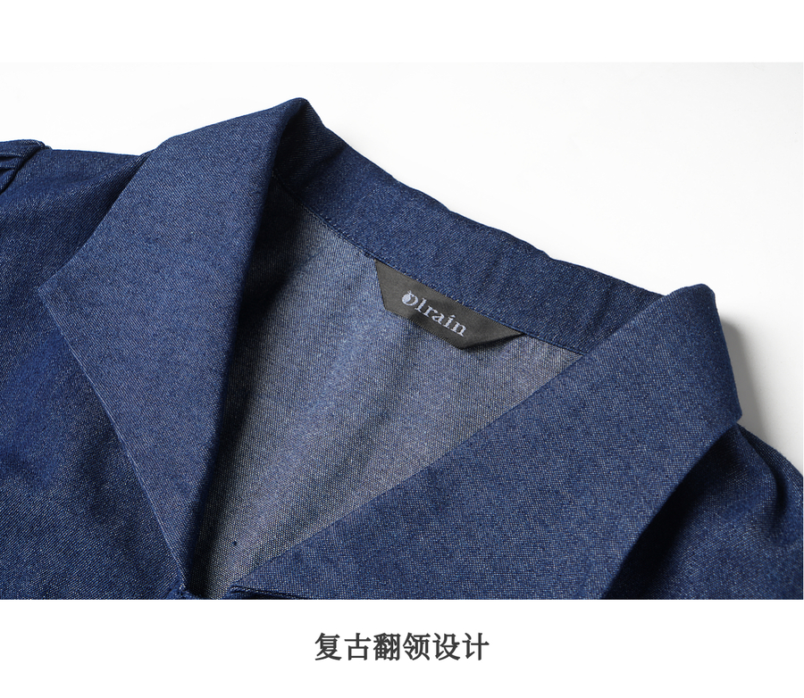 OLrain欧芮儿2025新款女秋季法式蓝色复古收腰系带翻领牛仔连衣裙