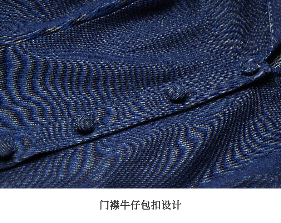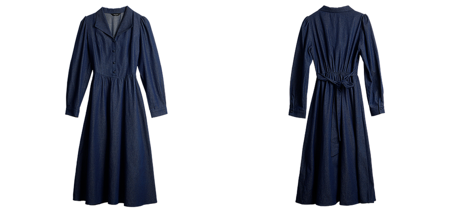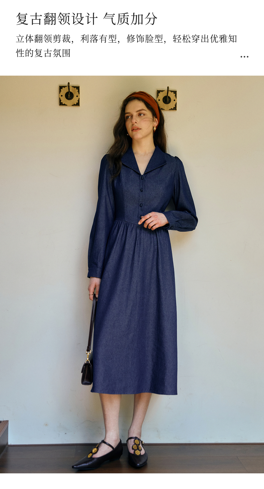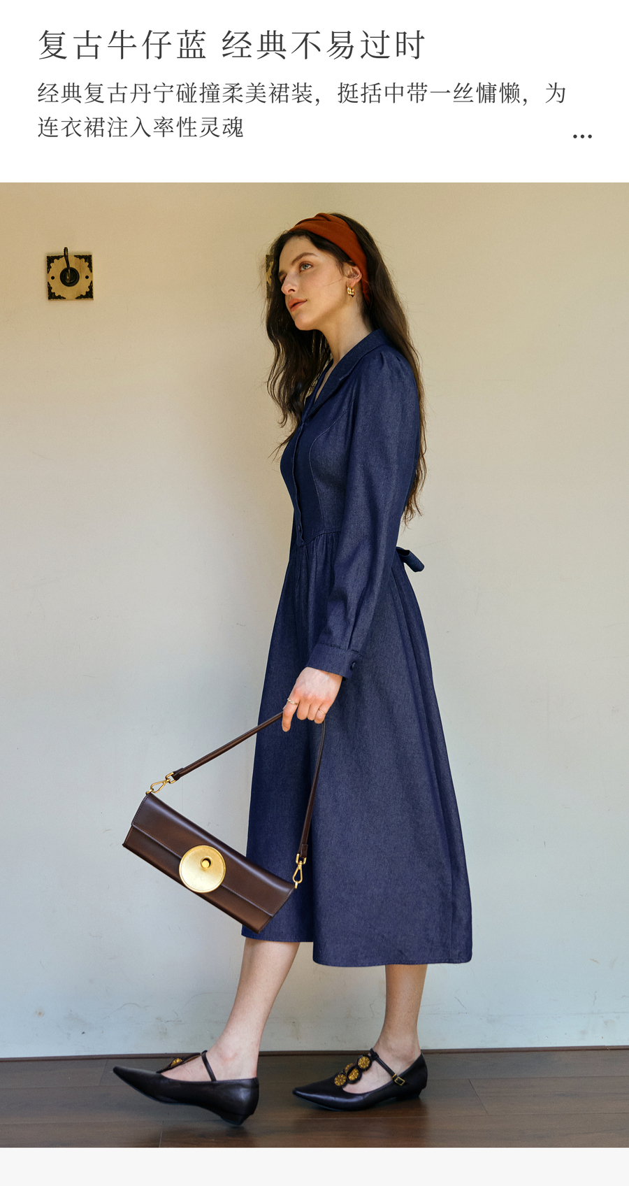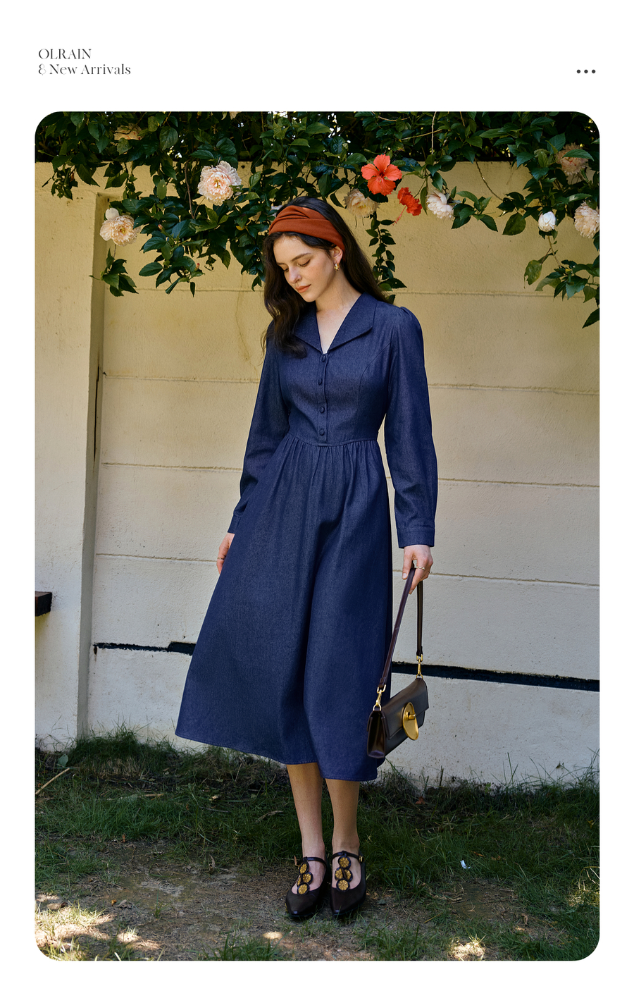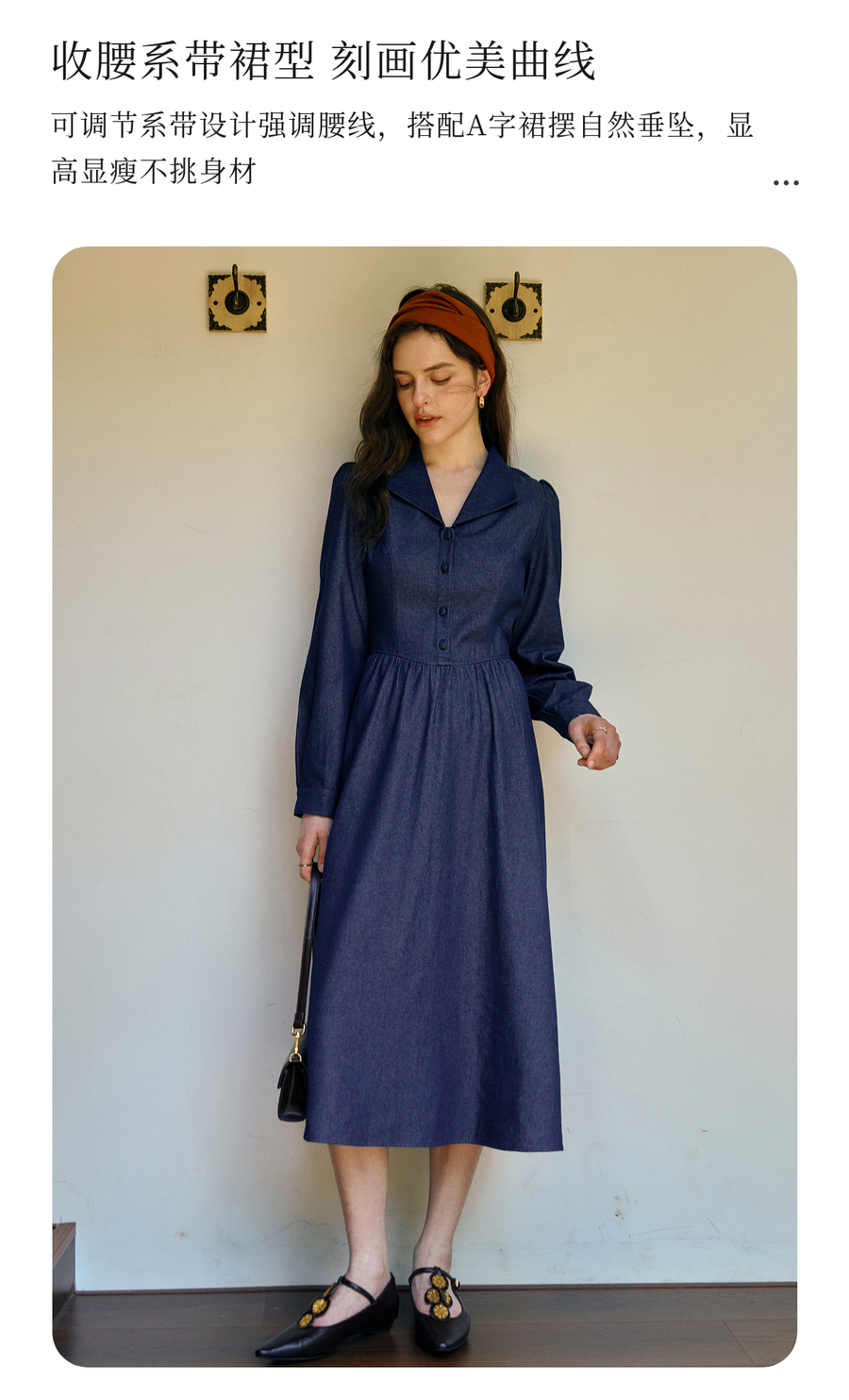 OLrain欧芮儿2025新款女秋季法式蓝色复古收腰系带翻领牛仔连衣裙