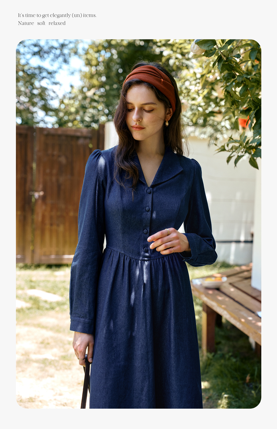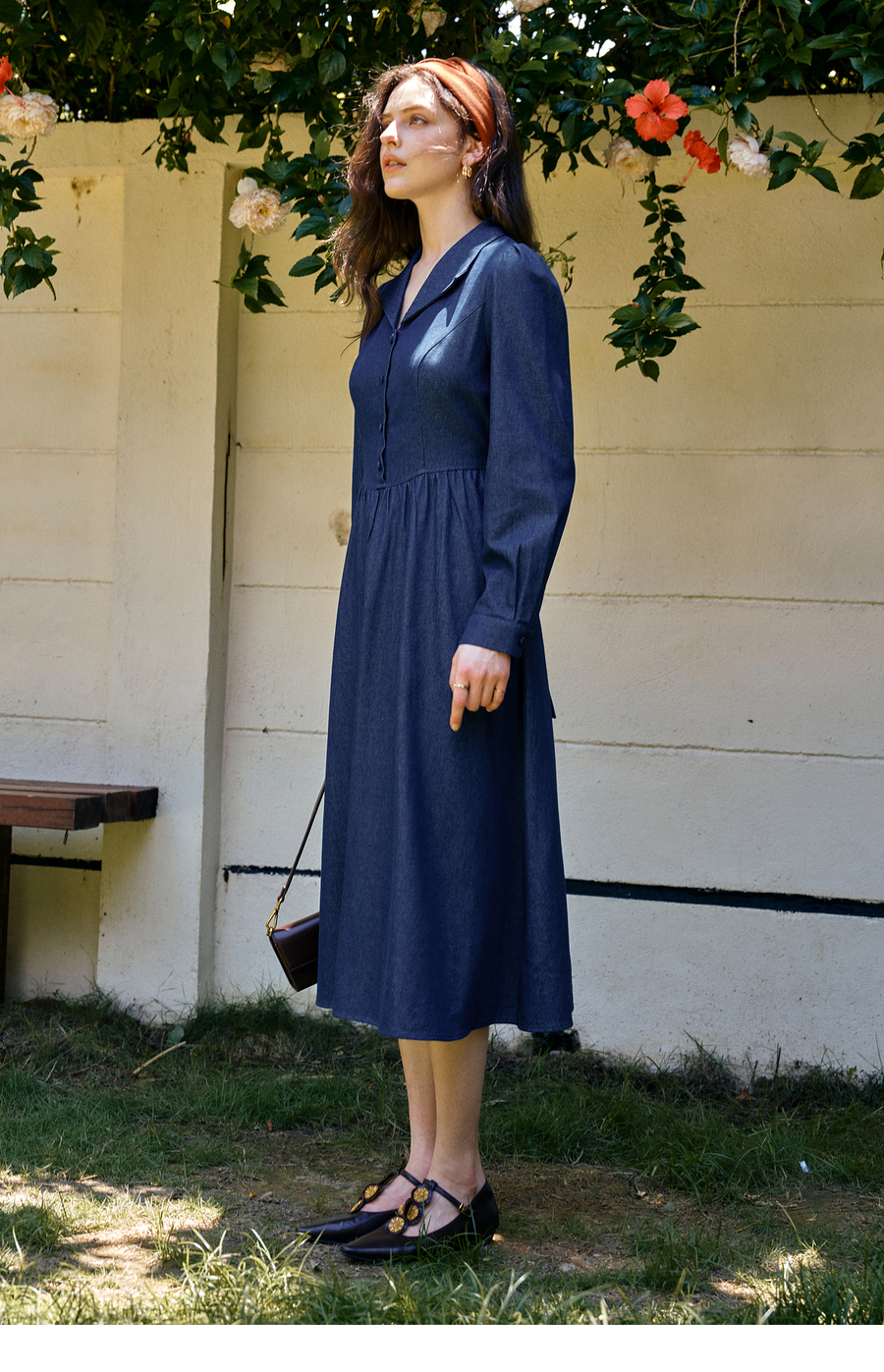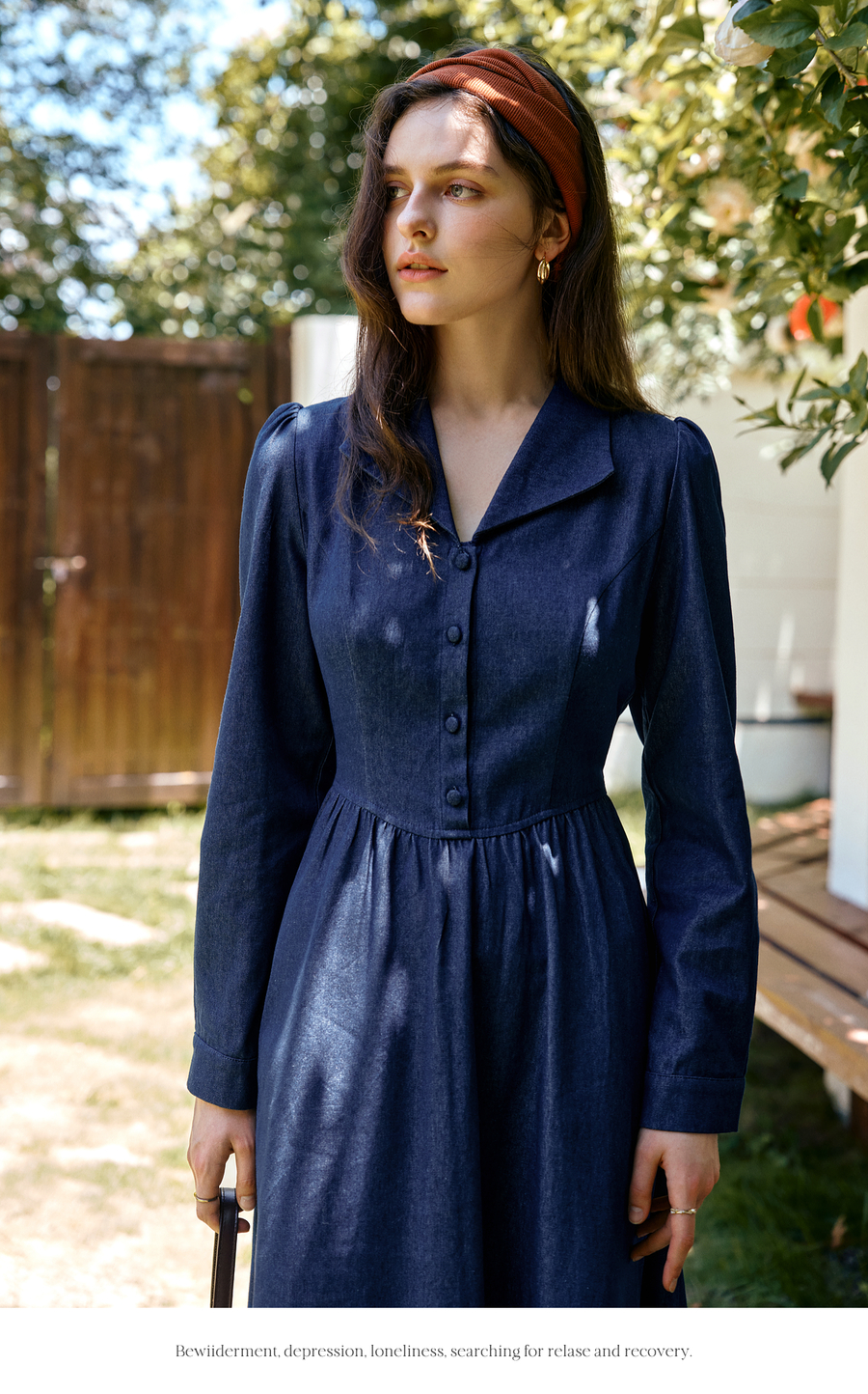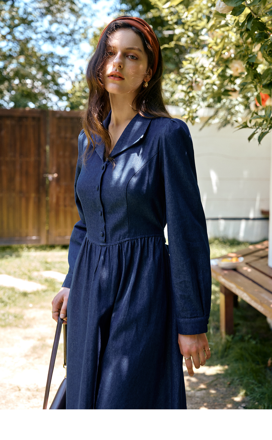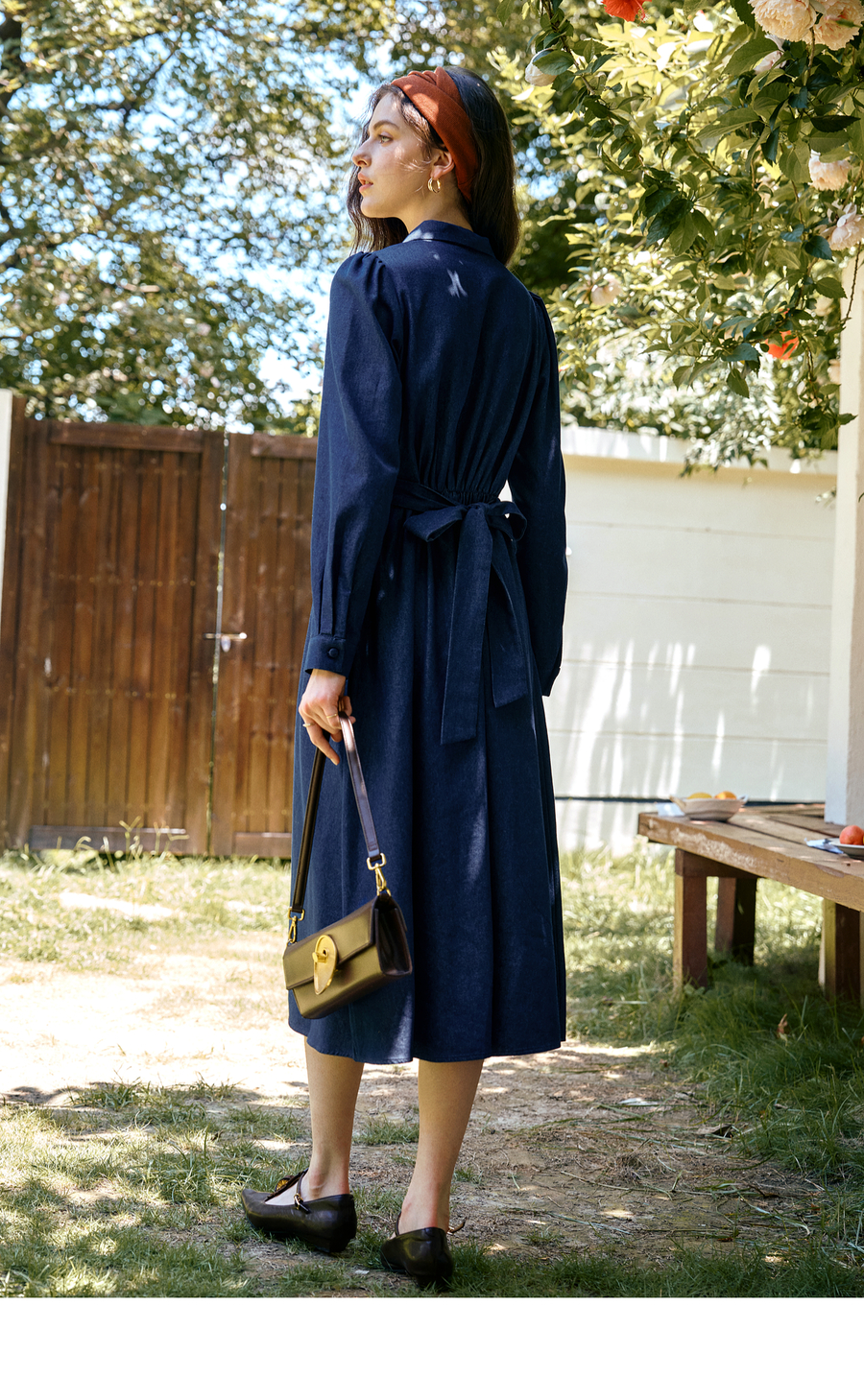 OLrain欧芮儿2025新款女秋季法式蓝色复古收腰系带翻领牛仔连衣裙