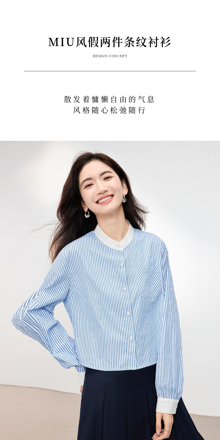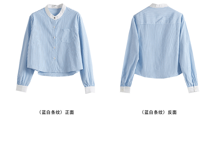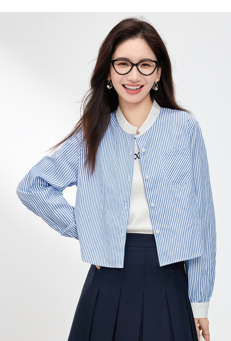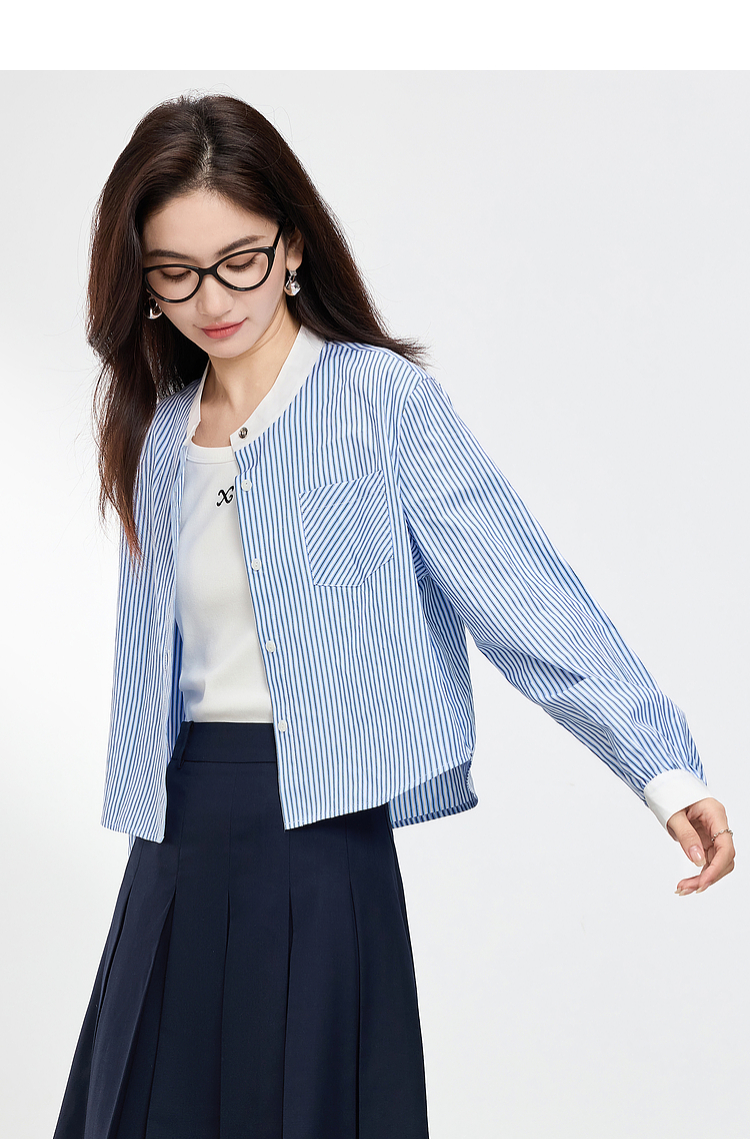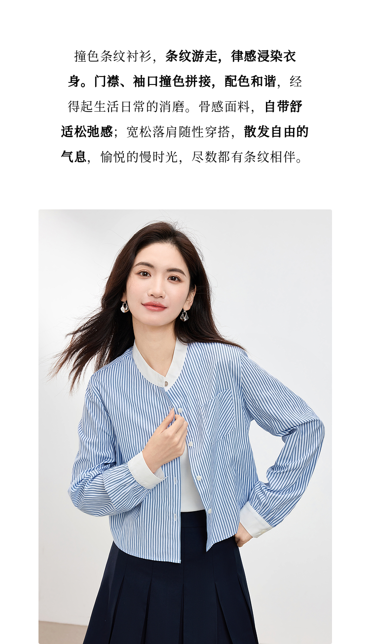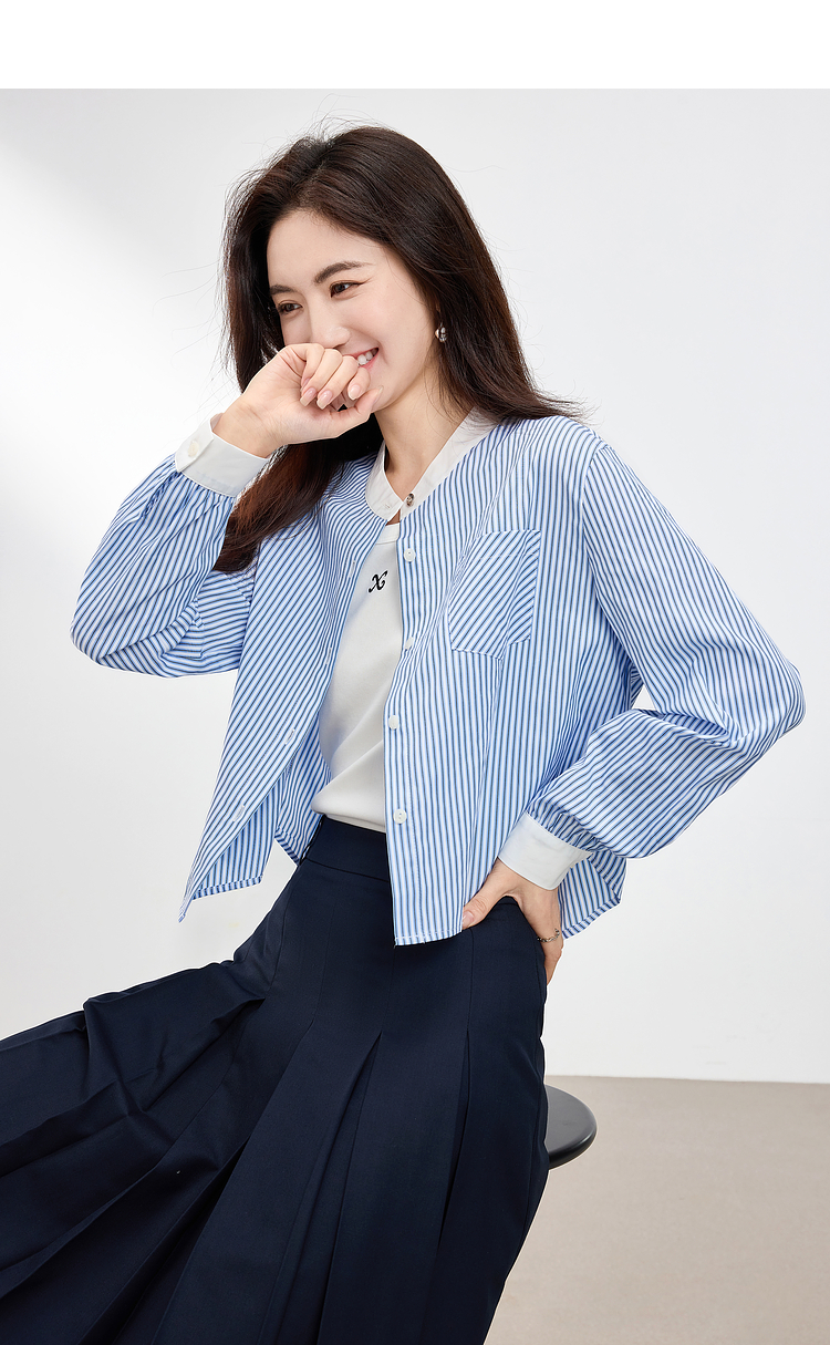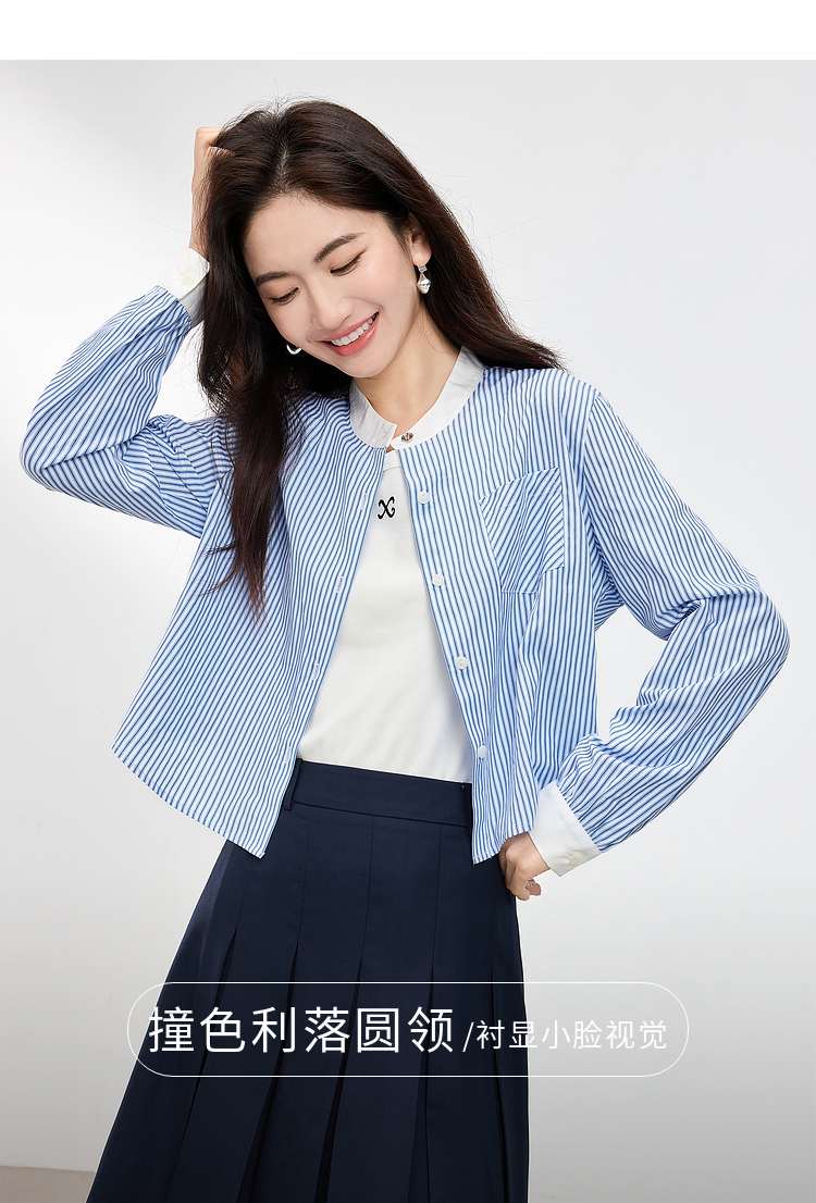 【专属特价】熙世界长袖条纹衬衫女小个子2025秋季新款法式休闲圆领设计感上衣