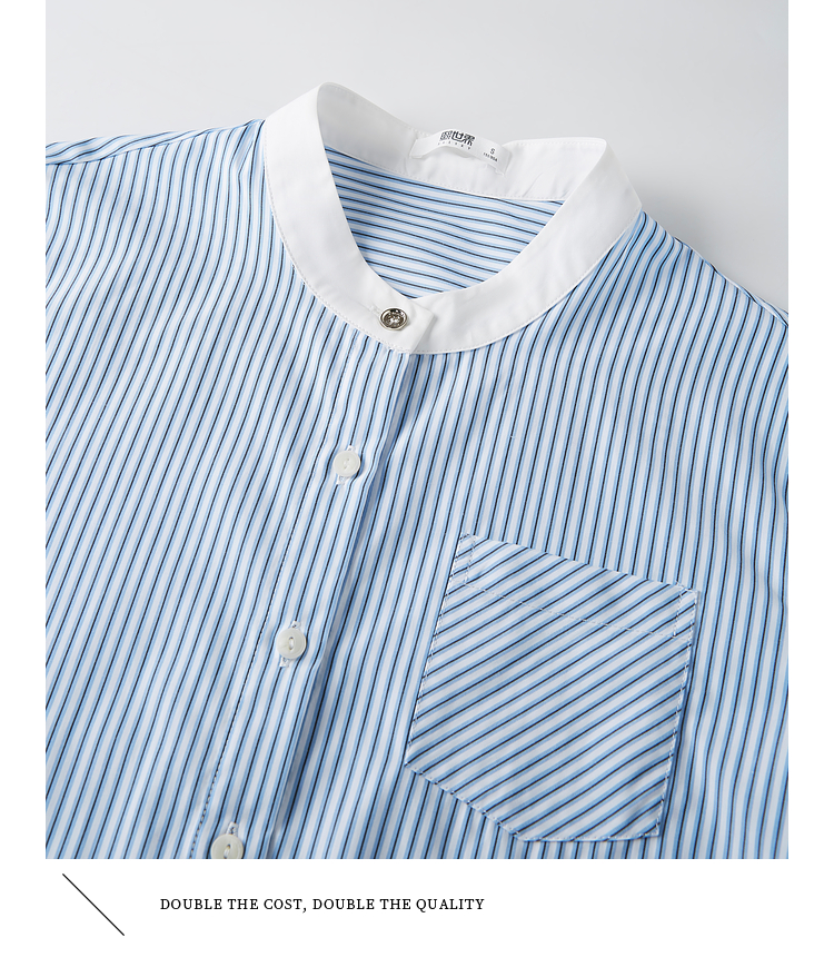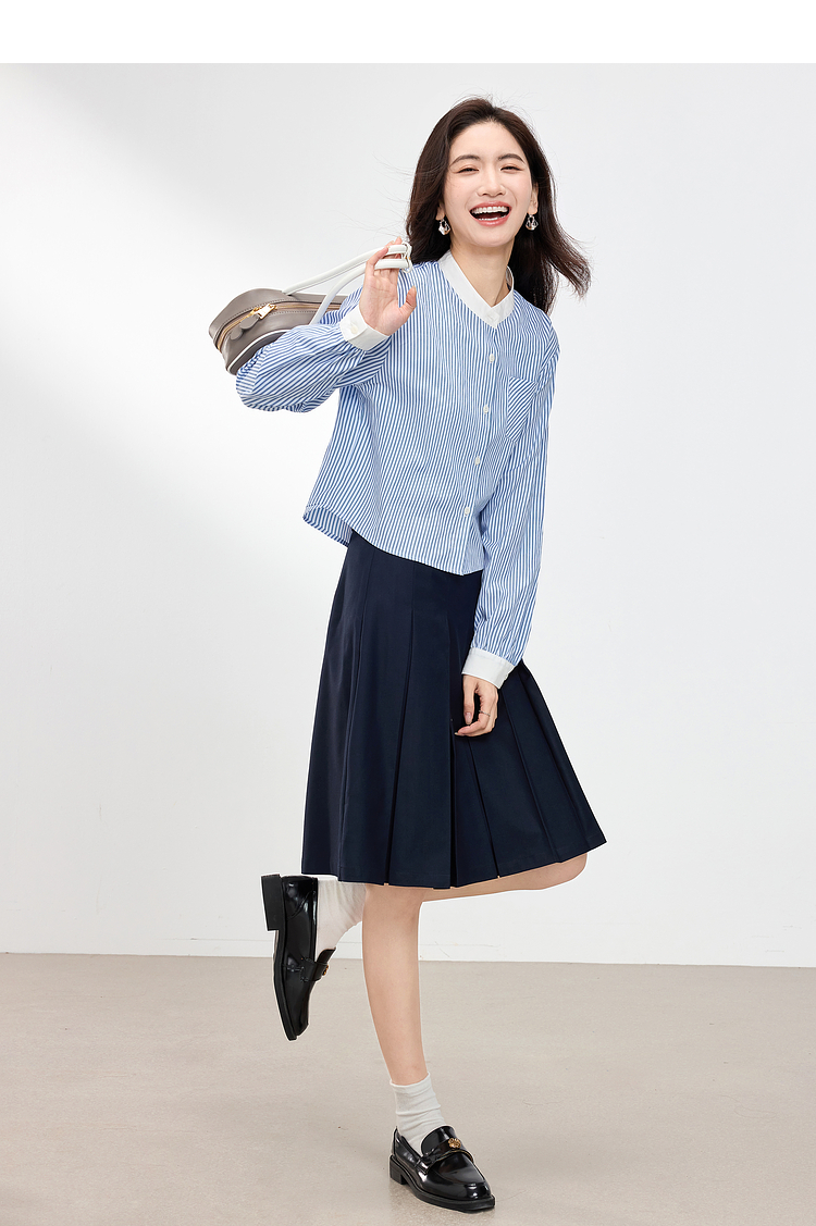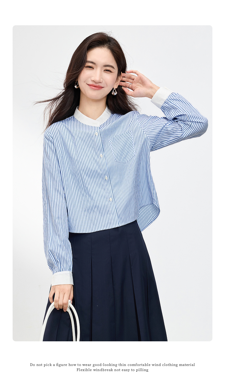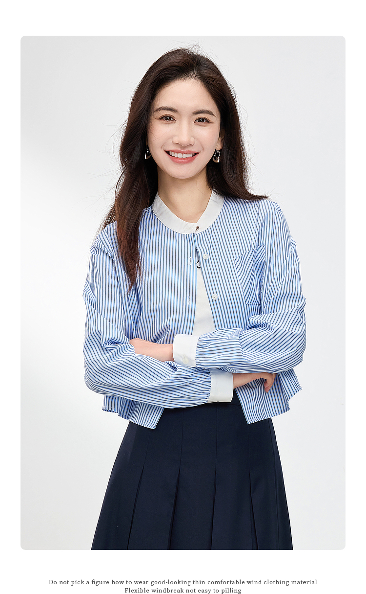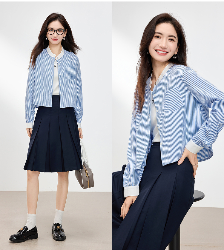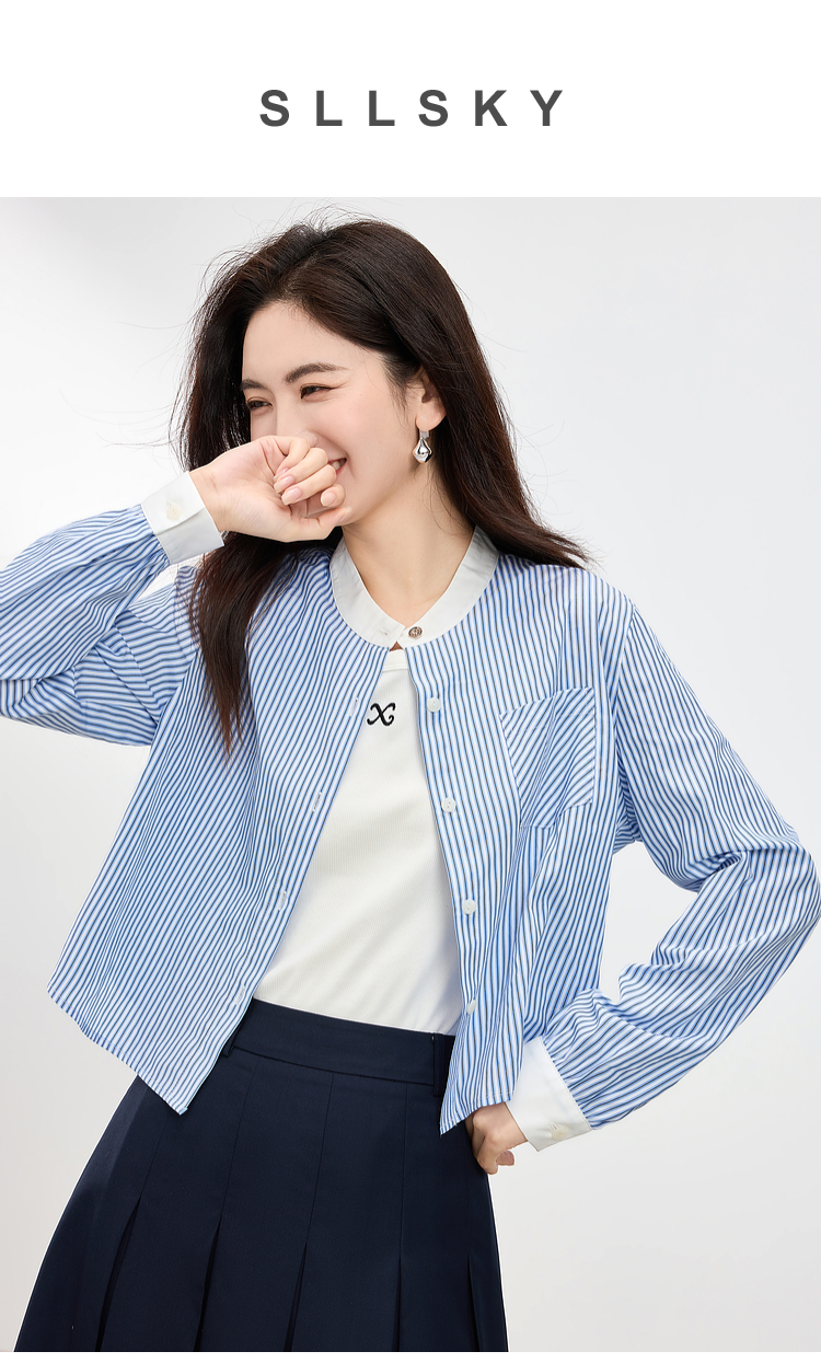 【专属特价】熙世界长袖条纹衬衫女小个子2025秋季新款法式休闲圆领设计感上衣