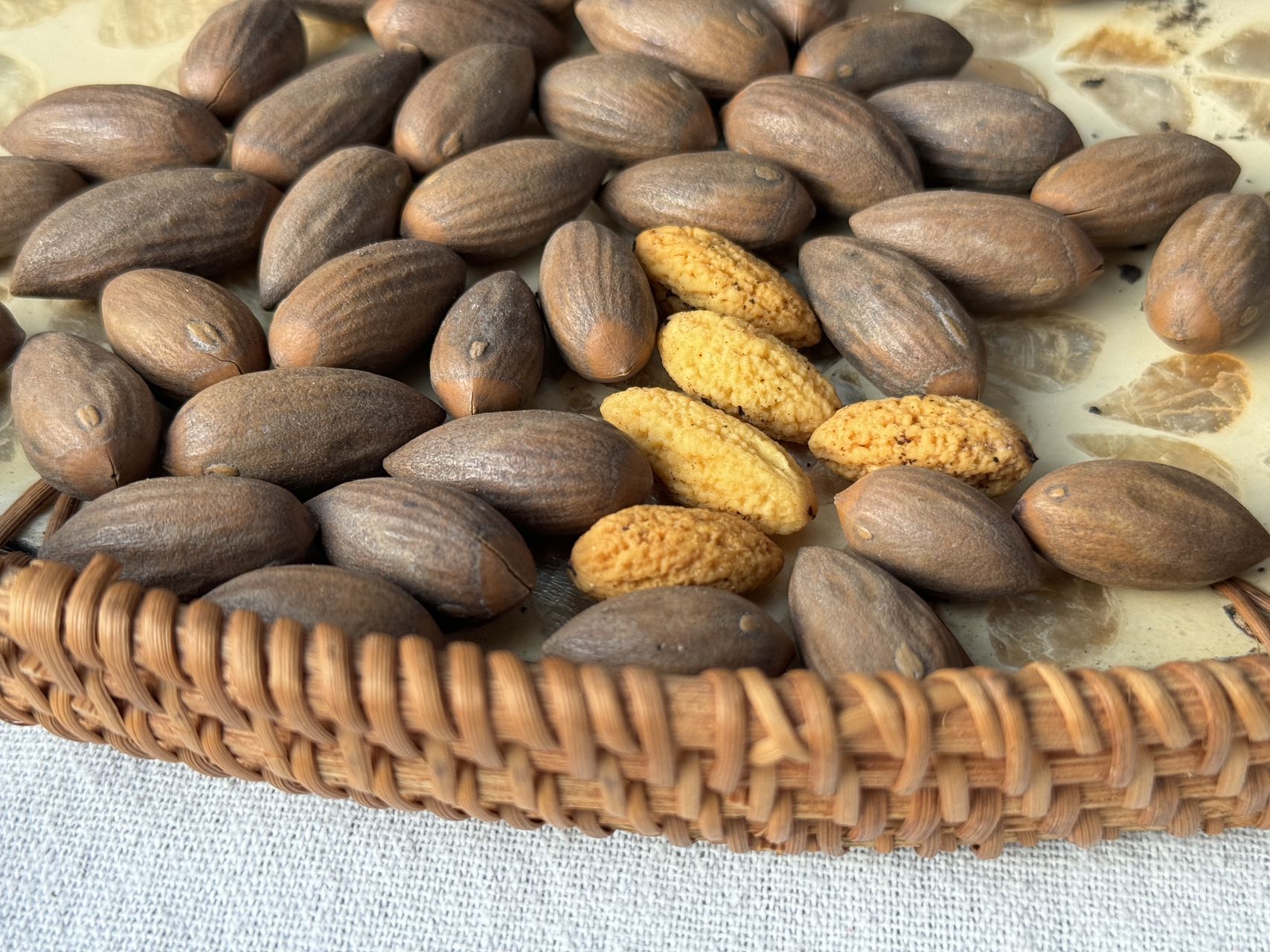 诸暨香榧以其壳薄仁满、种仁酥松细腻,质脆味香、营养丰富而著称;皮薄 味香酥脆,很特别的味道😋 ,挺上头的越吃越着迷。