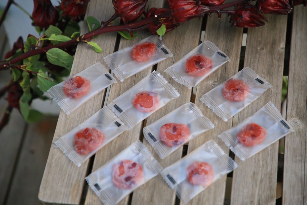 酸枣糕一共四个口味:原味、桂花味、洛神花味、百香果味。原味酸枣糕的配料只有酸枣肉和白砂糖,其他三个口味在此基础上分别添加了晒好的桂花干、自己种植的洛神花和百香果肉,杜绝其他添加剂、果味剂等科技狠活。
