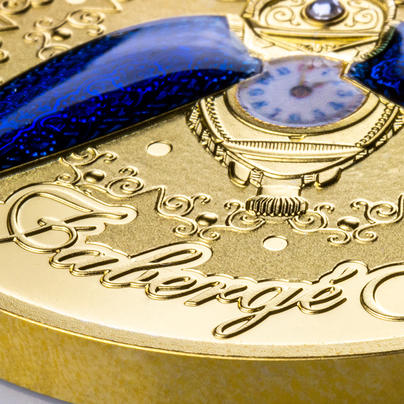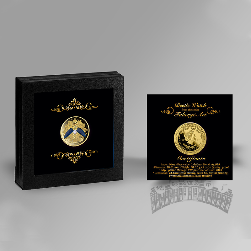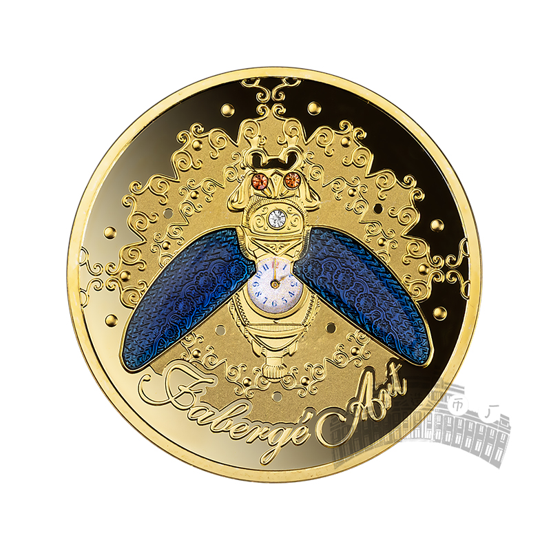 这枚币是为了致敬俄罗斯著名的金匠彼得·卡尔·法贝热,币上这个甲壳虫钟表,为其创作的钟表艺术杰作,相当的漂亮。