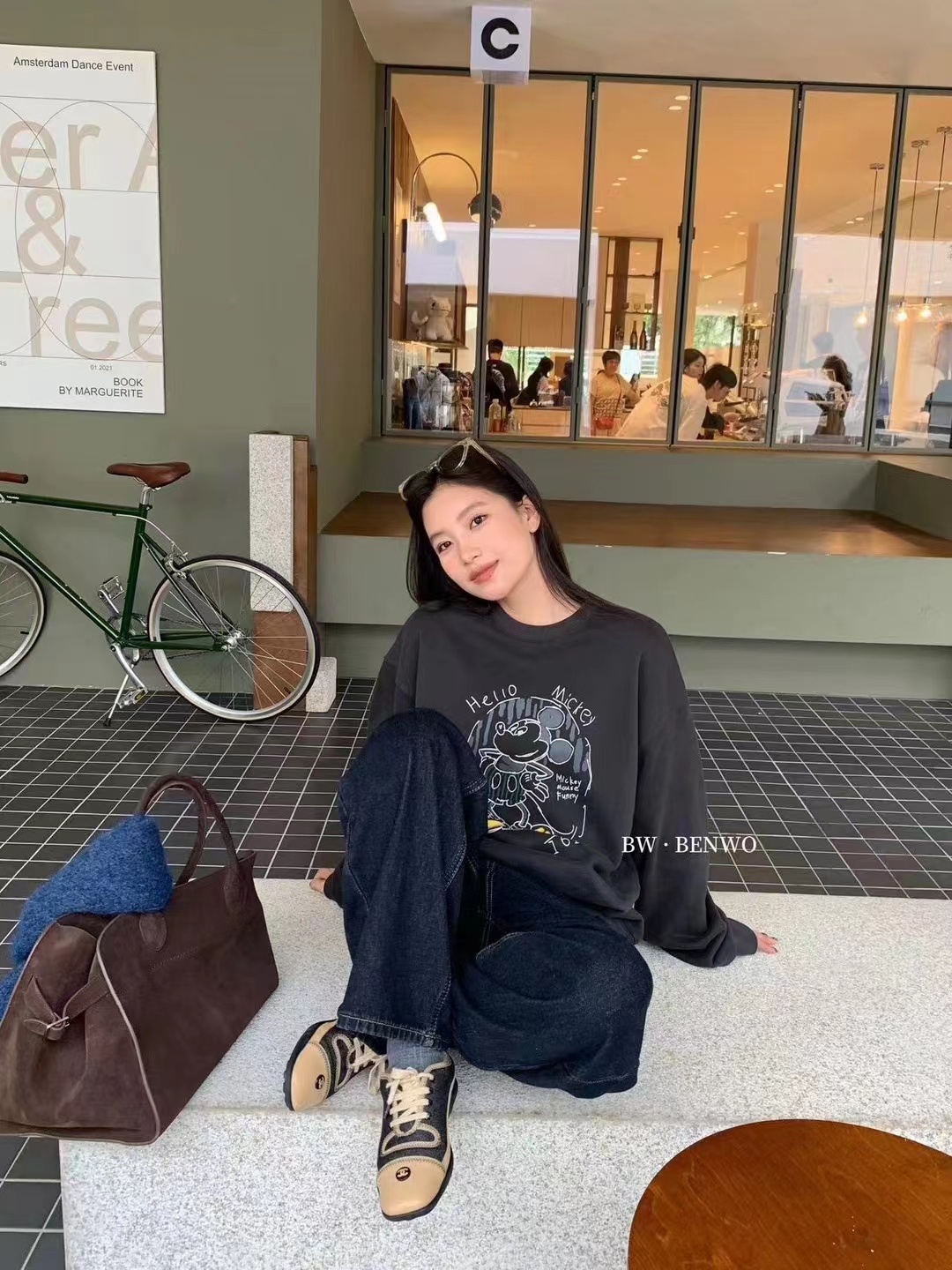 3686 # 韩国蓝 花灰 均码 米奇大印花好可爱 版型宽松很舒适 颜色高级又洋气 纯棉质感真的爱了 字母印花好吸睛 大印花视觉好显瘦