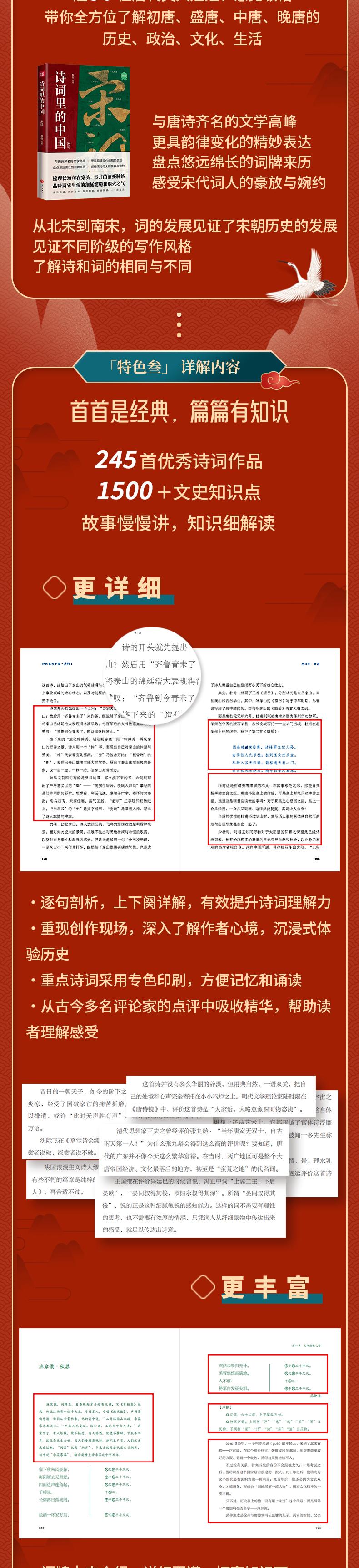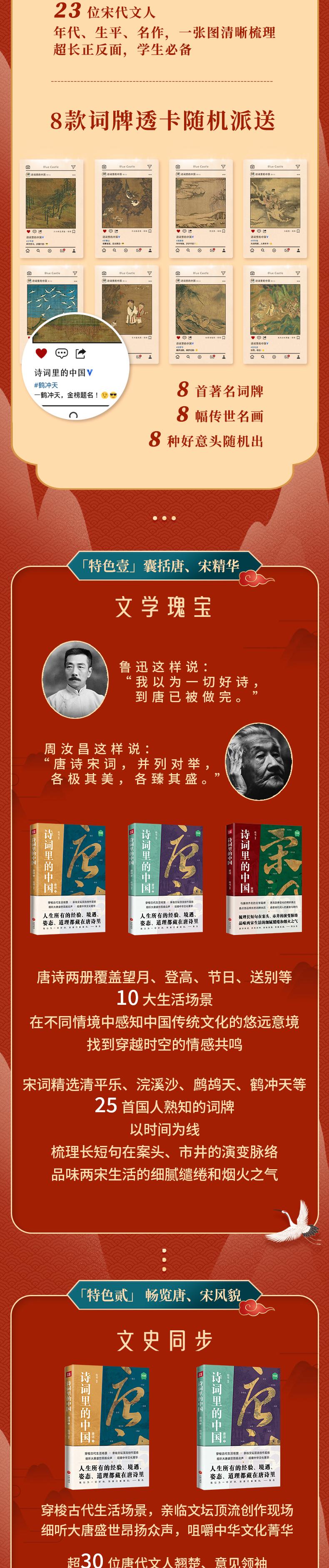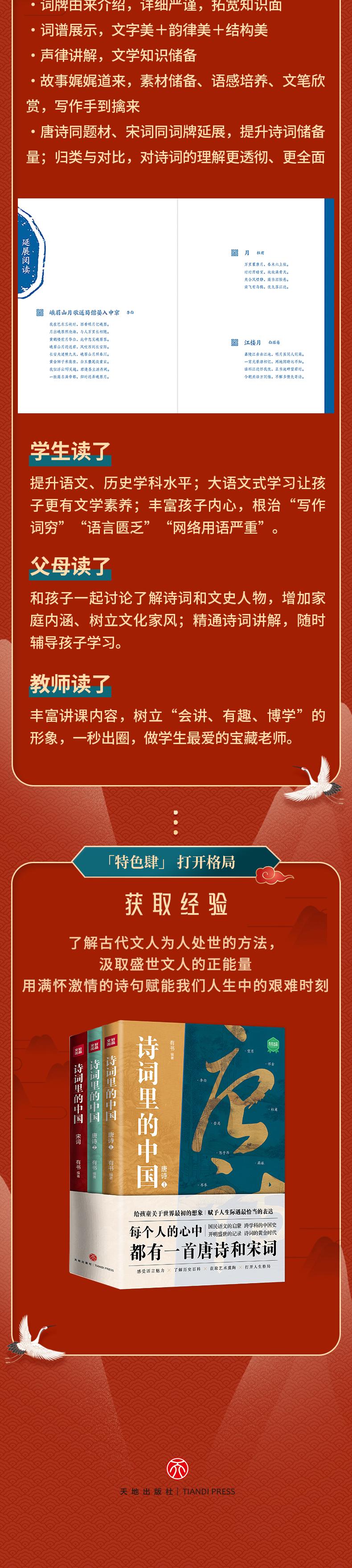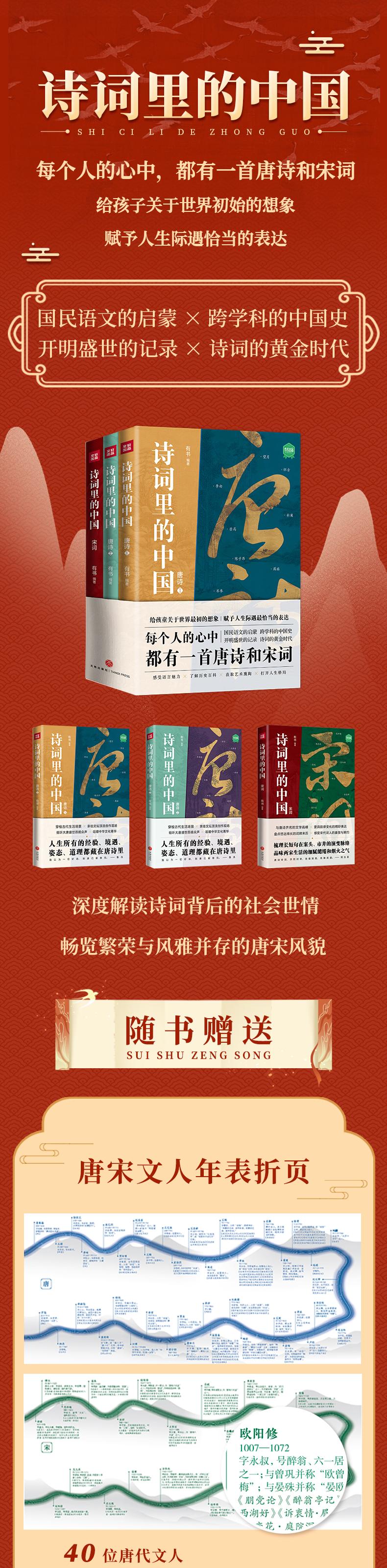 诗词是我们中国人语文的启蒙,是跨学科的中国史,是开明盛世的记录。唐宋两朝是中国诗词的黄金时代,《诗词里的中国·唐诗1》《诗词里的中国·唐诗2》覆盖怀古、望月、羁旅、登高、边塞、田园、咏物、节日、送别、闺情10大生活场景,随时随地感知中国人的文化基因。囊括超30位唐代诗人界的翘楚、意见领袖,全方位了解初唐、盛唐、中唐、晚唐的历史、政治、文化、生活。《诗词里的中国·宋词》以时间为线,精选25首不同词牌的宋词,理清词牌的来龙去脉,感受中国文字间蕴含的音律之美。从北宋到南宋,词的发展见证了宋朝历史的发展,体味不同阶级的作者风格,了解诗和词相同与不同。《诗词里的中国》深度解读了诗词背后的社会世情,畅览繁荣与风雅并存的唐宋风貌,字里行间贯通历史,让人们透过诗词读懂中国,感受中国语言的魅力,了解中国历史,获取艺术熏陶,打开人生格局。