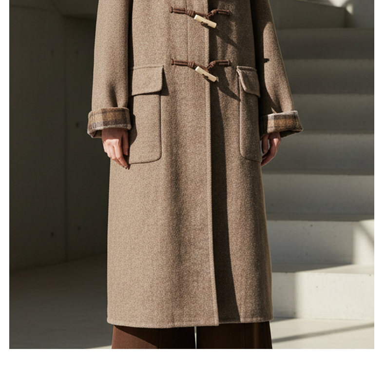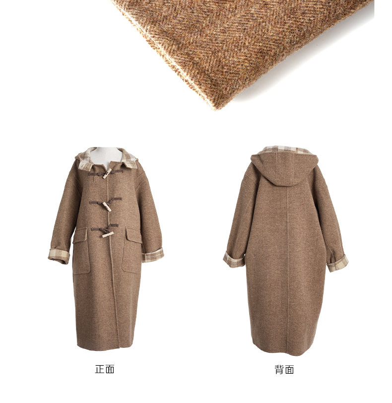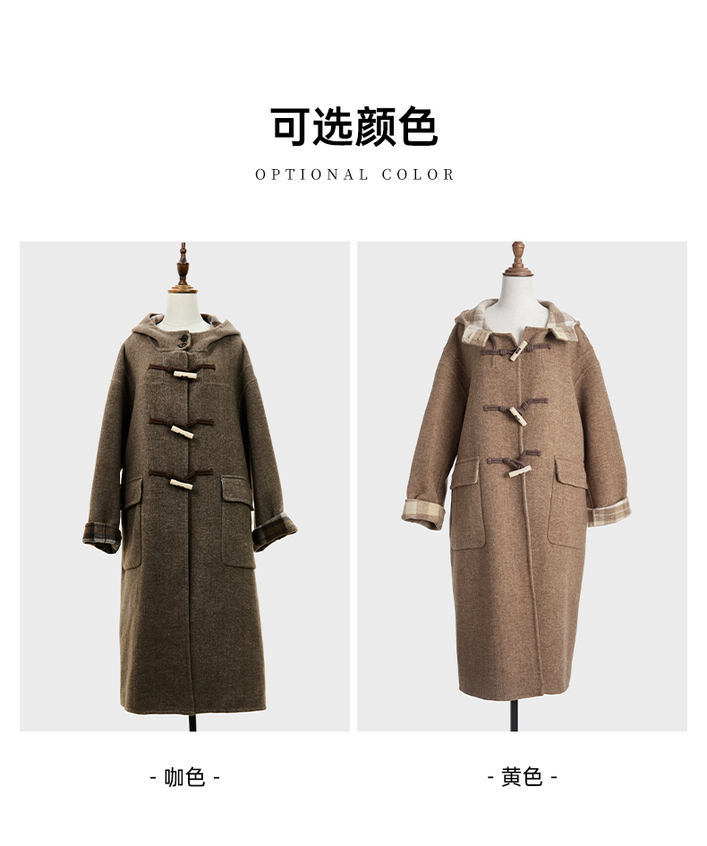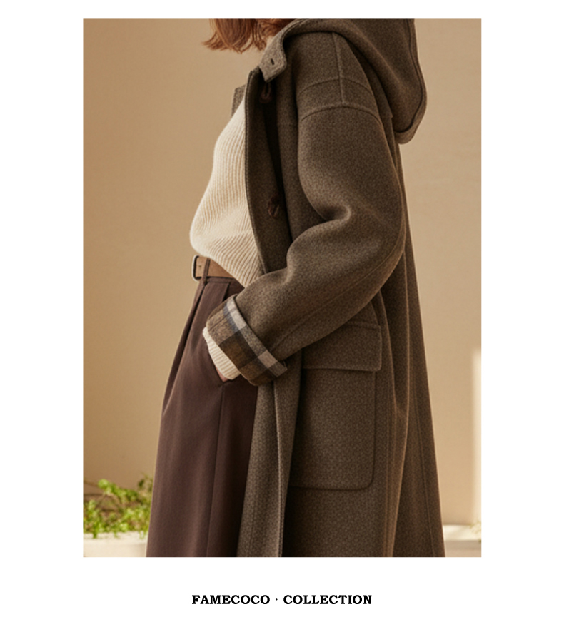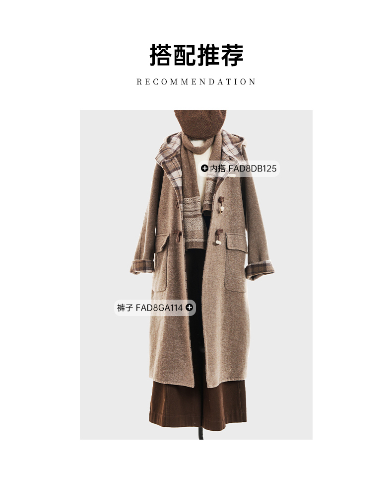 Famecoco范可儿牛角扣连帽宽松长款羊毛大衣双面尼外套FAD8AQ107