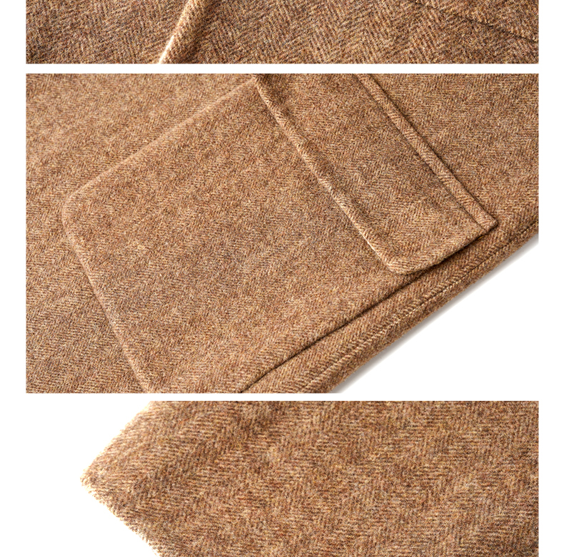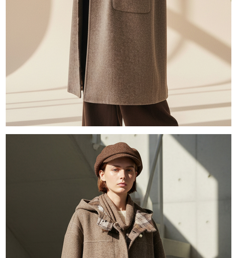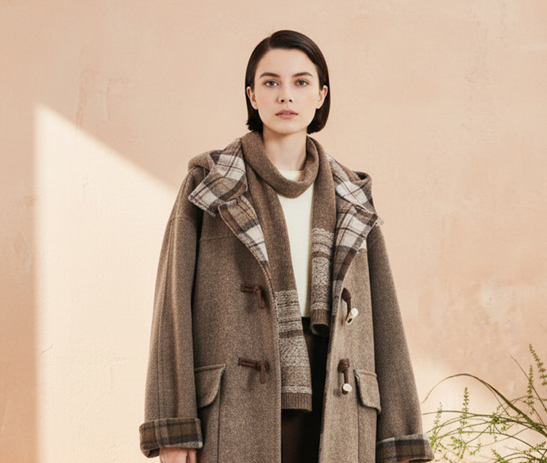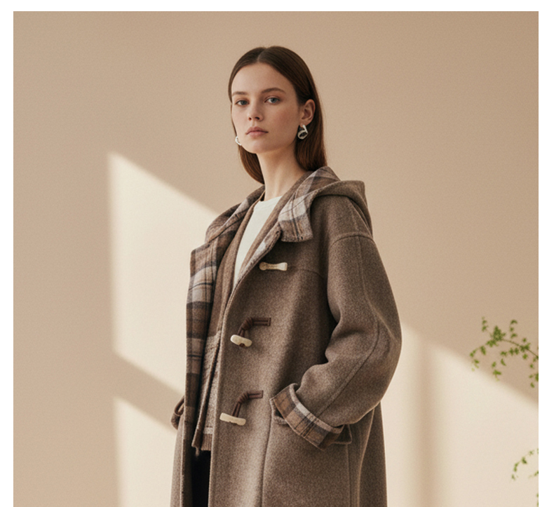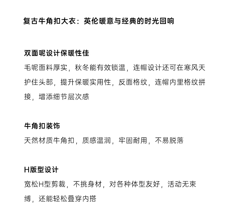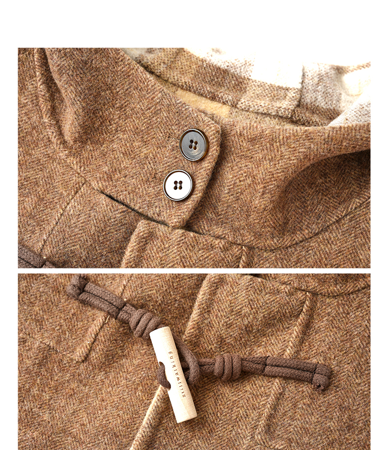 Famecoco范可儿牛角扣连帽宽松长款羊毛大衣双面尼外套FAD8AQ107