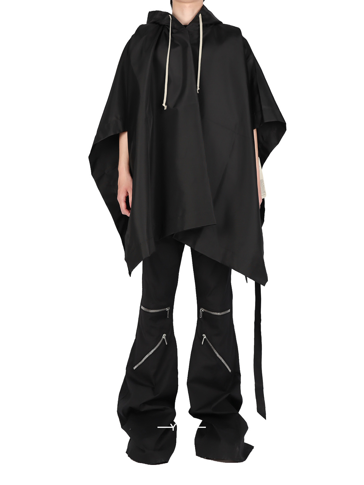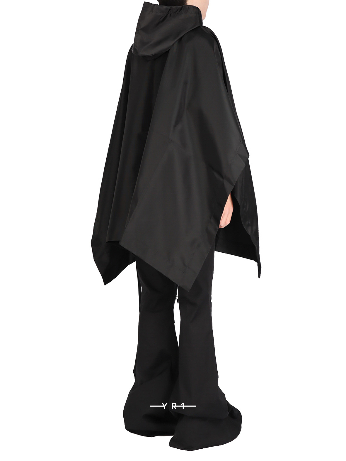 这款斗篷前长及膝盖以上,带有抽绳兜帽。它采用大号方形剪裁,两侧敞开,垂过肩部,长度至肘部以下。下摆两侧略微下垂。