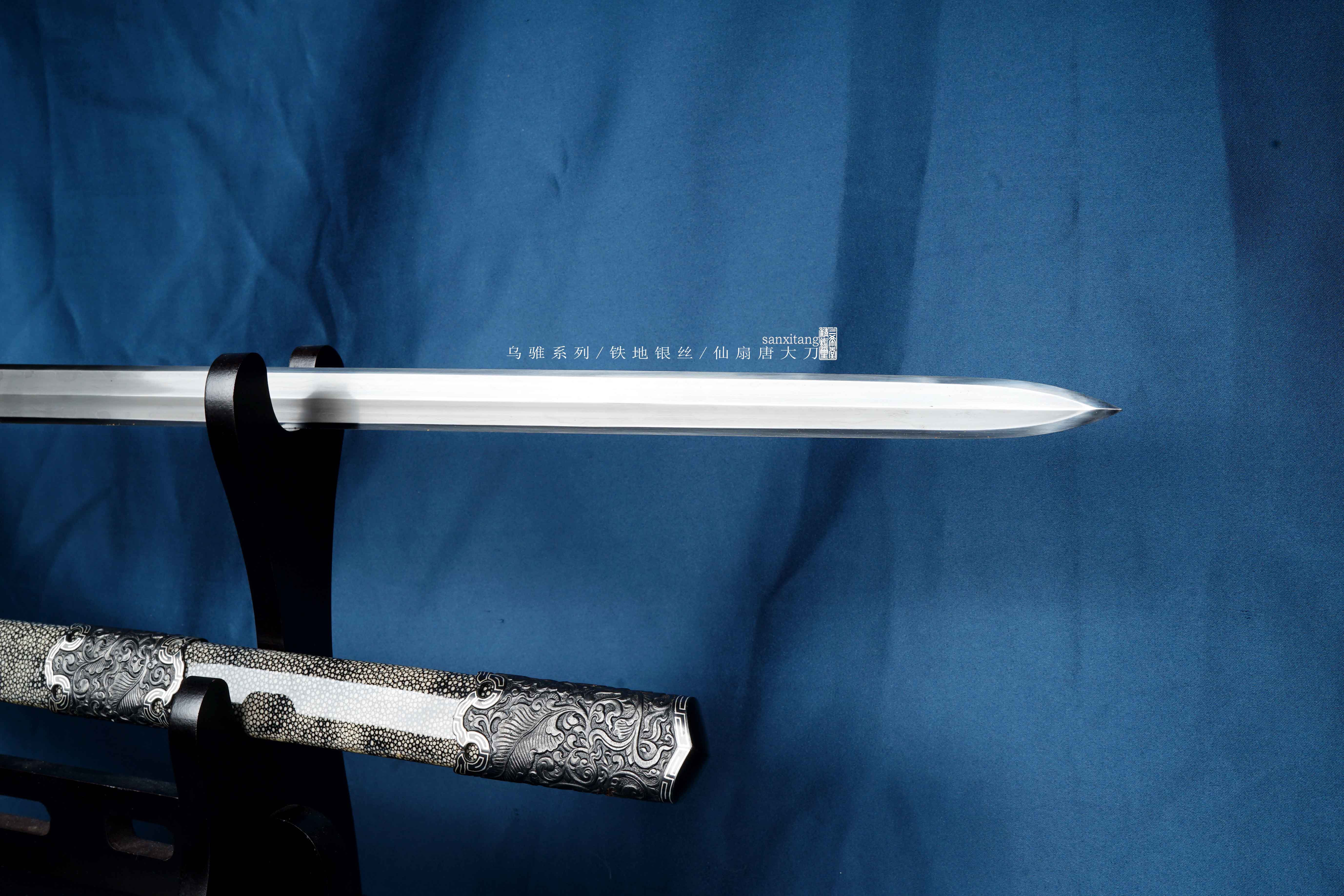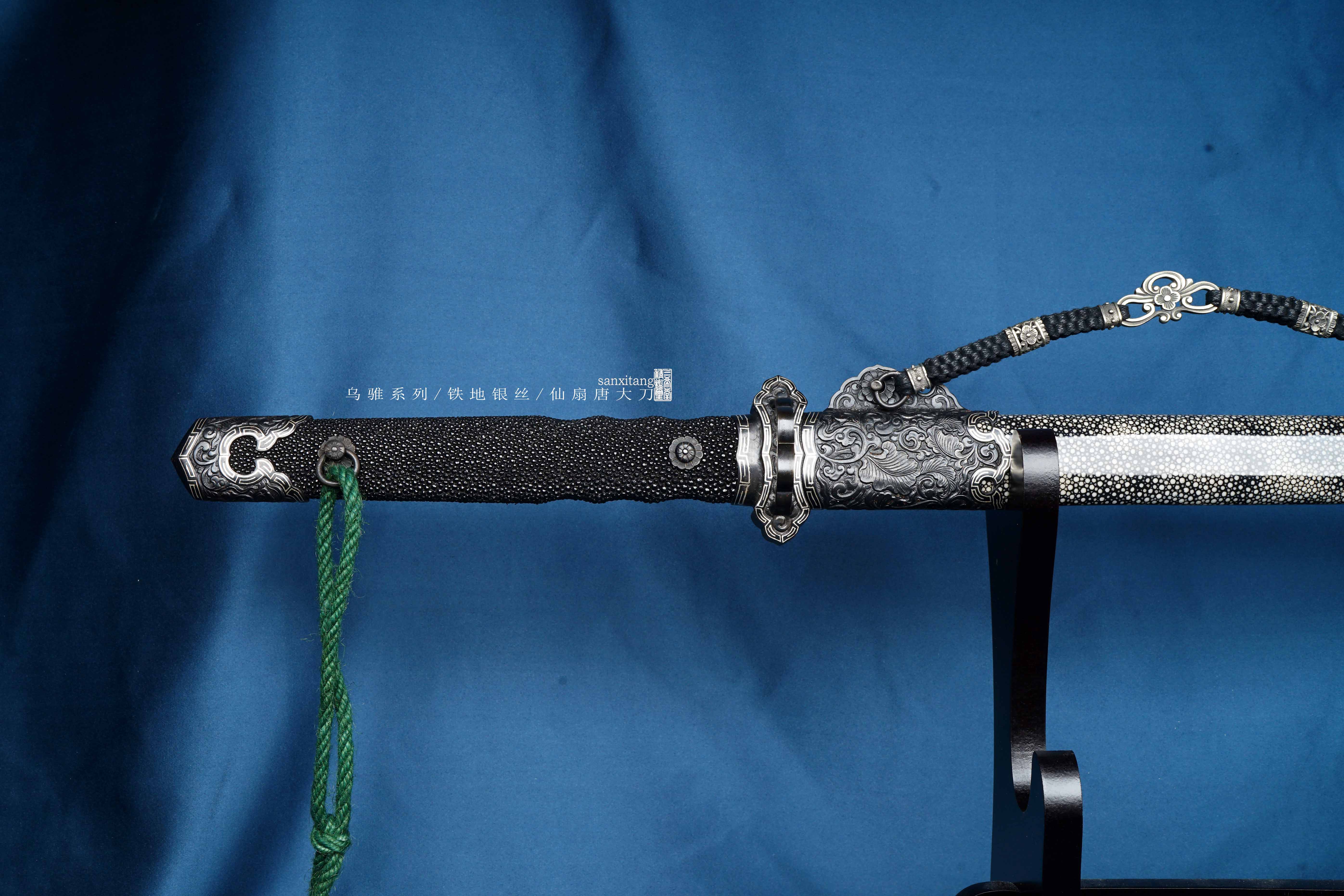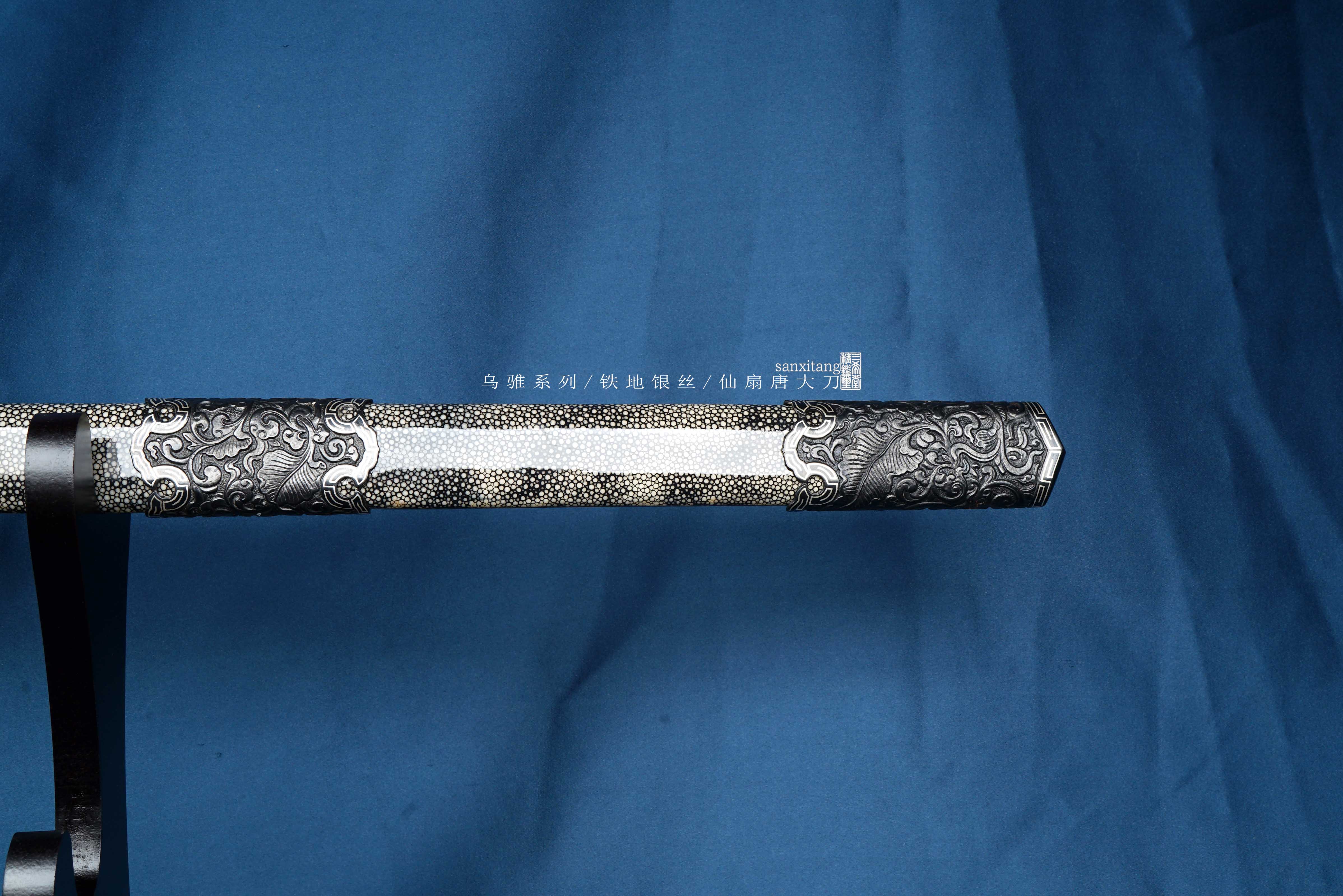 乌骓系列是我们的主打系列 全长105cm 采古铁古法锻打 纯手工石头一道一道磨出来 刀装为手工凸花铁雕八仙过海图、镶嵌银丝 表面氧化发黑 剑柄剑鞘采用整块性能稳定的实木包裹珍珠鱼皮 整个东西配出来 古典雅致 低调奢华 送人或者收藏都是极好的选择!