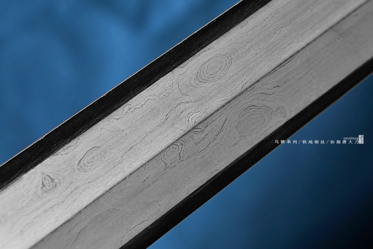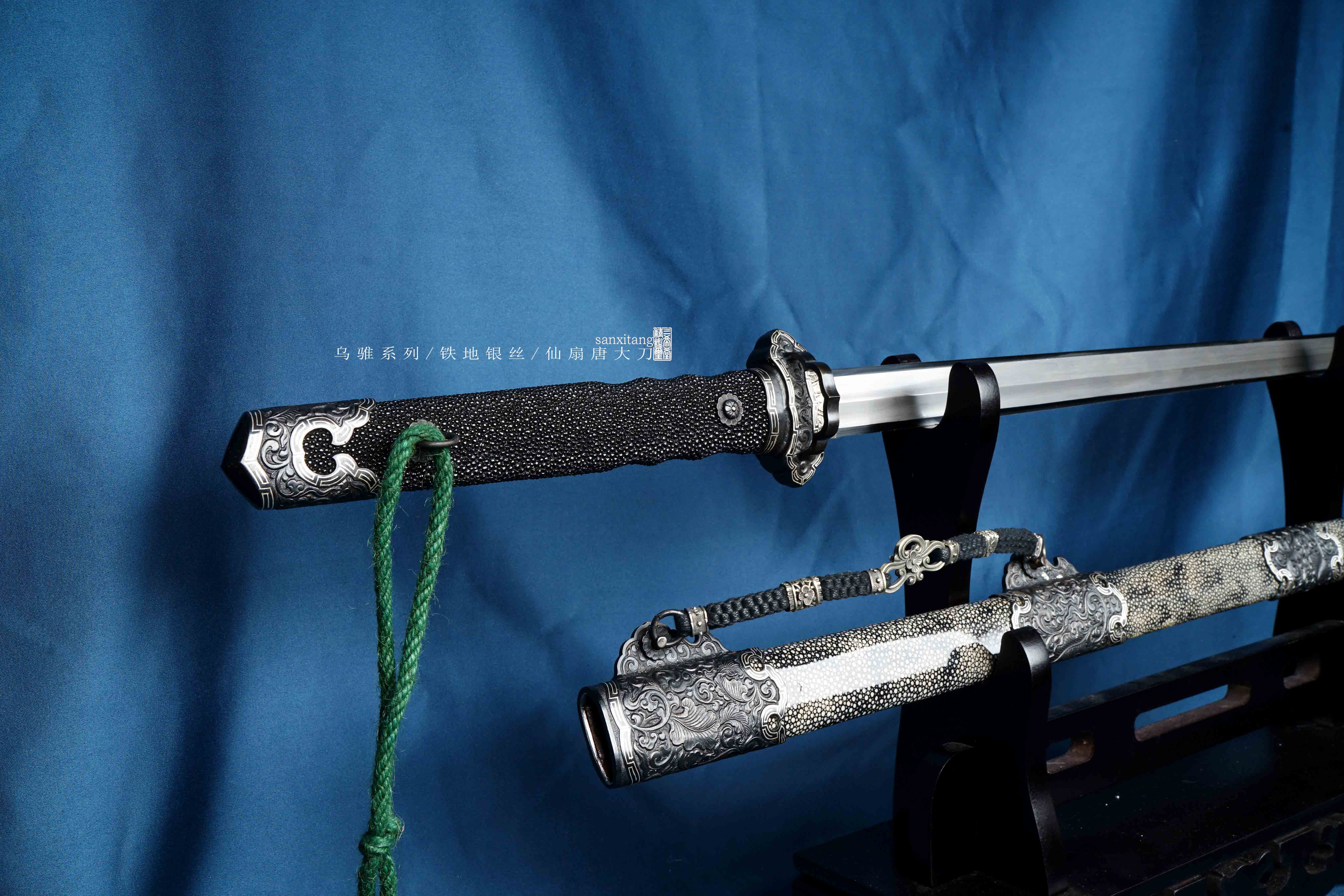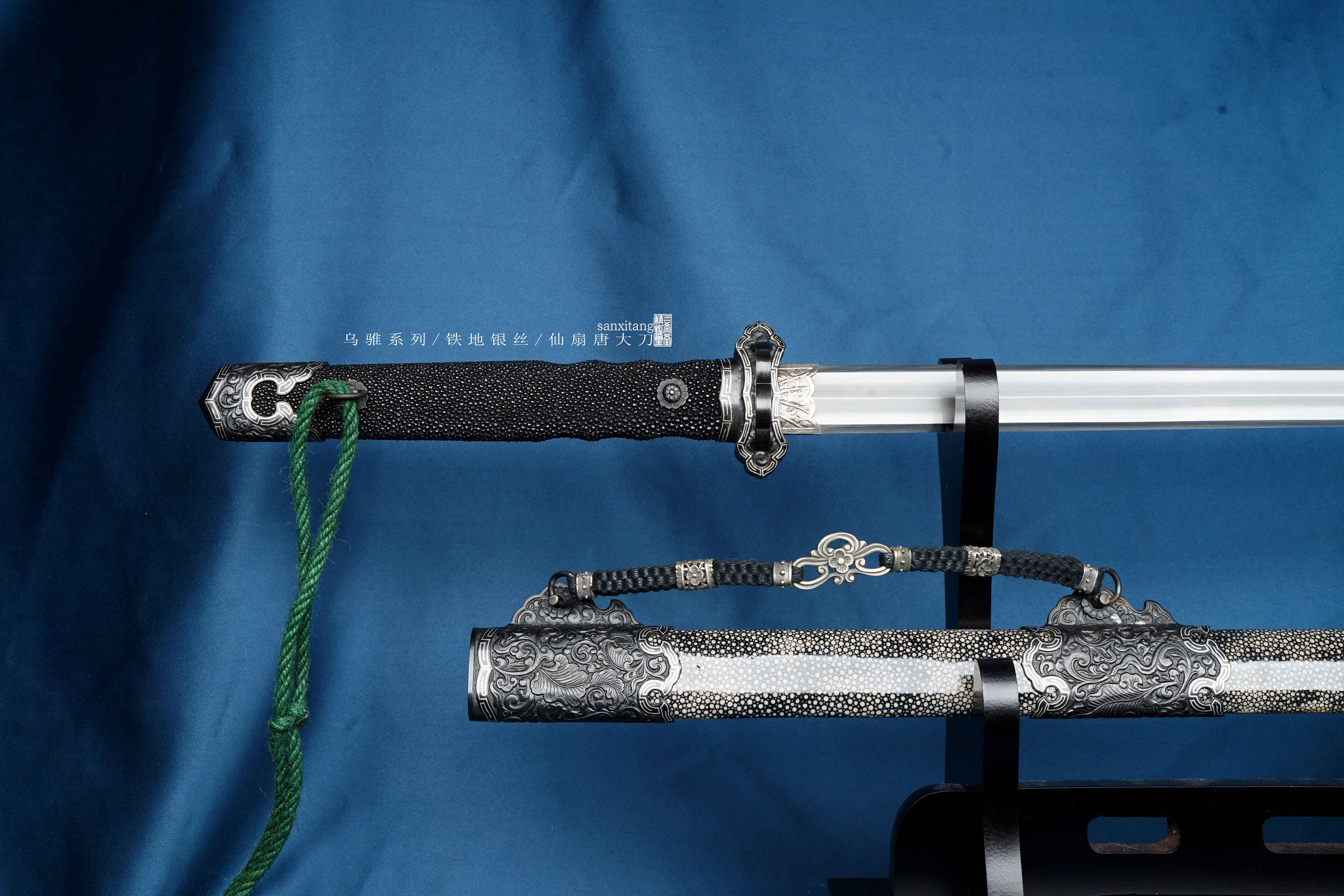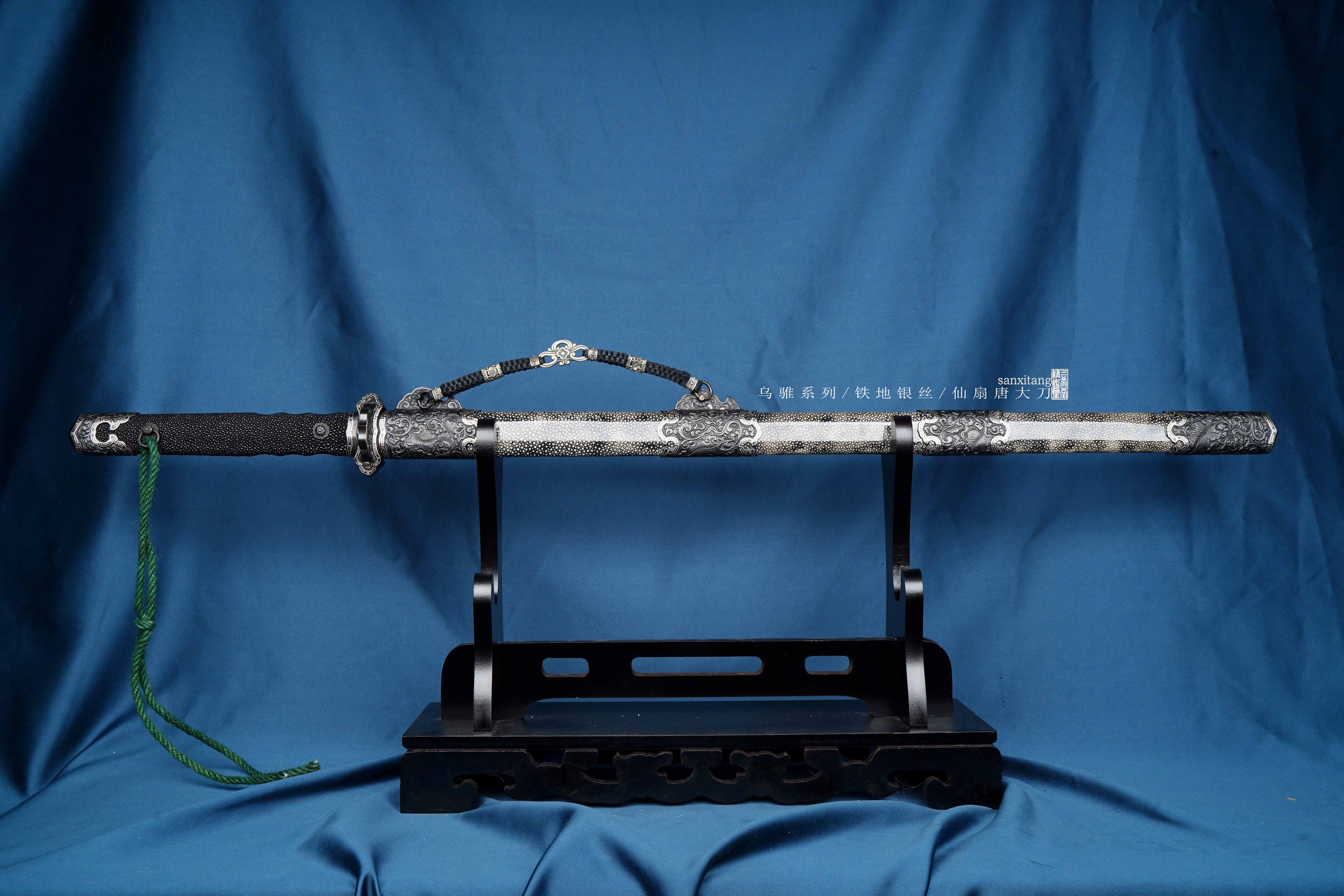 乌骓系列是我们的主打系列 全长105cm 采古铁古法锻打 纯手工石头一道一道磨出来 刀装为手工凸花铁雕八仙过海图、镶嵌银丝 表面氧化发黑 剑柄剑鞘采用整块性能稳定的实木包裹珍珠鱼皮 整个东西配出来 古典雅致 低调奢华 送人或者收藏都是极好的选择!