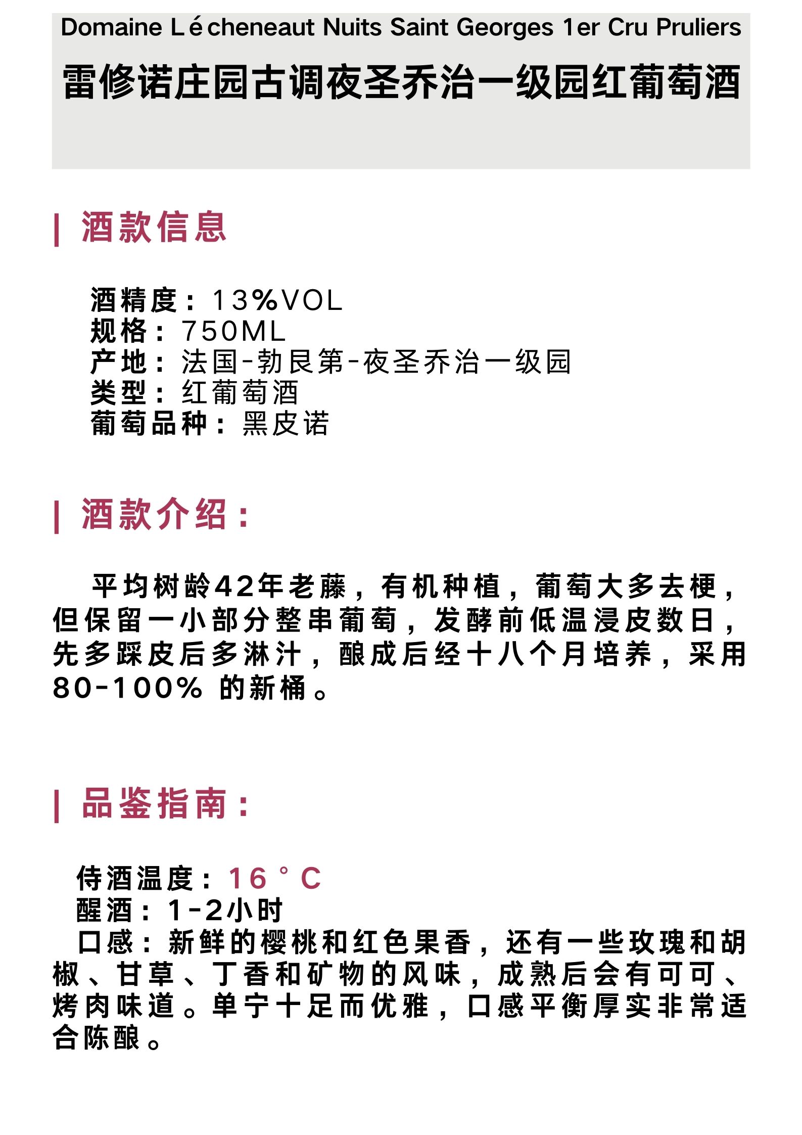 雷修诺庄园 古调夜圣乔治一级园红葡萄酒 Domaine Lécheneaut Pruliers Nuits Saint Georges 1er Cru