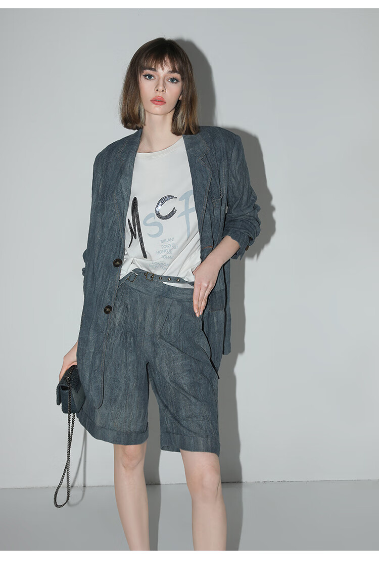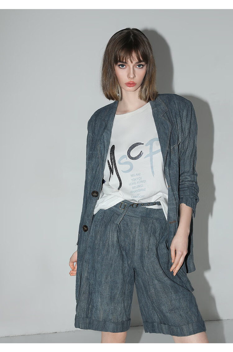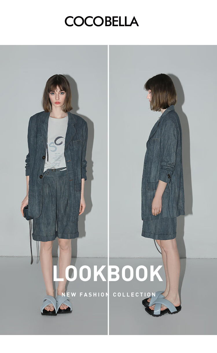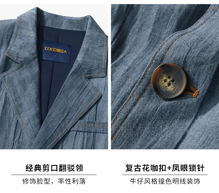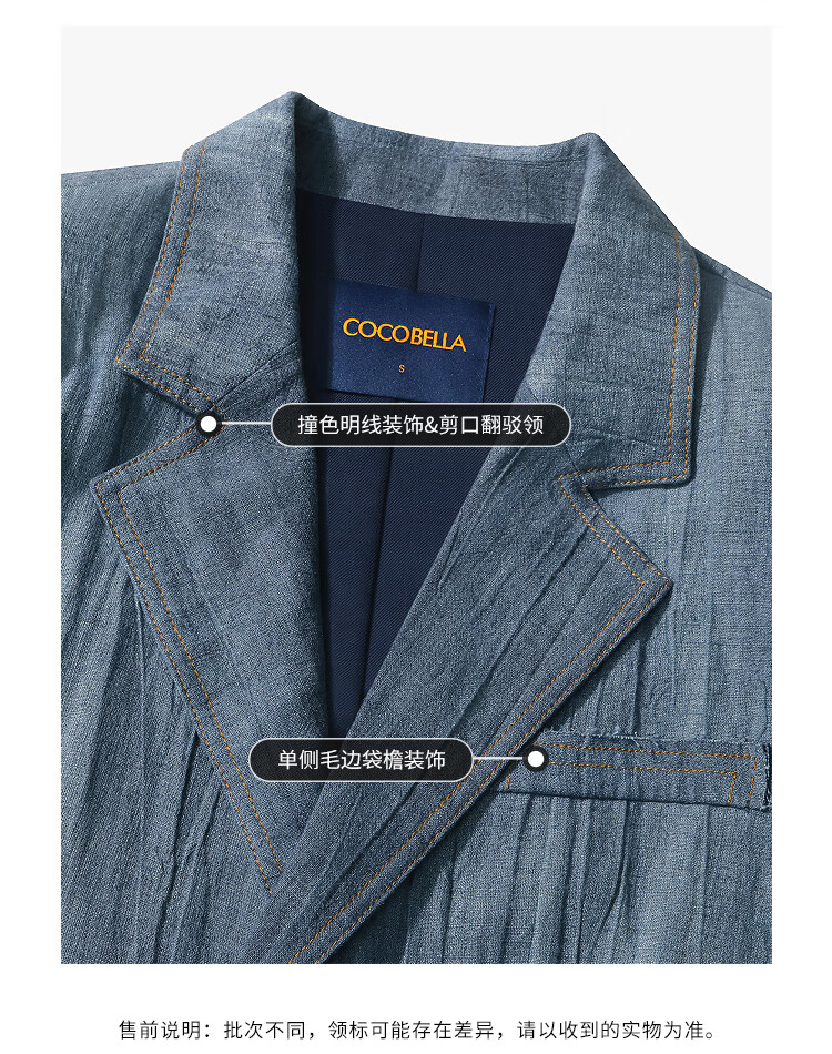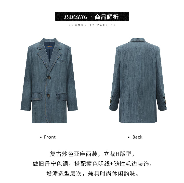 COCOBELLA砂洗炒色亚麻西装春夏松弛感穿搭牛仔色毛边外套SI3023