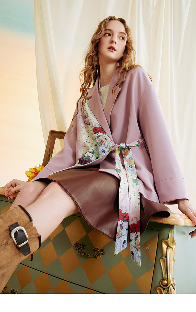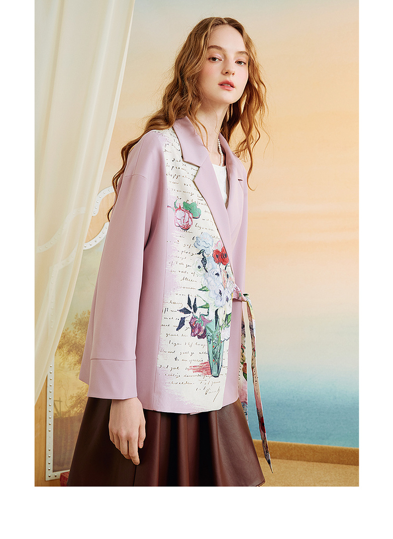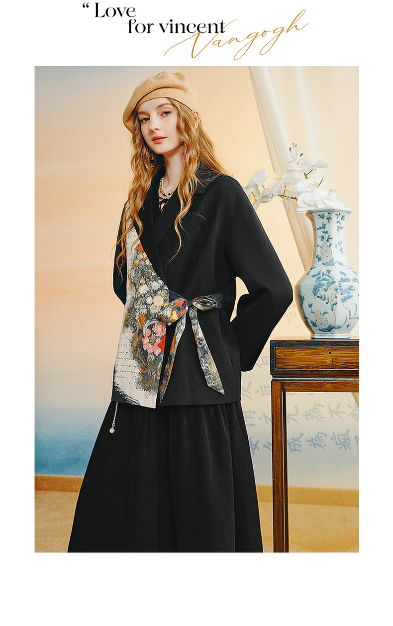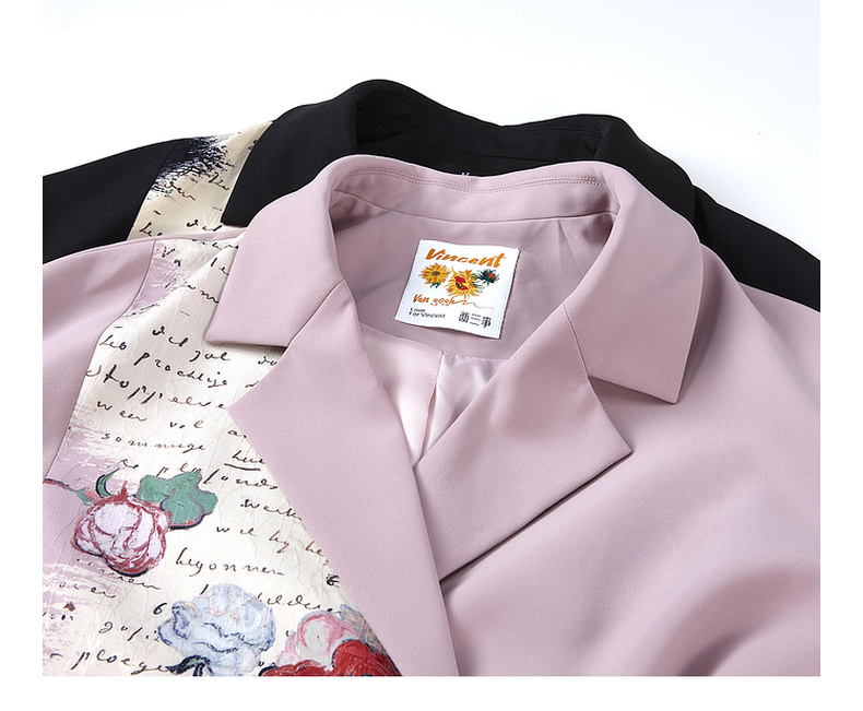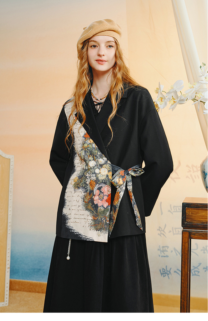 两三事梵高文艺半熟花期2025秋季新款复古印花拼接斜边绑带西装女