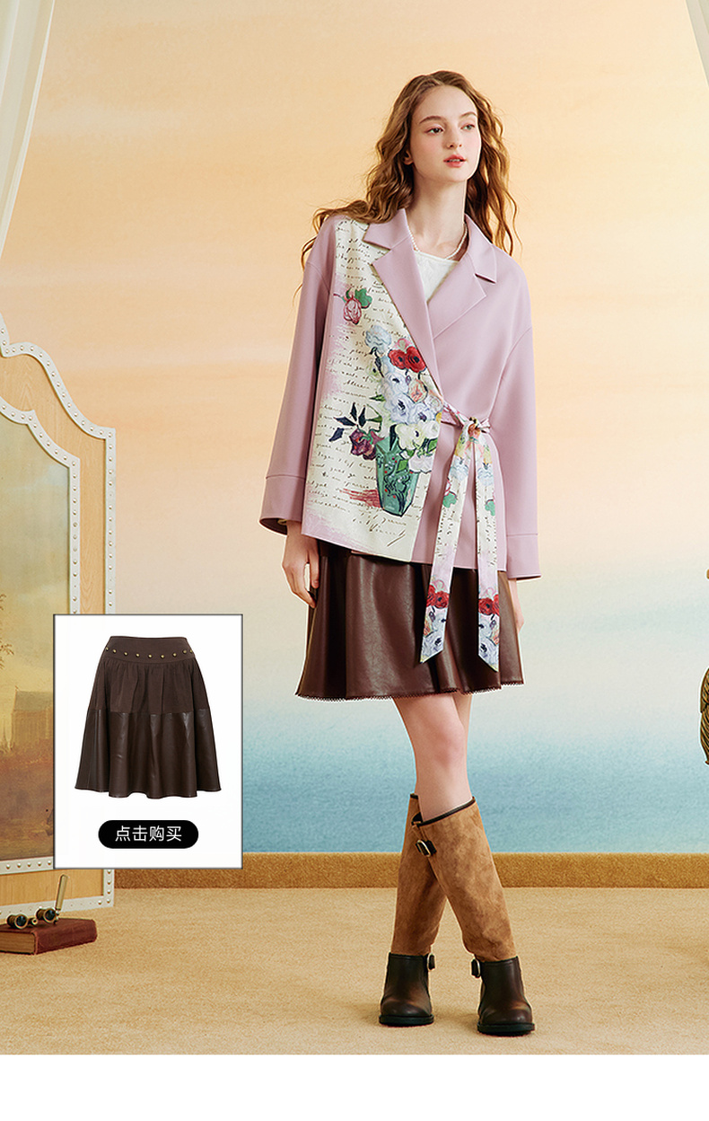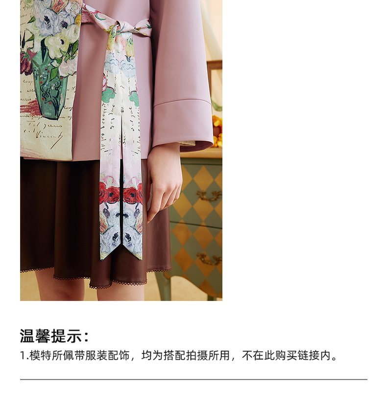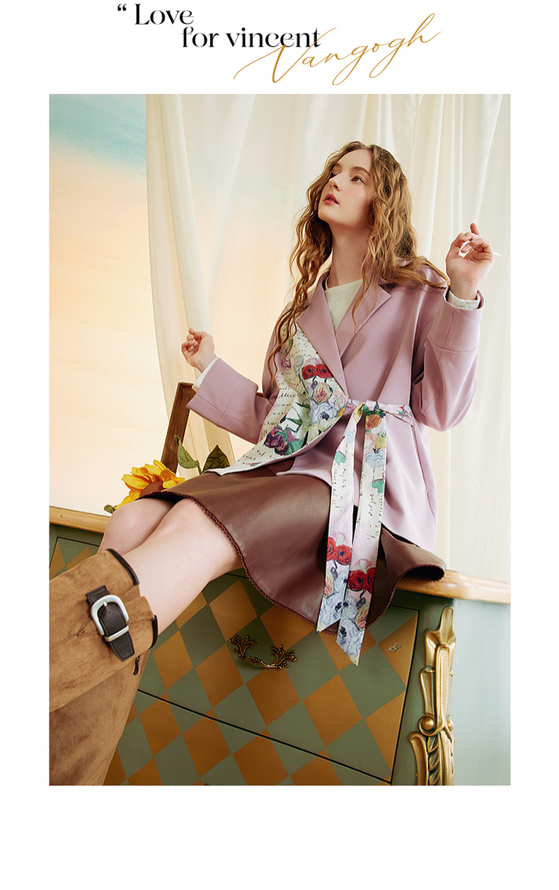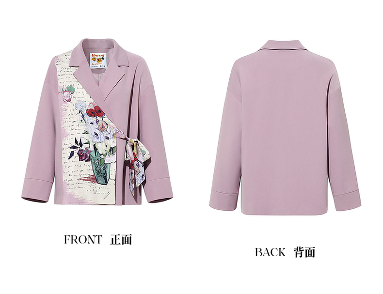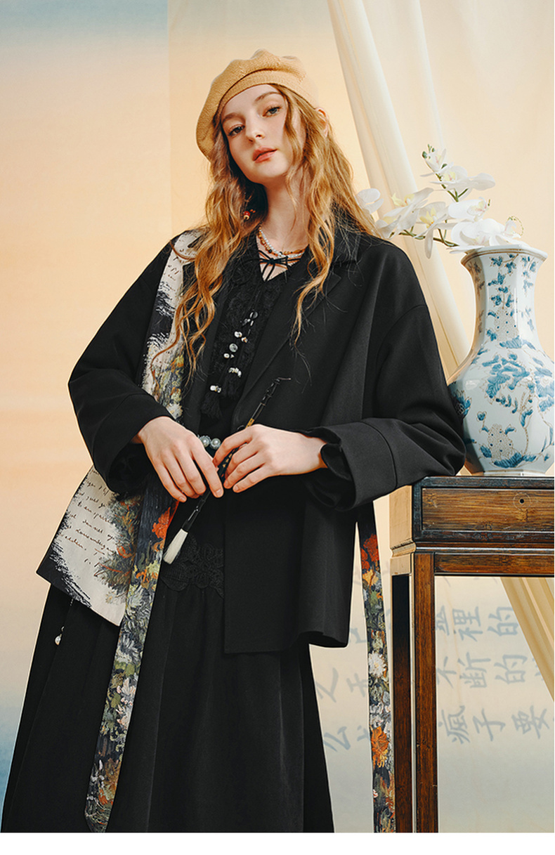 两三事梵高文艺半熟花期2025秋季新款复古印花拼接斜边绑带西装女