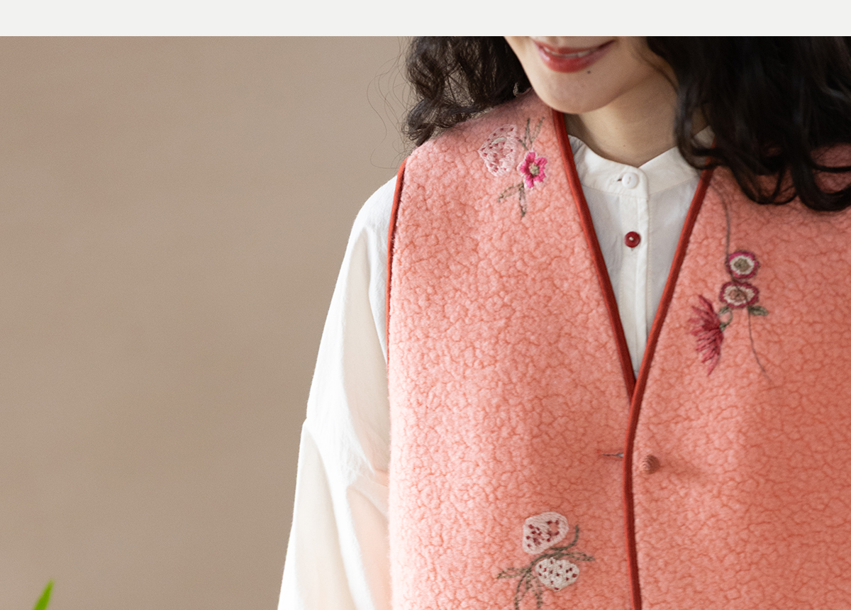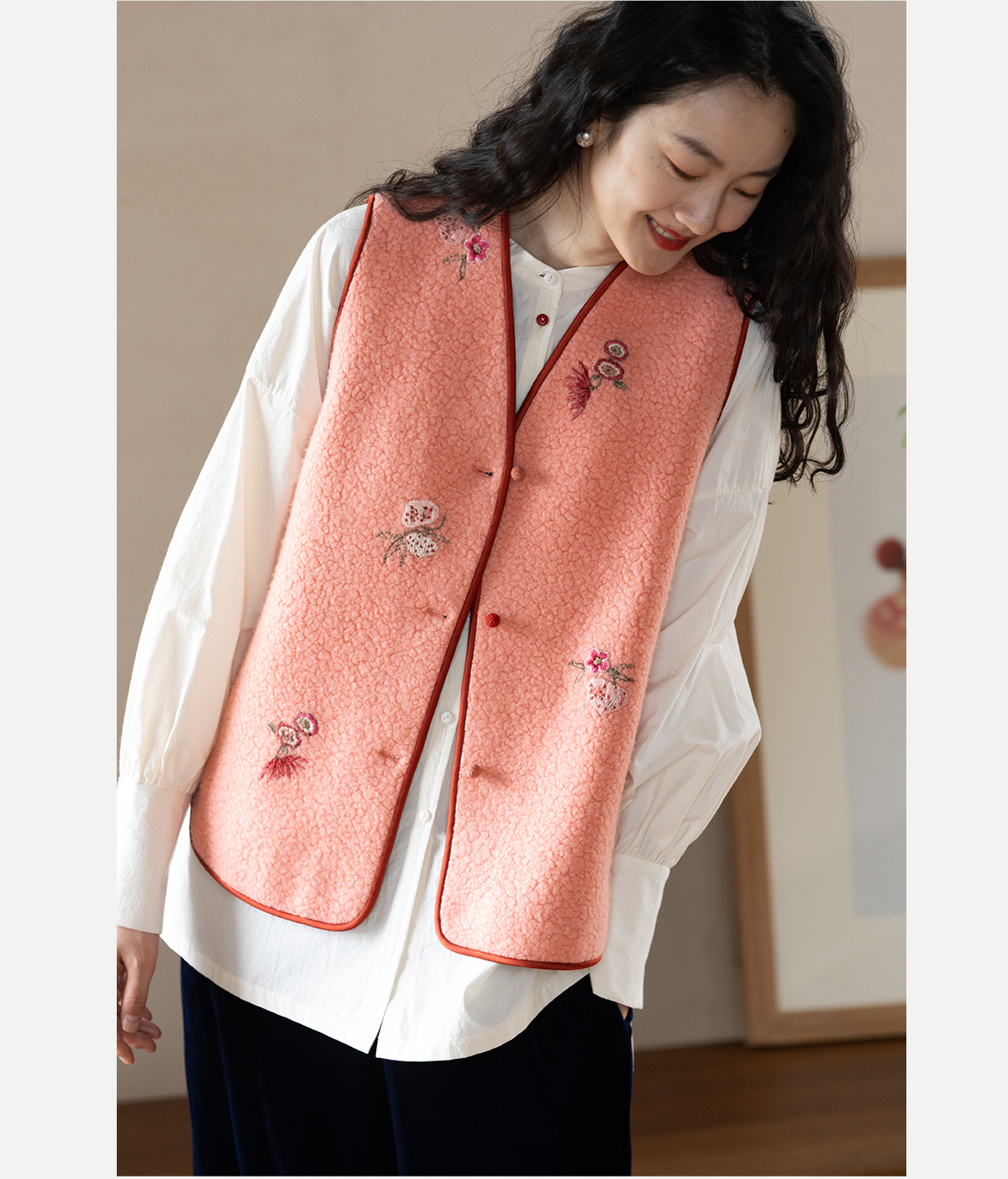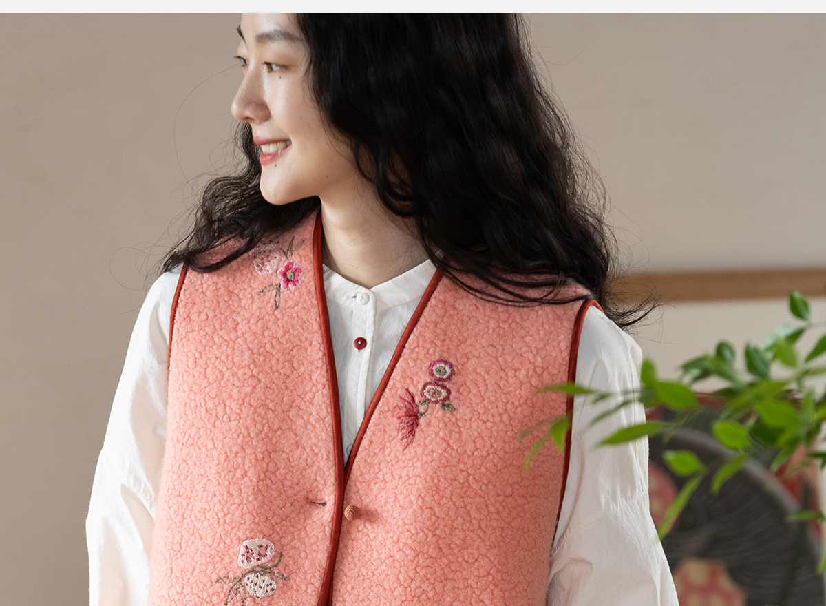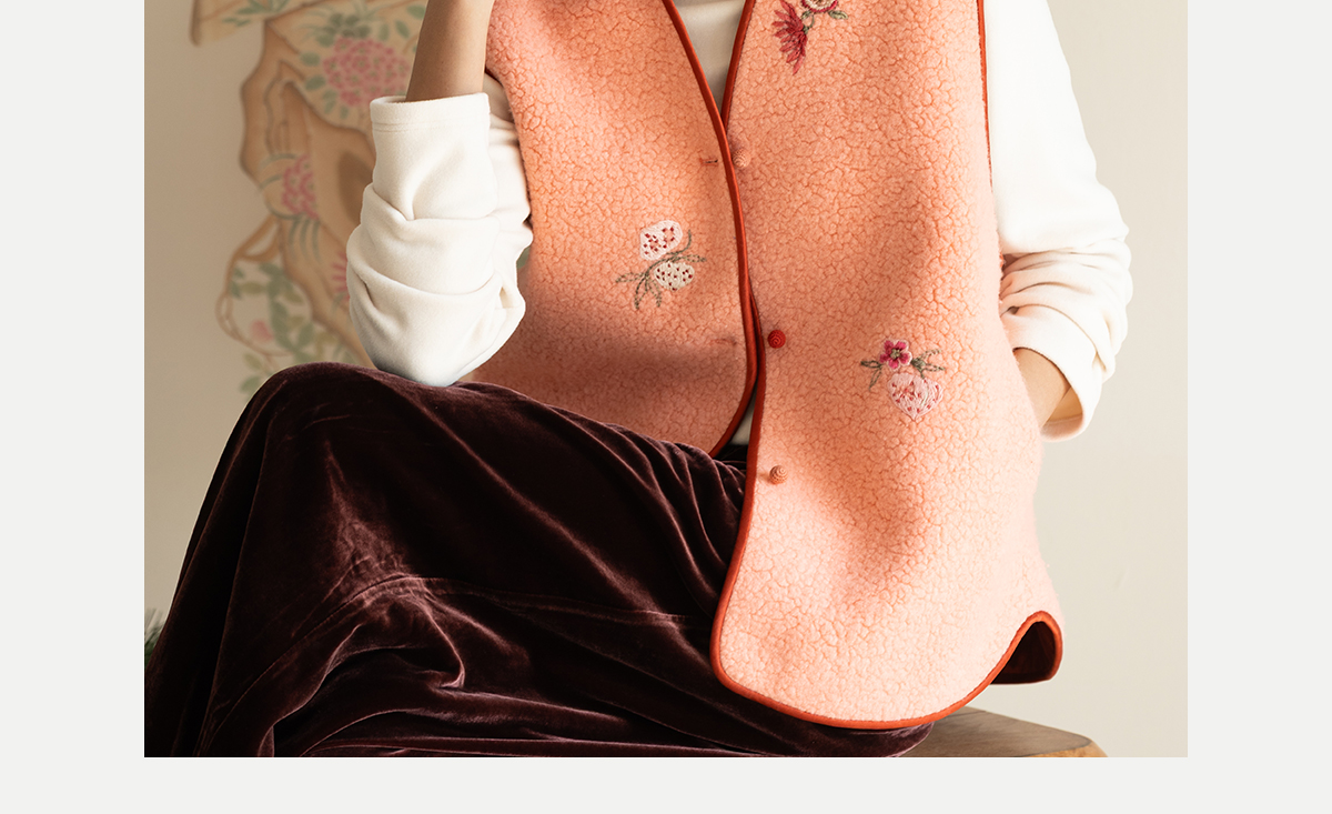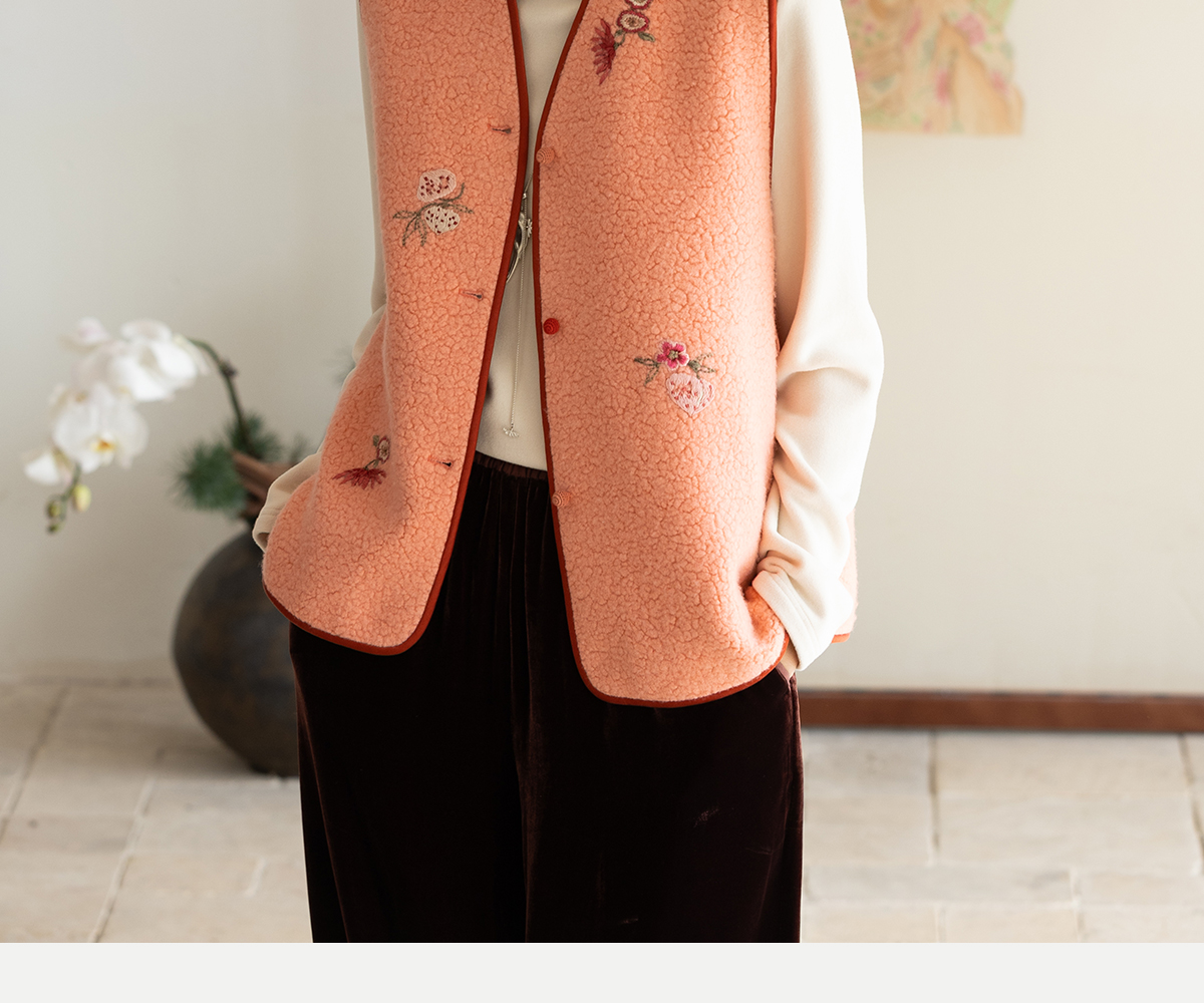 牧衣游原创 手工刺绣进口羊毛混纺羊羔毛马夹女新款红色开衫 离歌