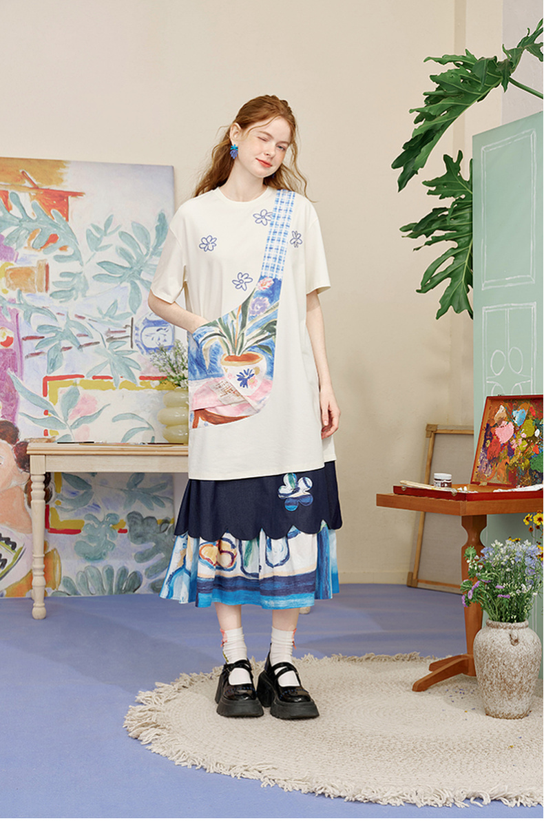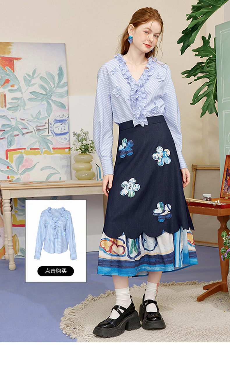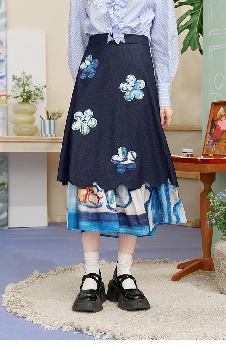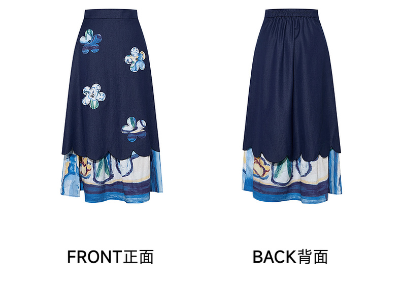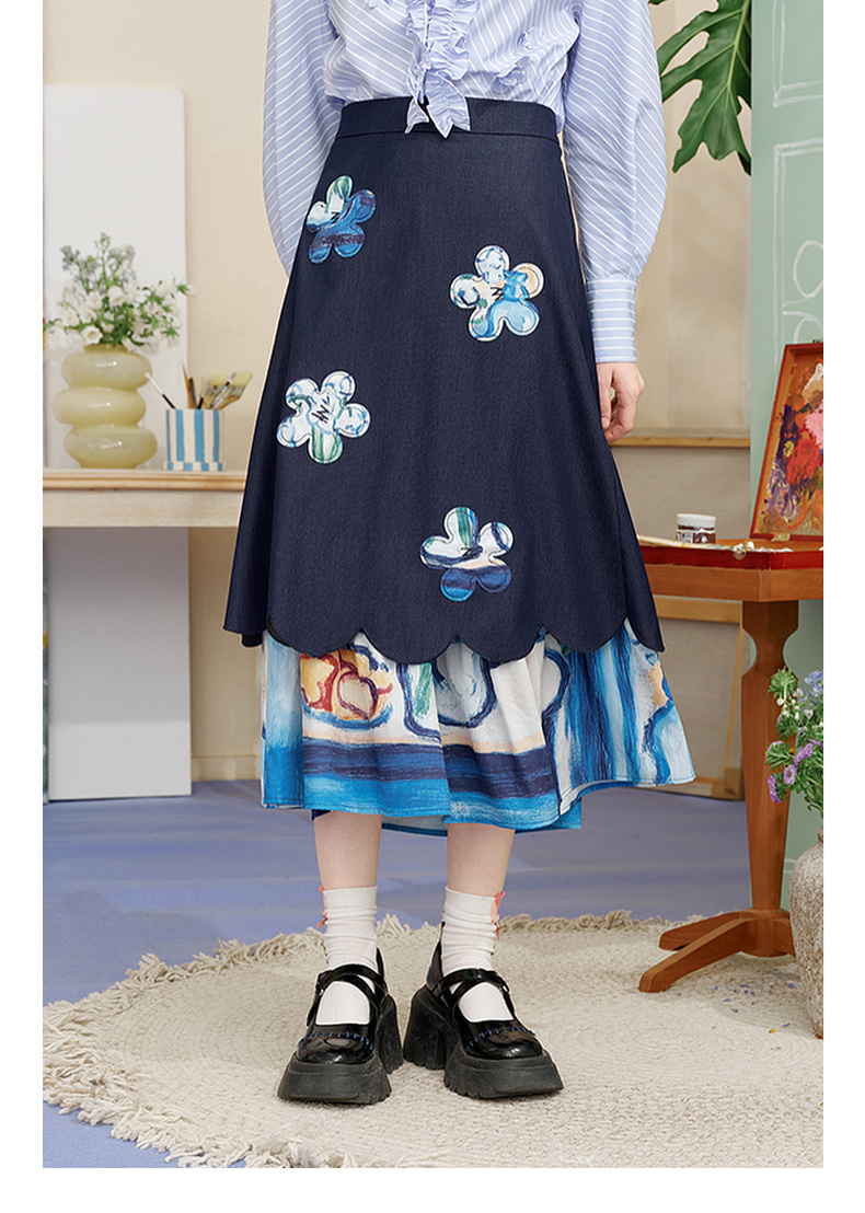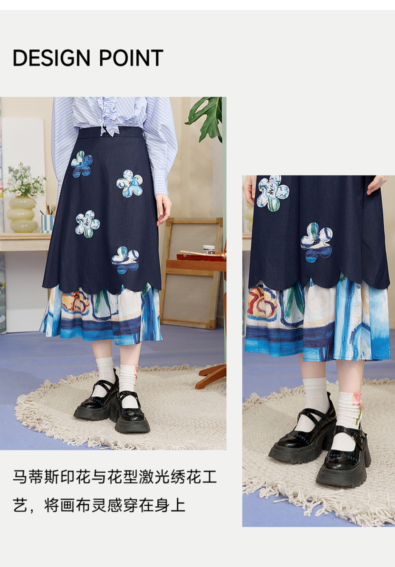 两三事虚掷花期2025夏新款森女风印花拼接双层裙摆绣花A字半身裙