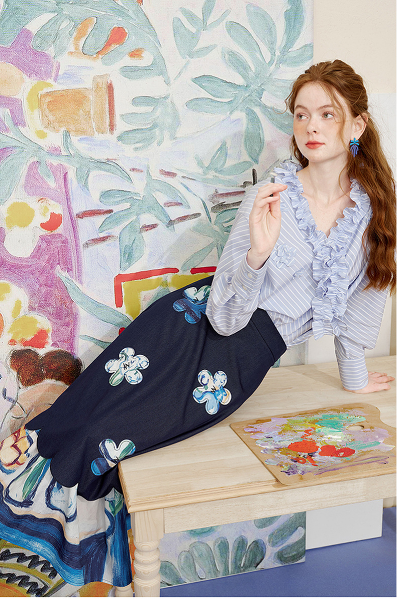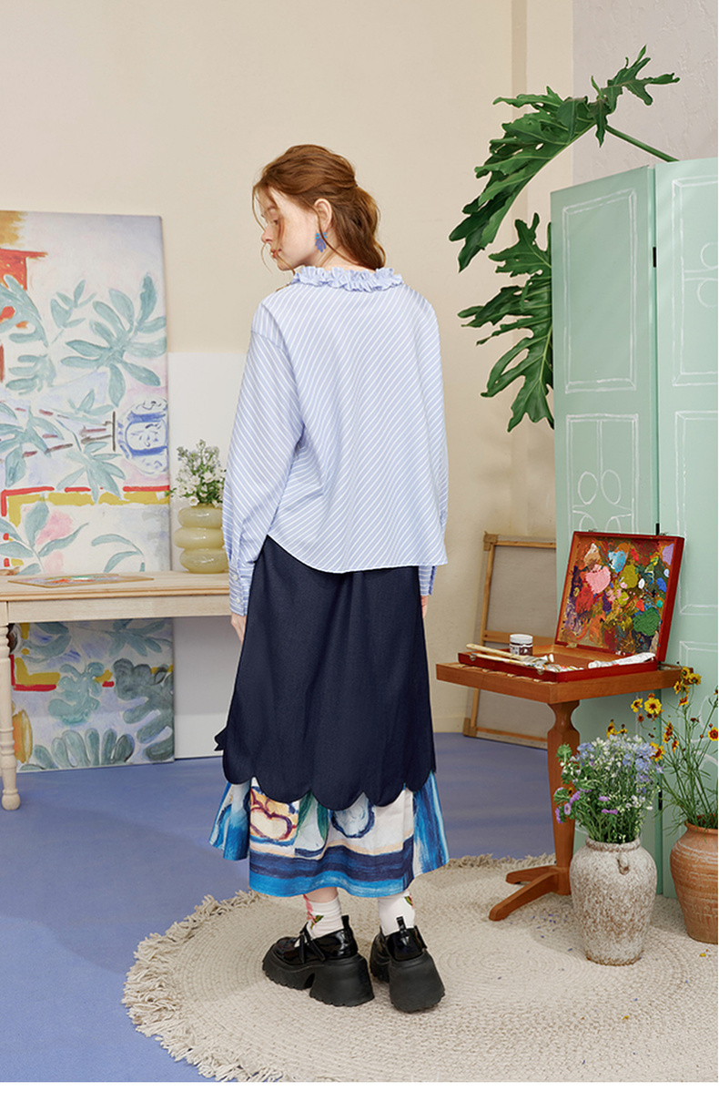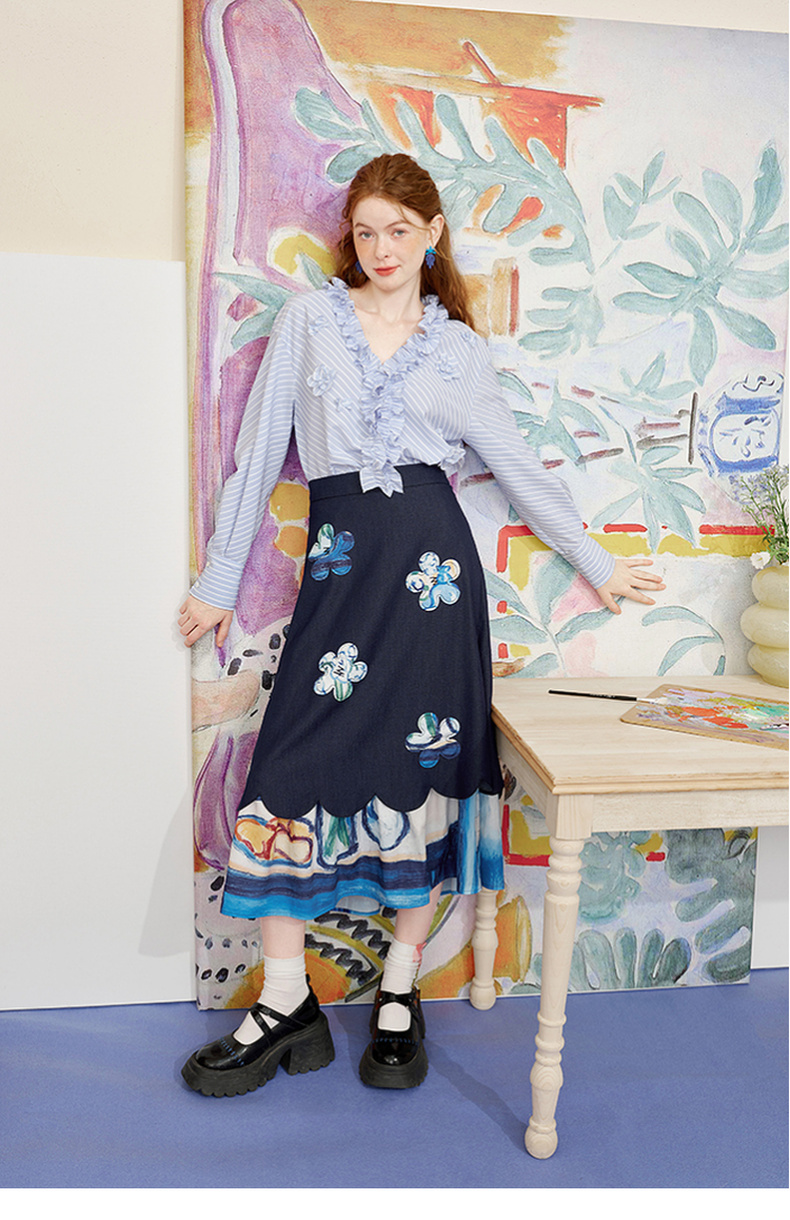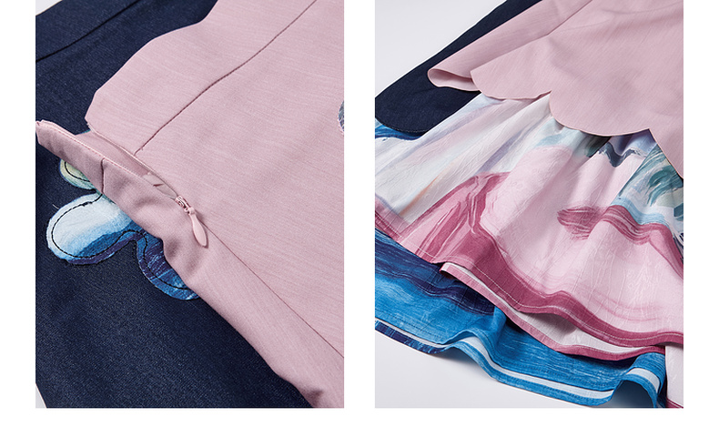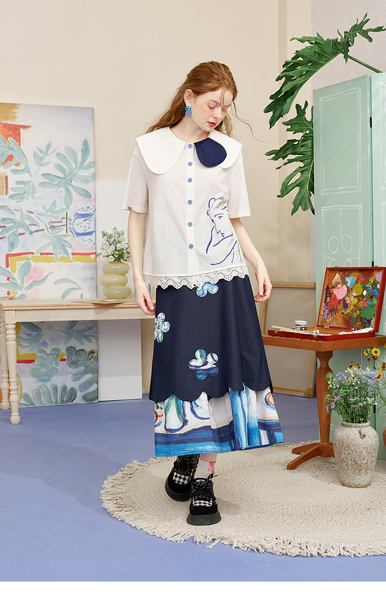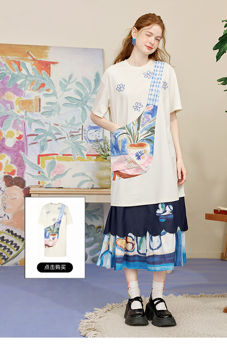 两三事虚掷花期2025夏新款森女风印花拼接双层裙摆绣花A字半身裙