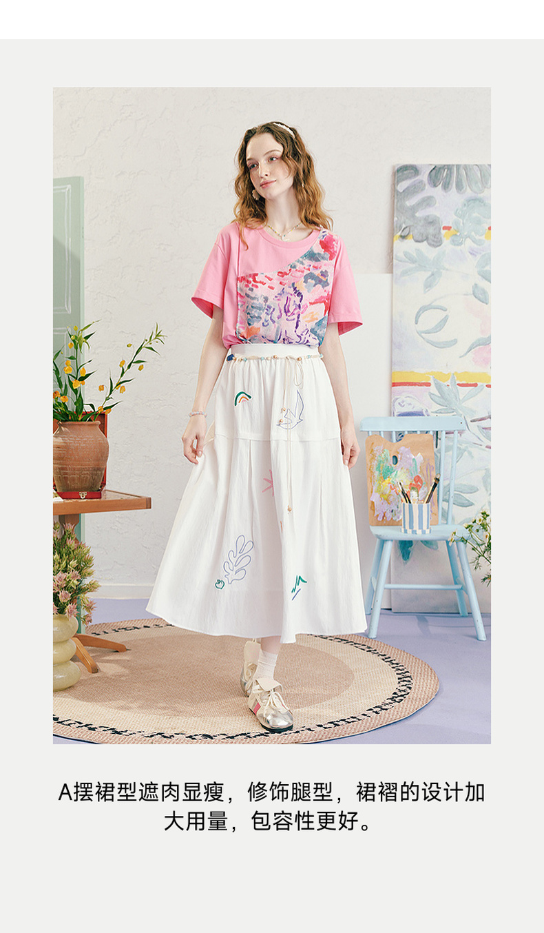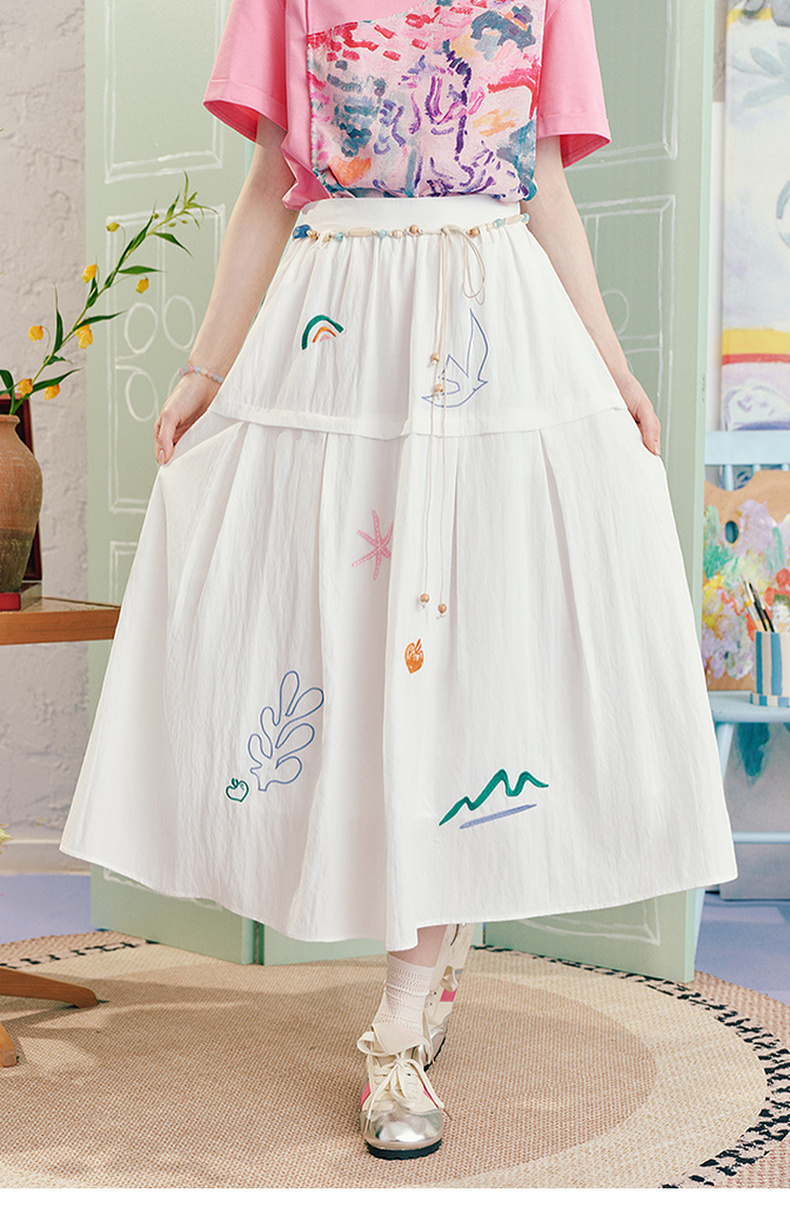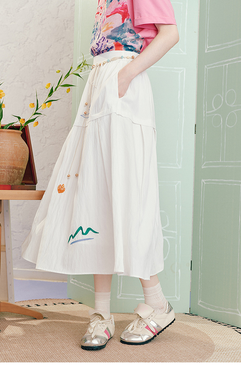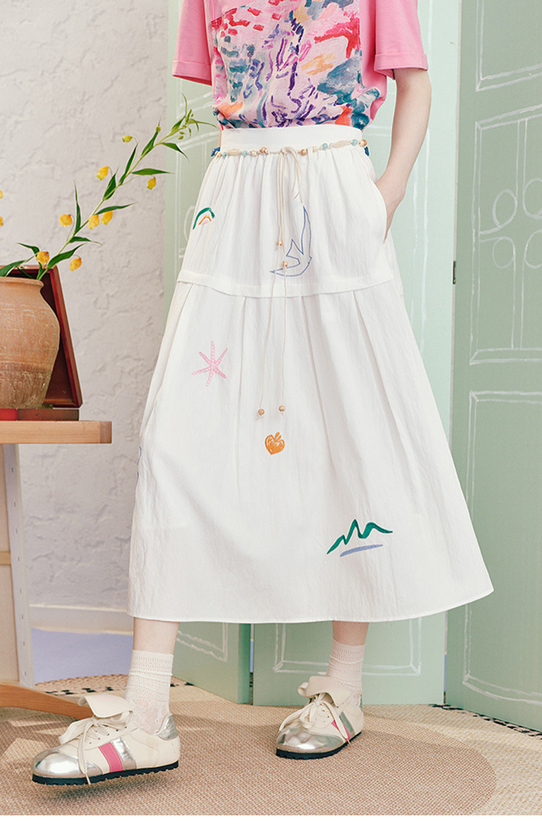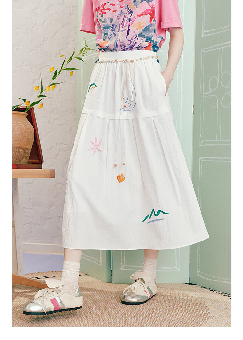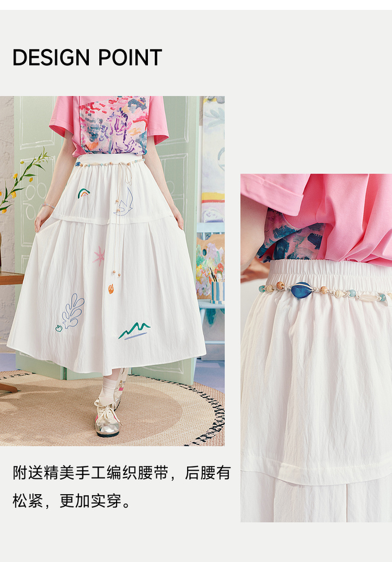 两三事 浪沫糖绘 2025夏季新款小清新绣花串珠腰绳a字半身裙长裙