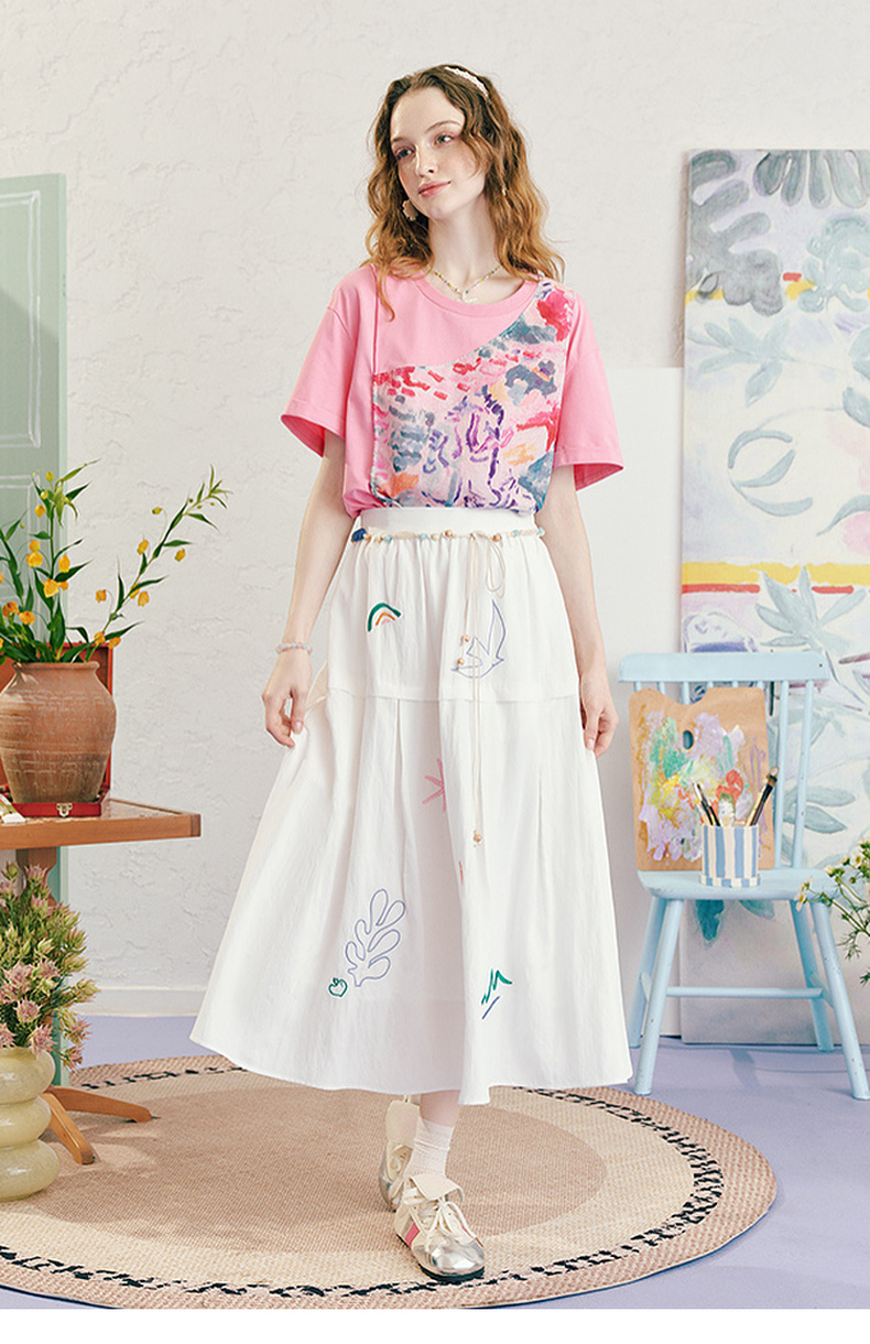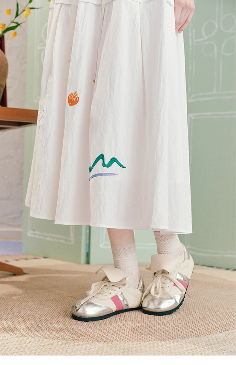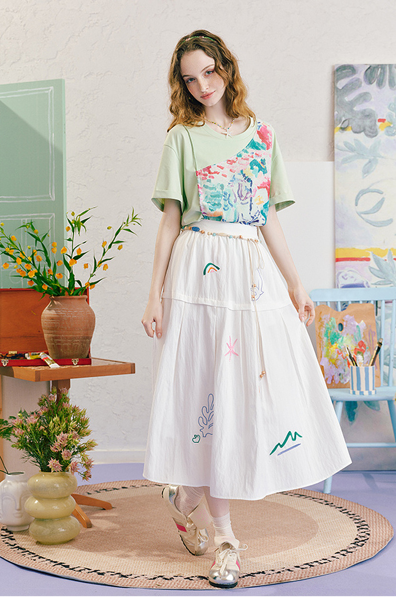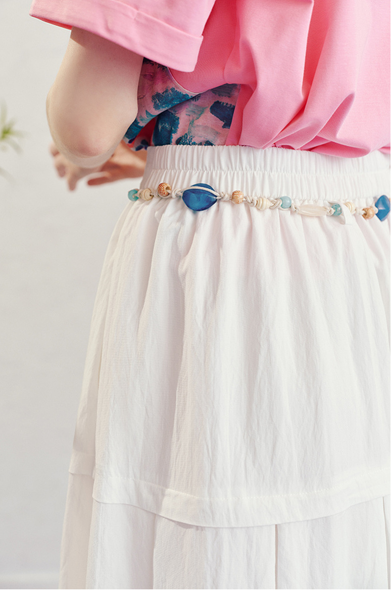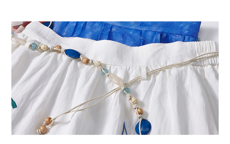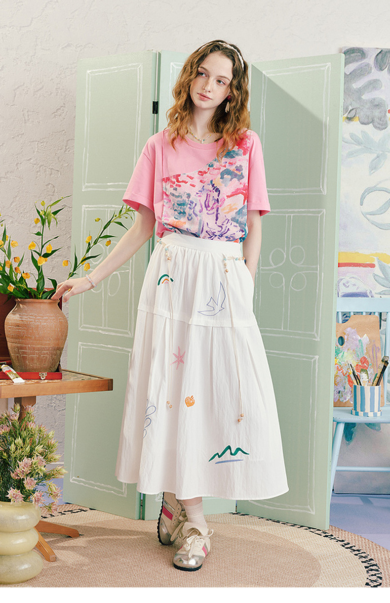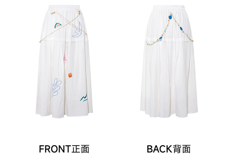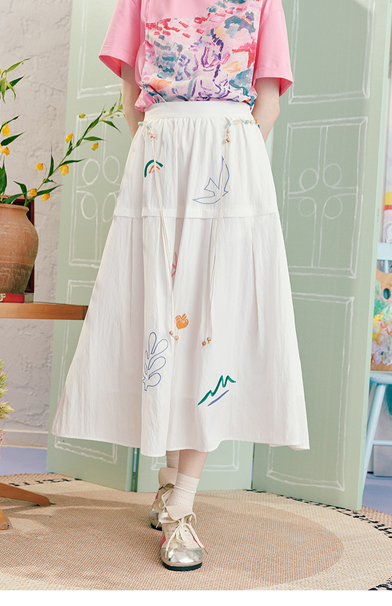 两三事 浪沫糖绘 2025夏季新款小清新绣花串珠腰绳a字半身裙长裙