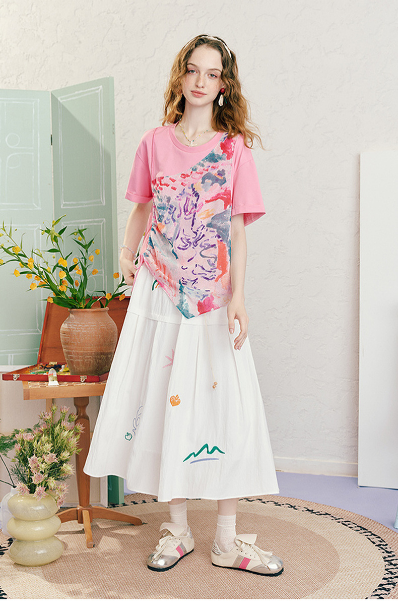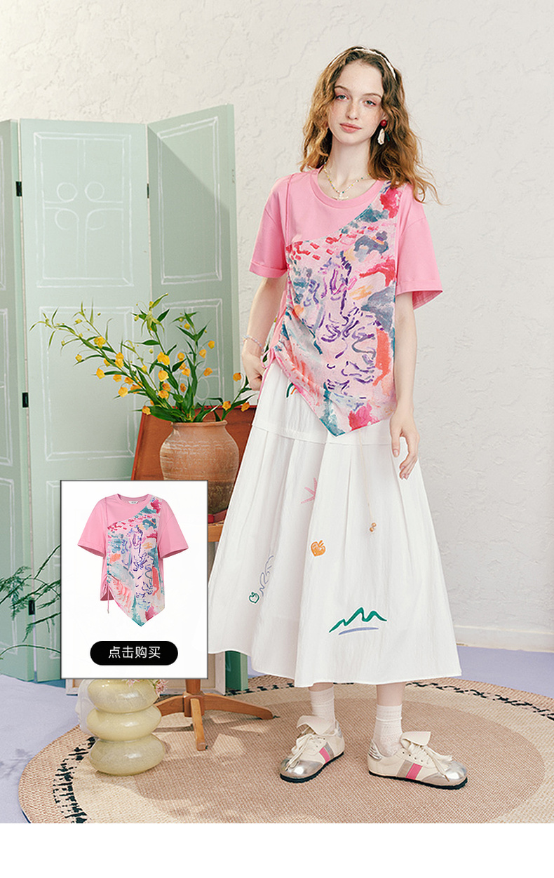 两三事2024夏季新款甜美蕾丝印花拼接假两件t恤女宽松