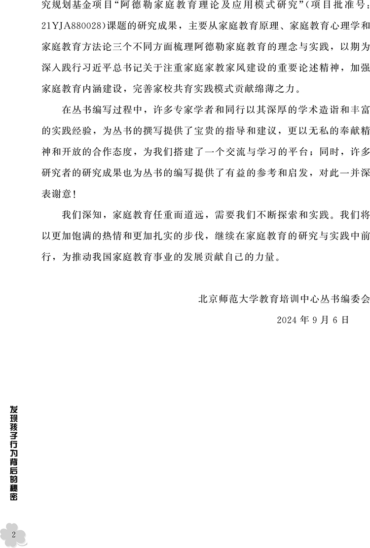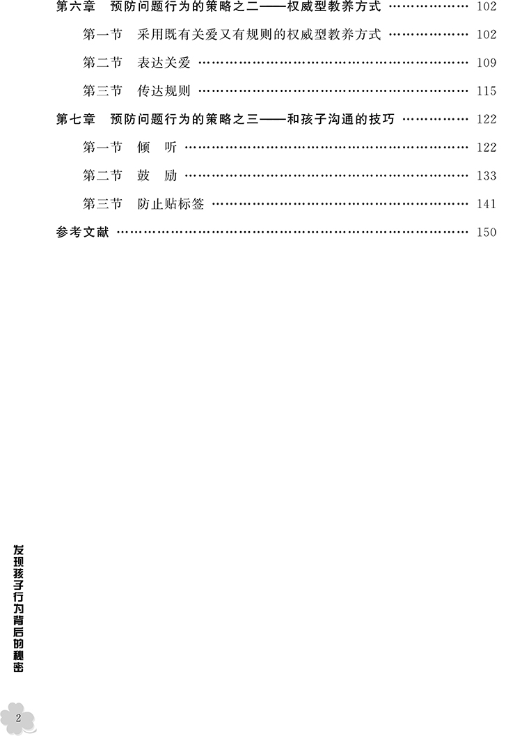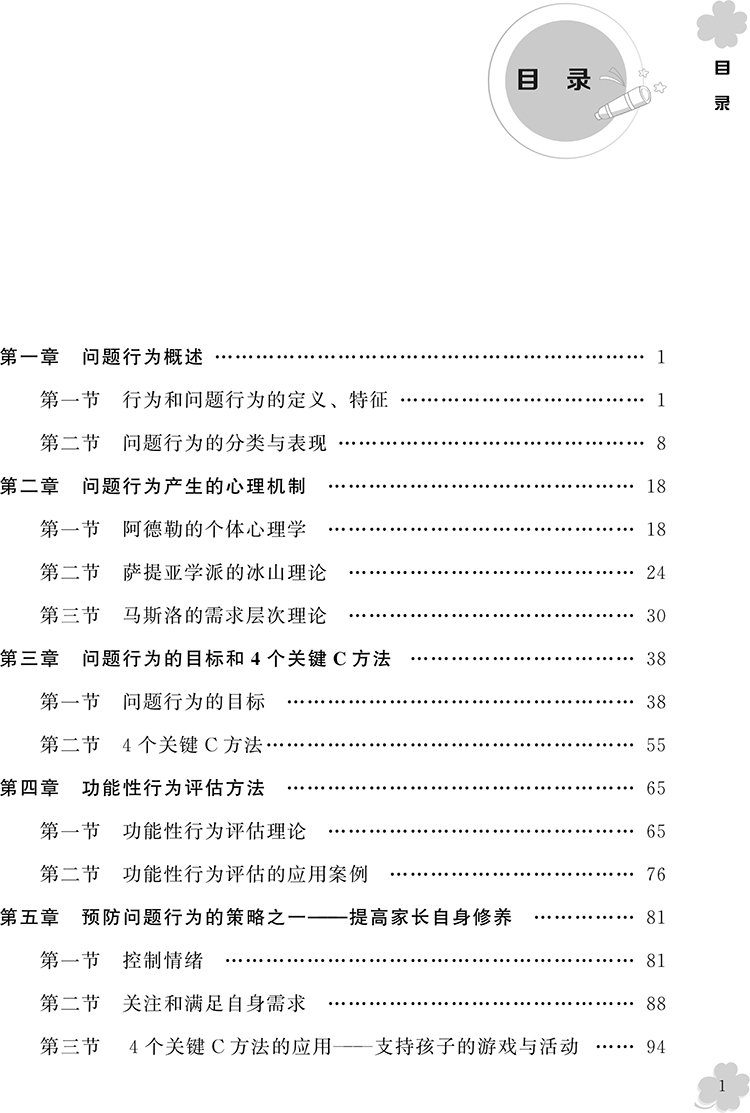 本书内容主要包括:第一章问题行为概述,第二章问题行为的适宜应对策略,第三章问题行为的四个目标和4个关键C理论,第四章问题行为的行为功能评估方法,第五章预防问题行为的出现——提高父母自身修养,第六章预防问题行为的出现——权威型教养方式,第七章预防问题行为的出现——和孩子沟通的技巧。本书将阿德勒心理学、家庭教育核心技能、儿童教育心理学等融合创新,是理论、案例、策略内容三元合一的家庭教育指导书籍,不仅能帮助家长了解儿童身心发展与成长规律,提升家长育儿能力,还能为学前、中小学教师和家庭教育指导师的实际工作提供理论指导和实践参考,兼具科学性和实用性。