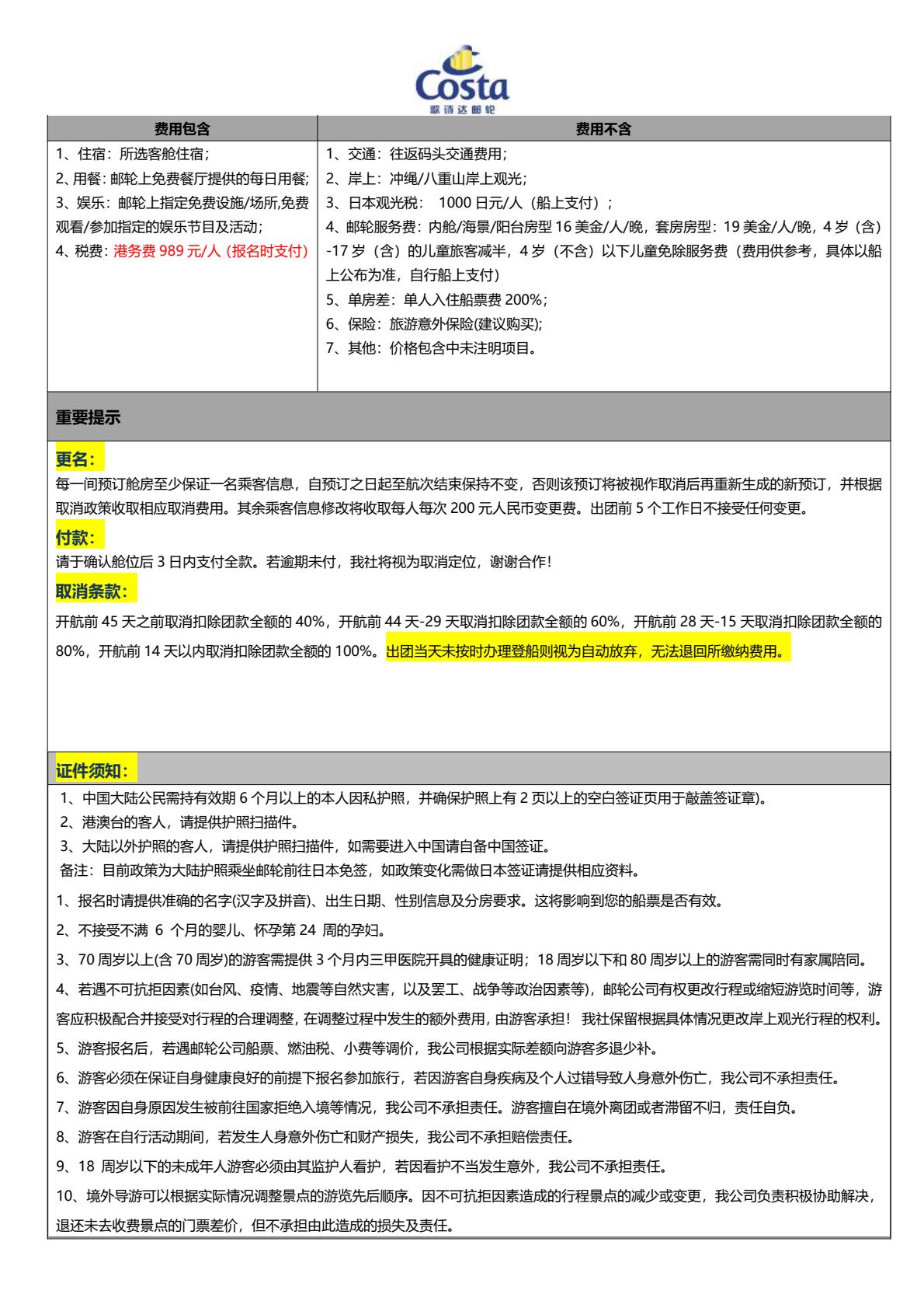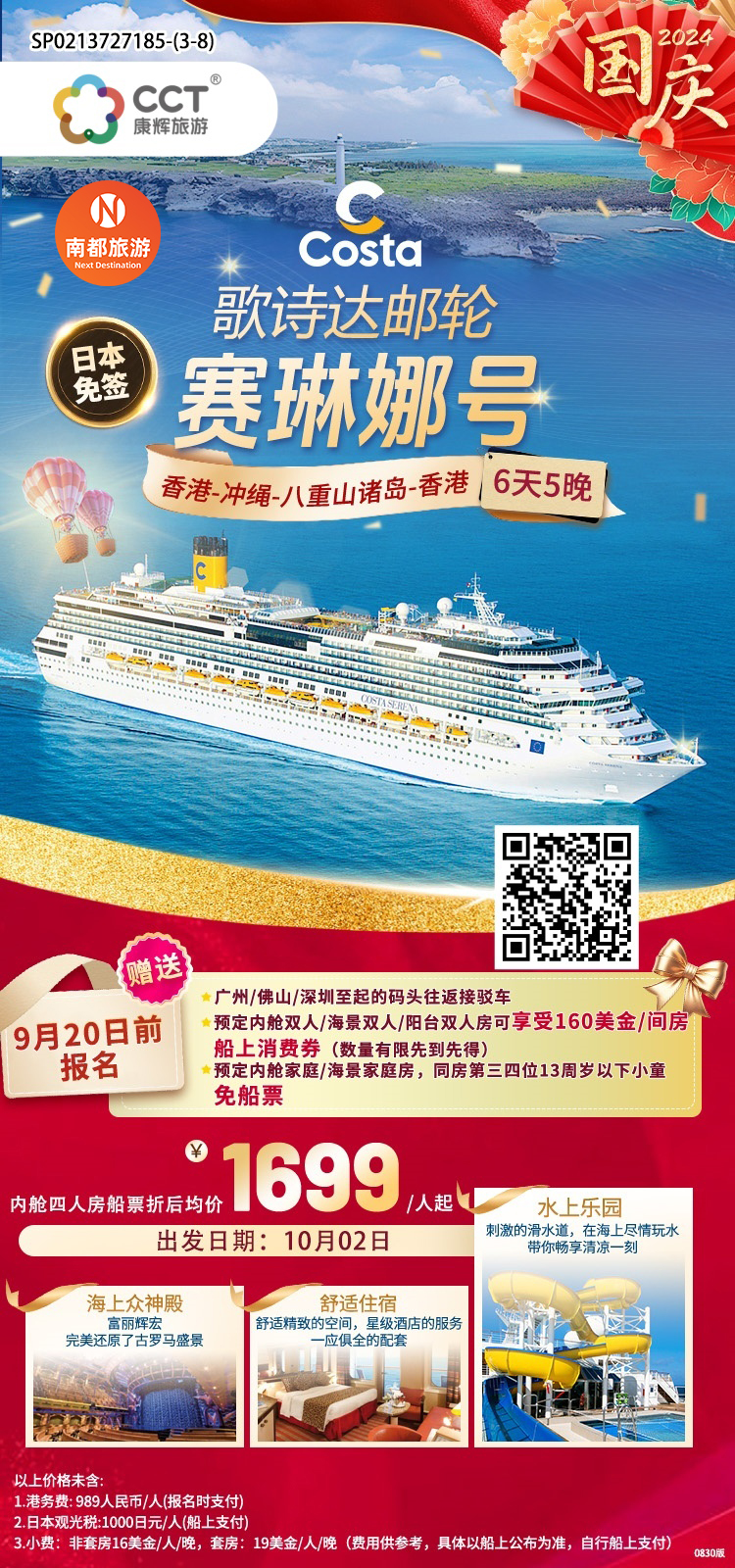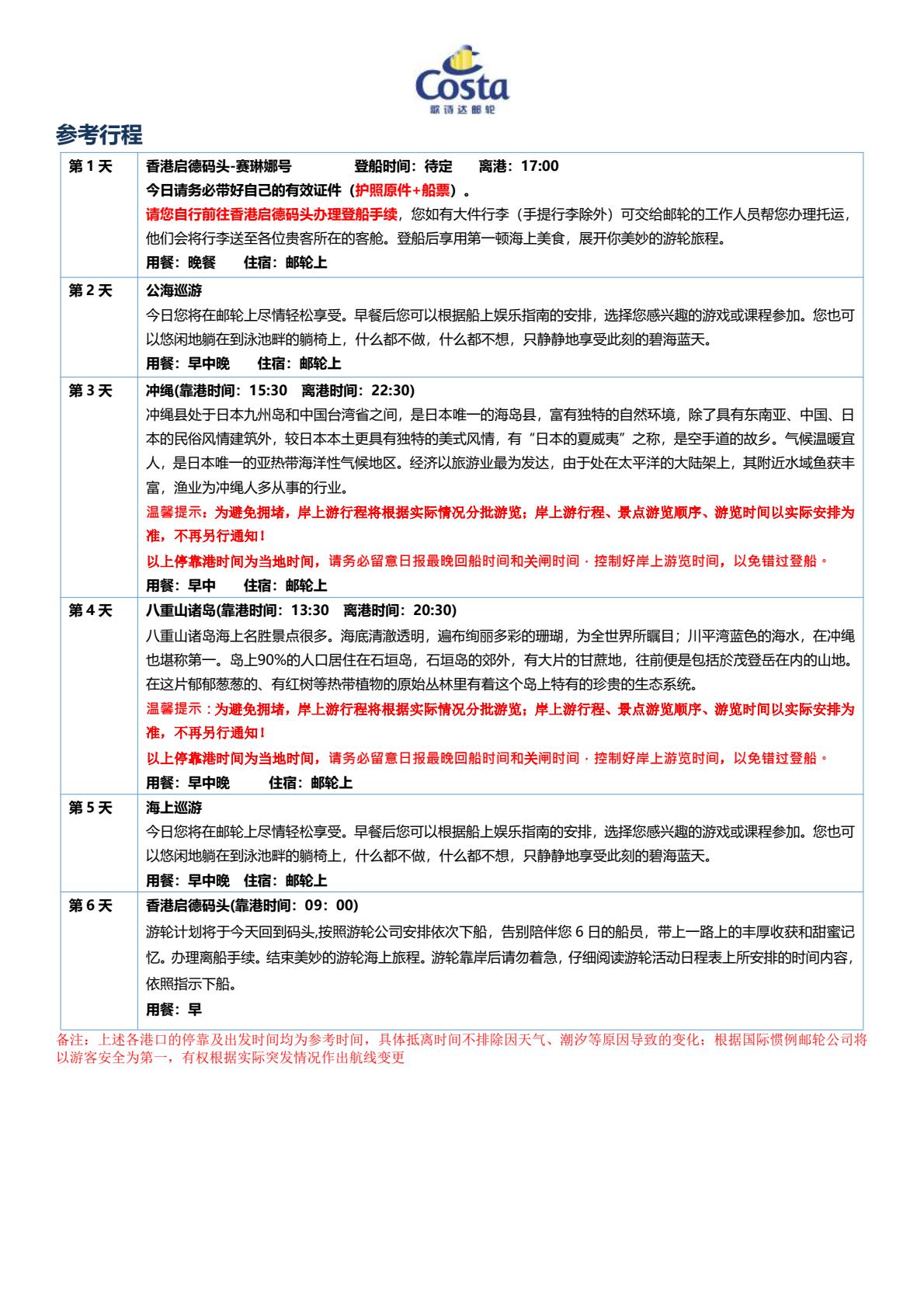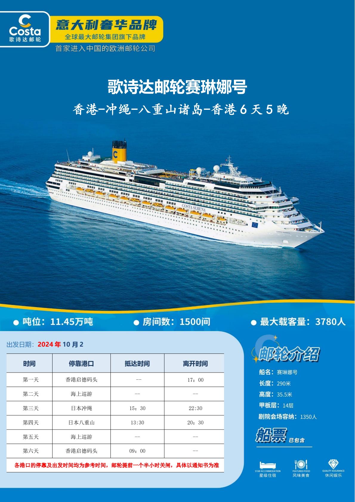 歌诗达邮轮-<赛琳娜号>香港-冲绳-八重山诸岛-香港6天5晚(国庆出发)