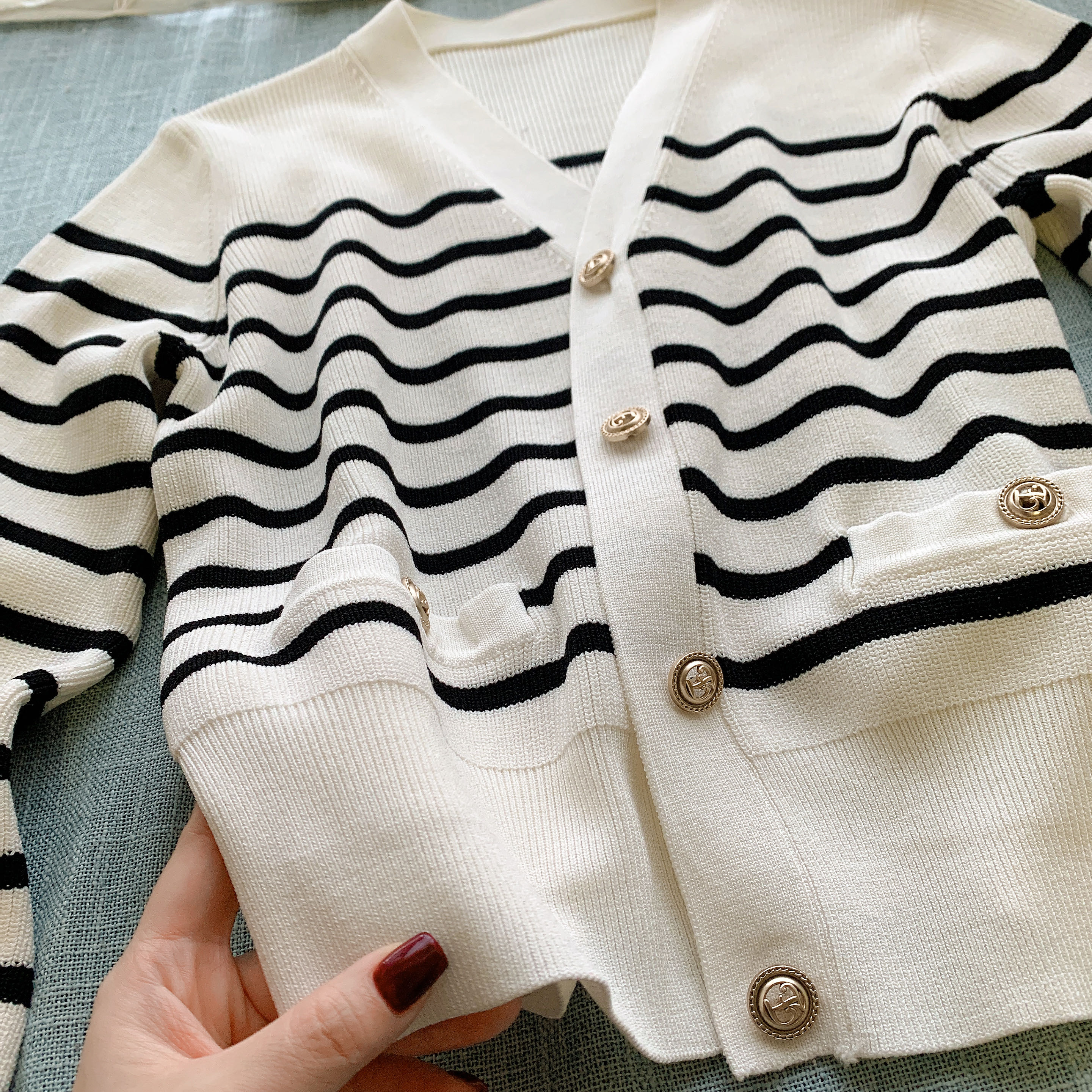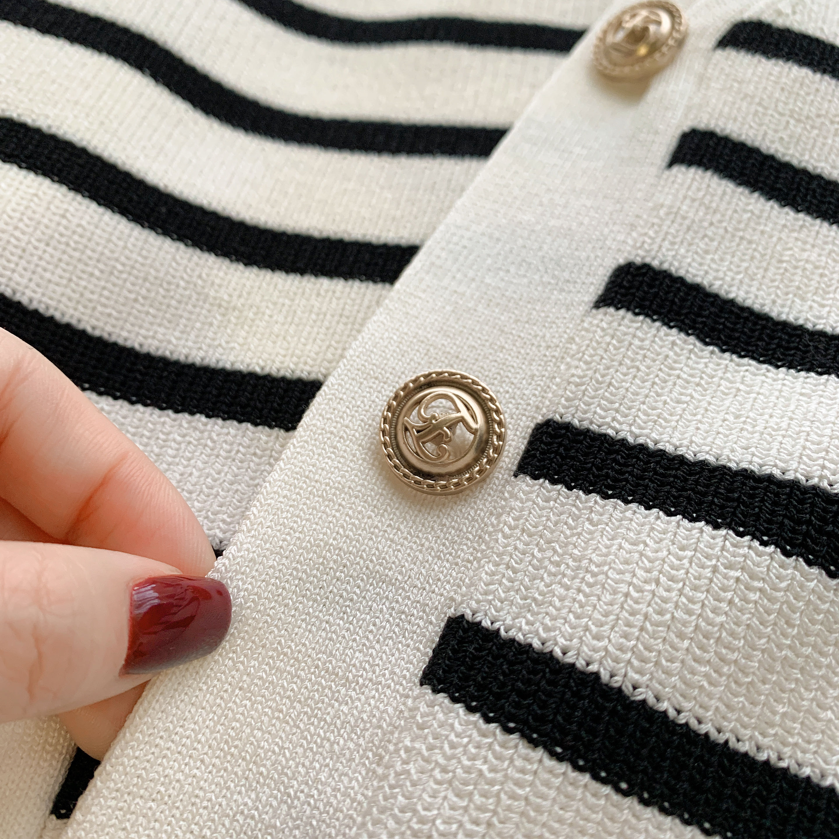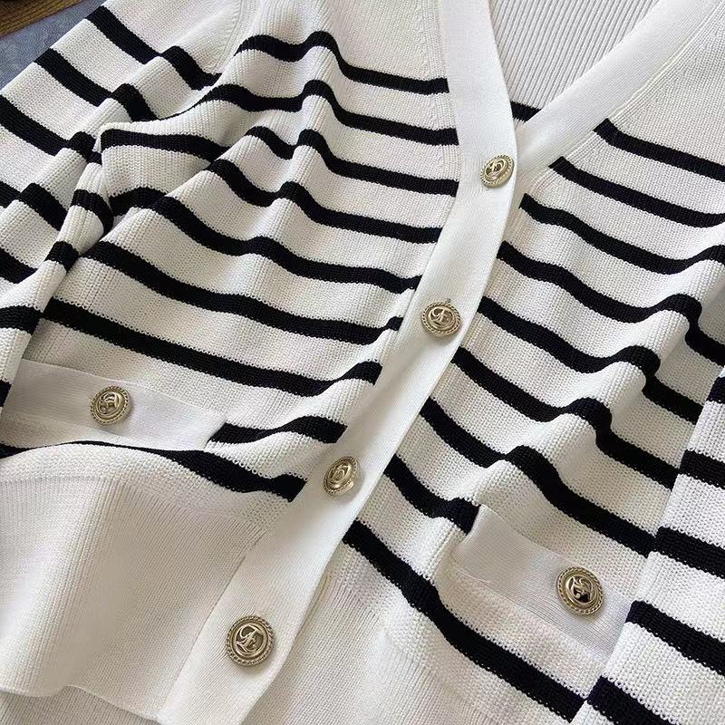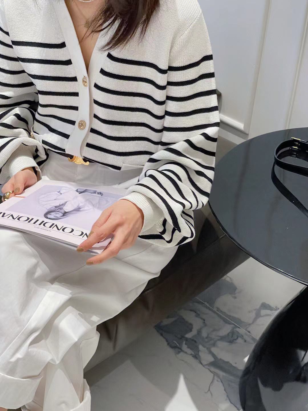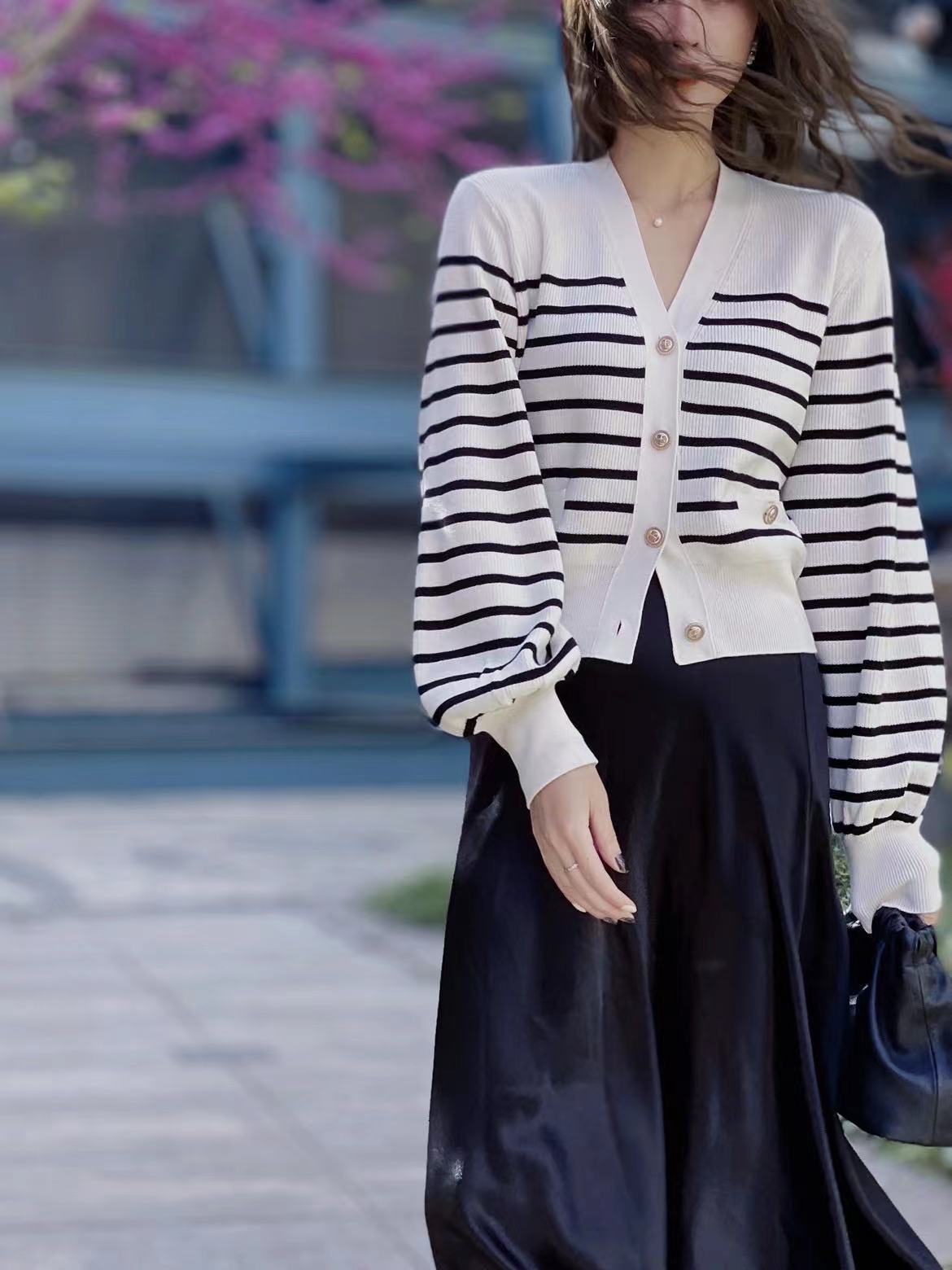 商品名称:条纹金扣开衫V领小众设计感针织衫(黑白条纹)S-L