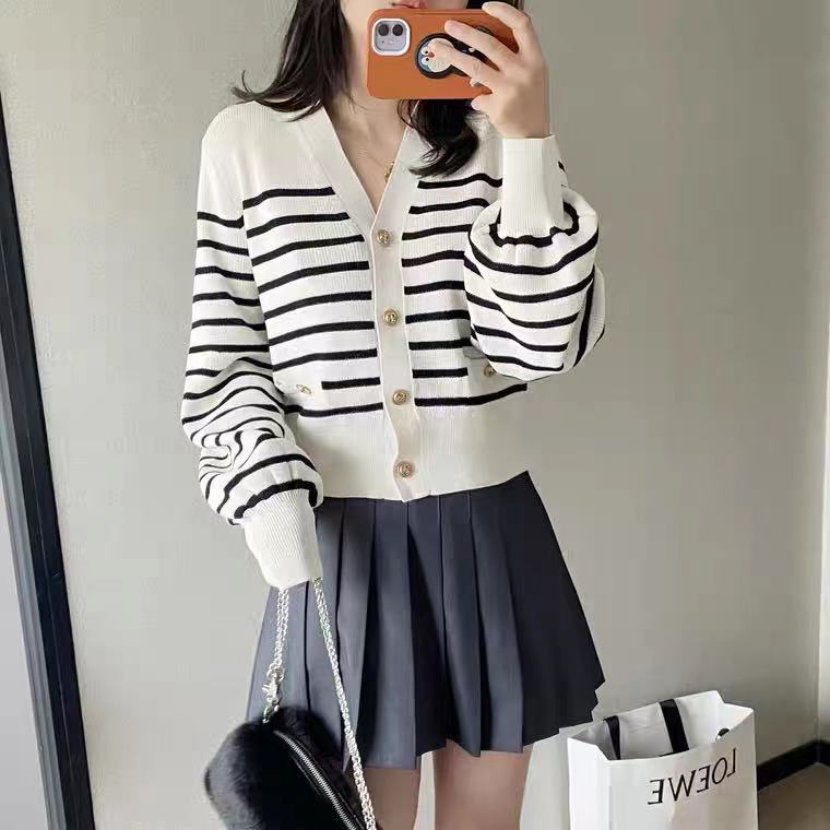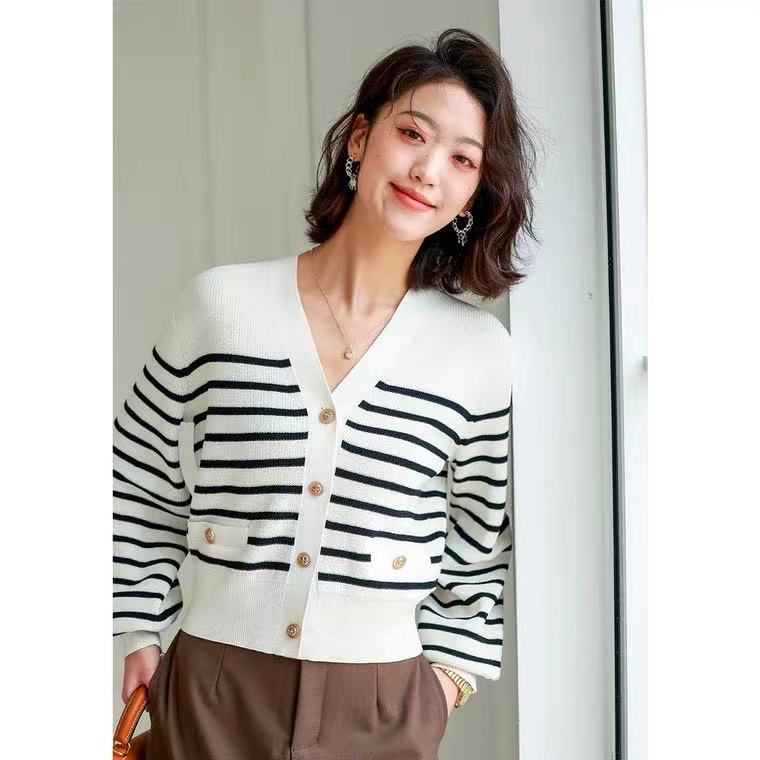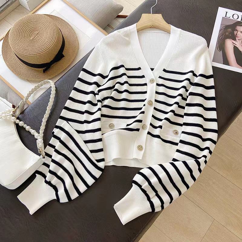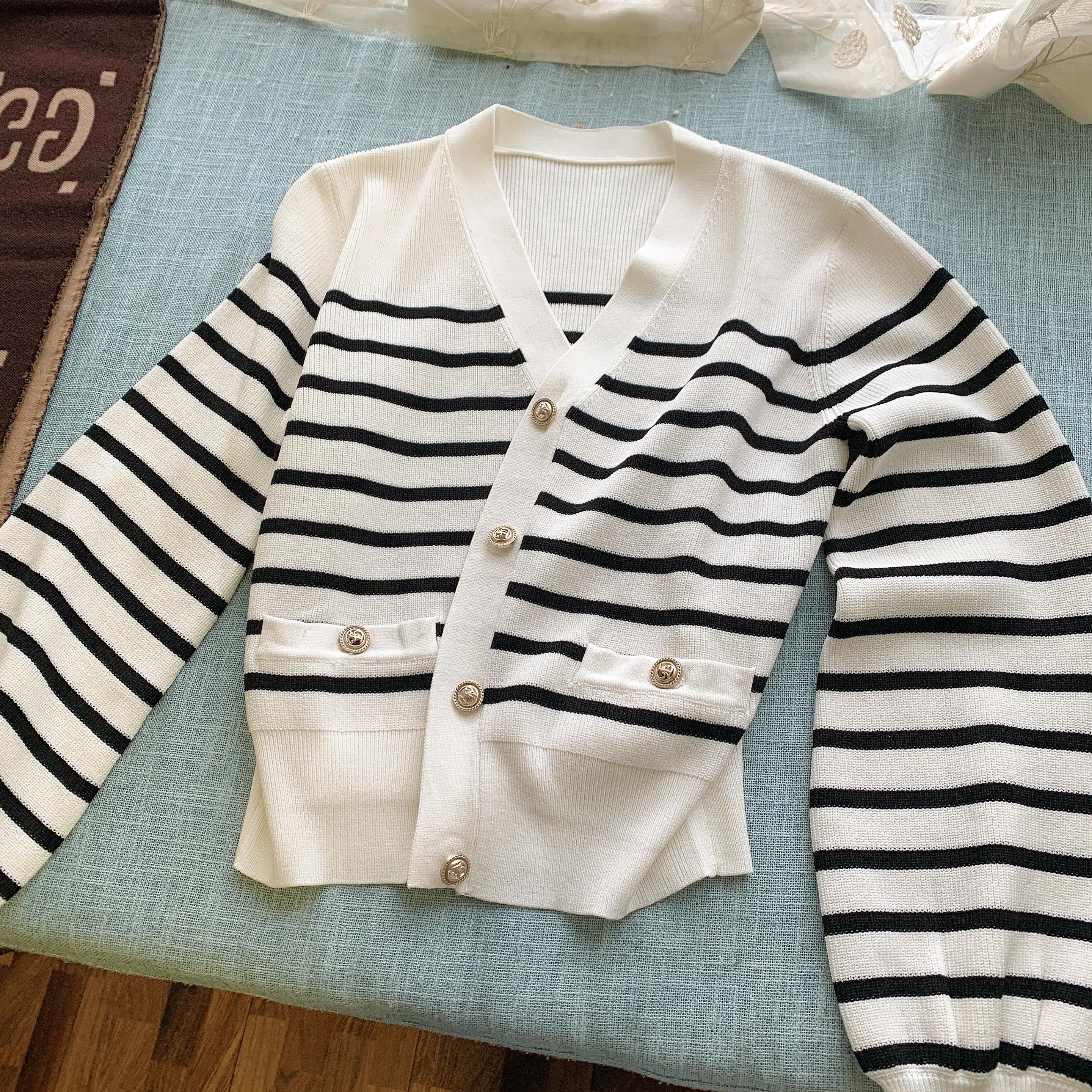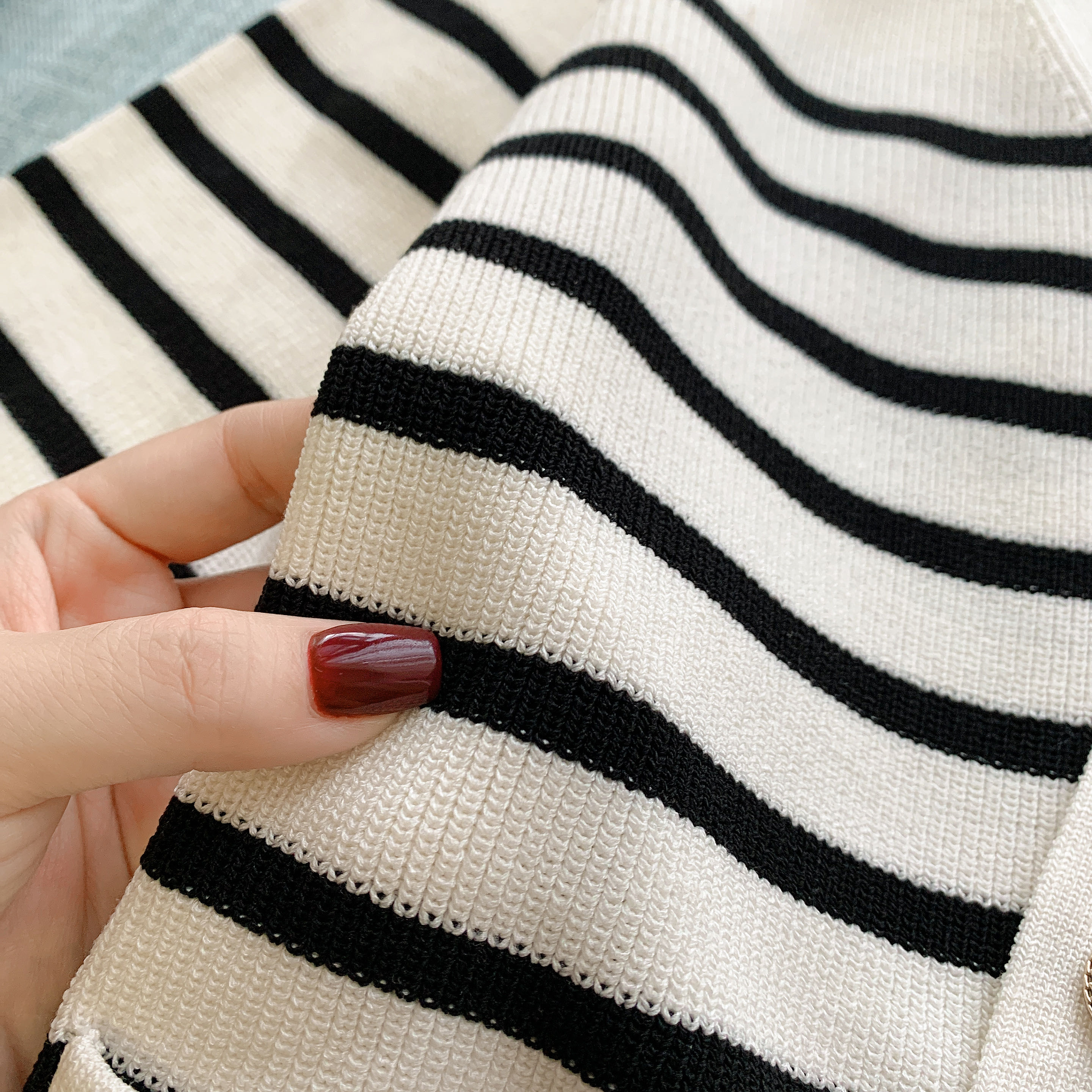 商品名称:条纹金扣开衫V领小众设计感针织衫(黑白条纹)S-L