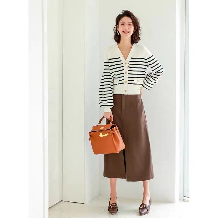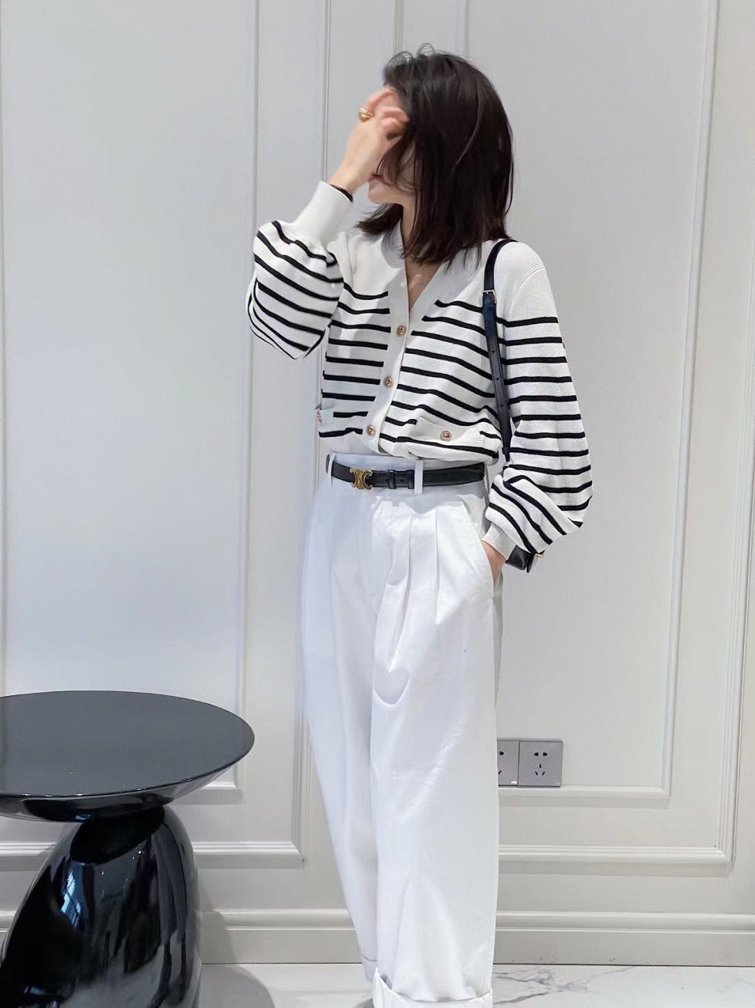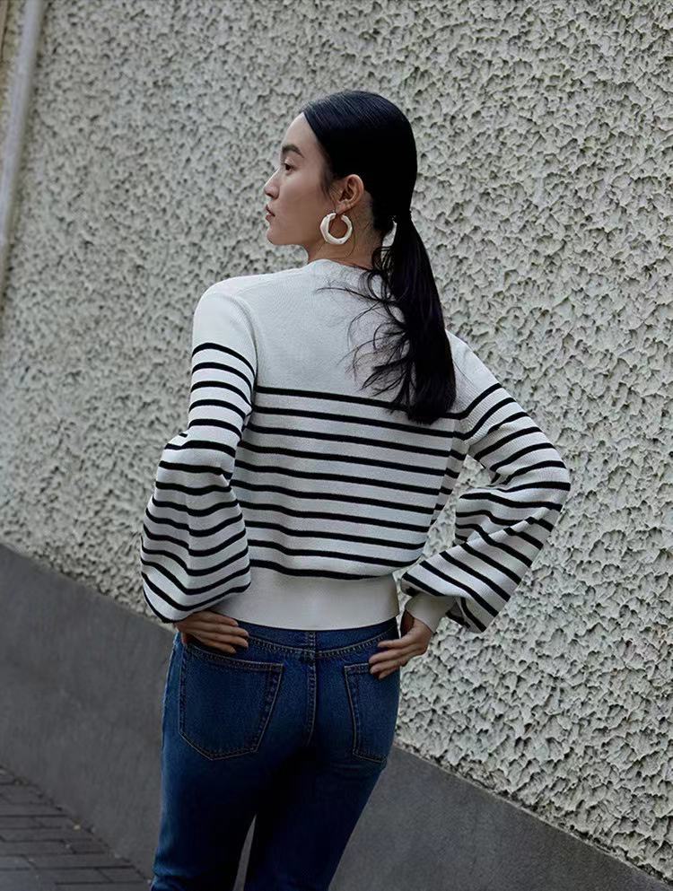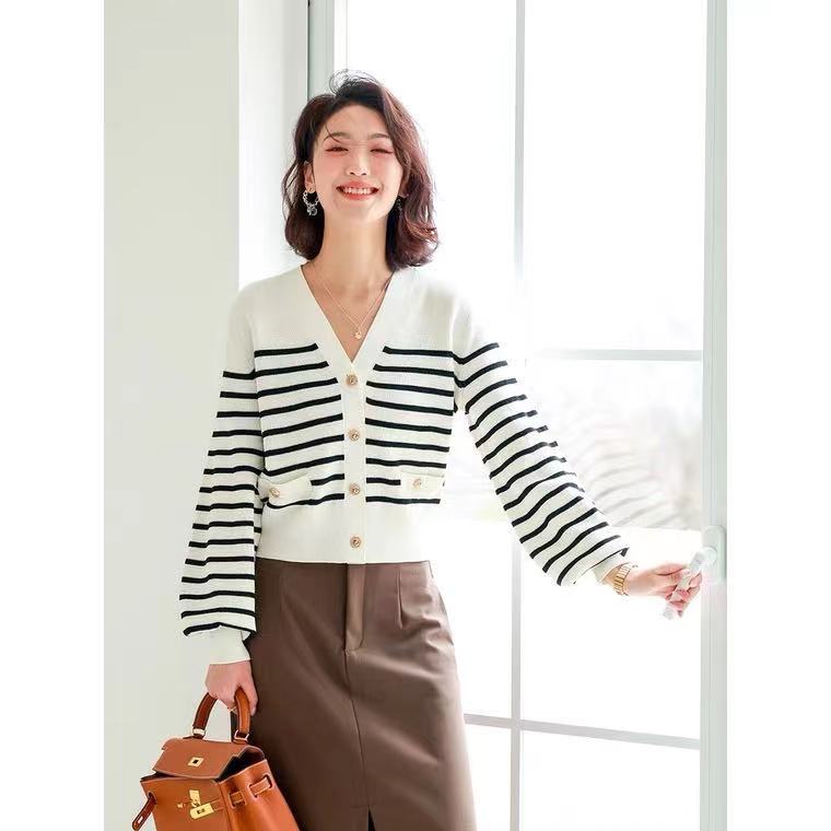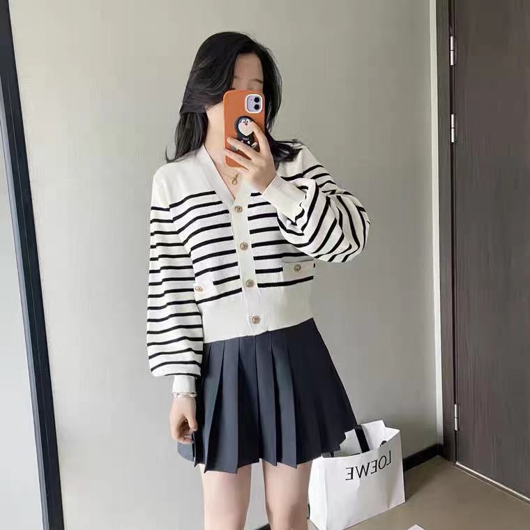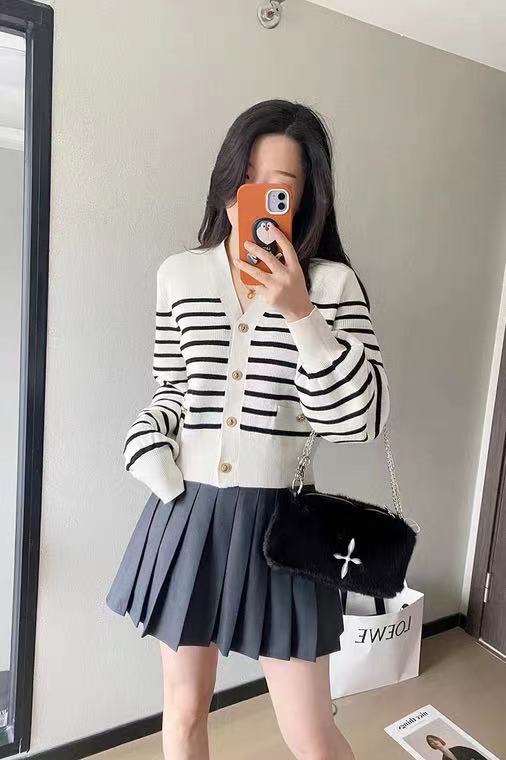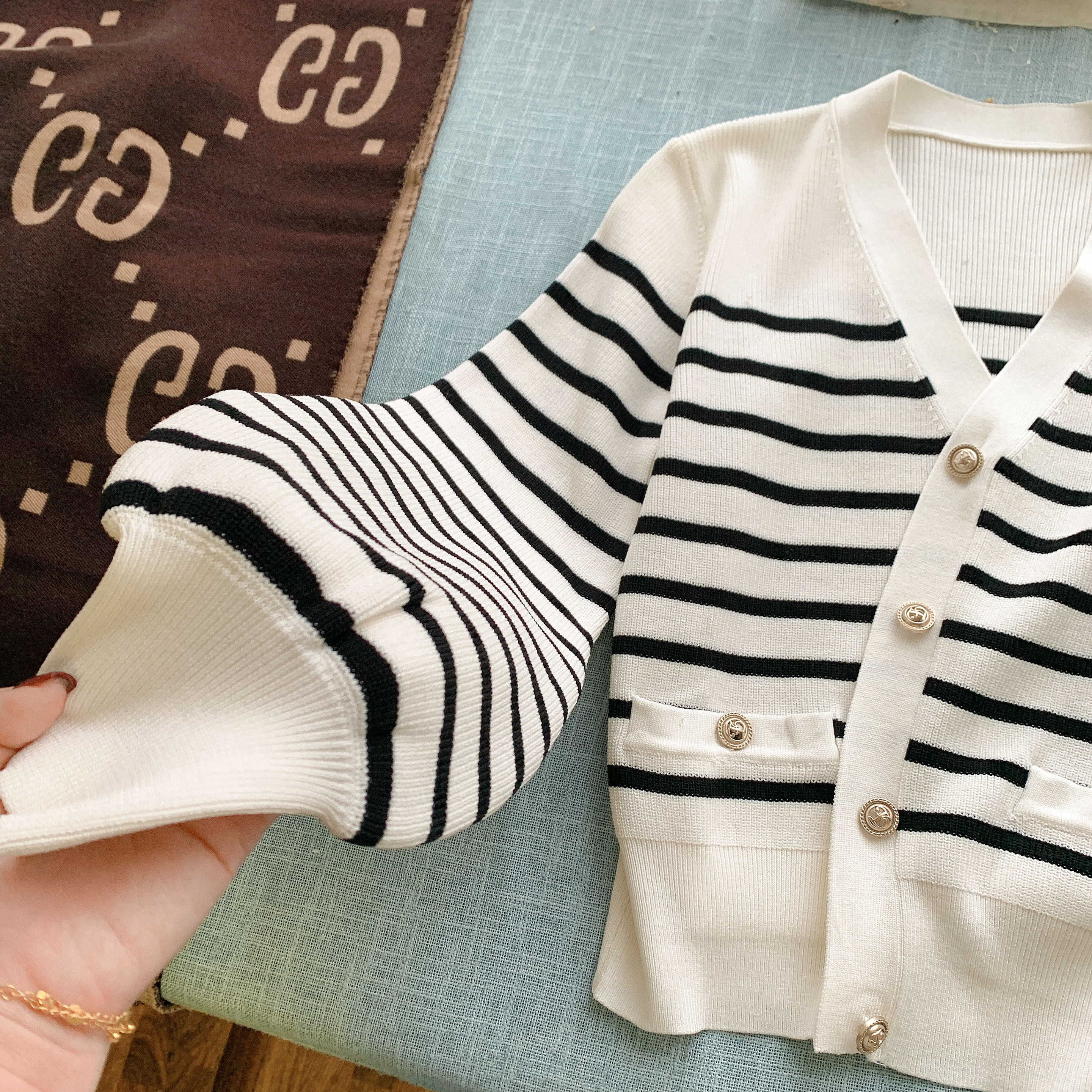 商品名称:条纹金扣开衫V领小众设计感针织衫(黑白条纹)S-L