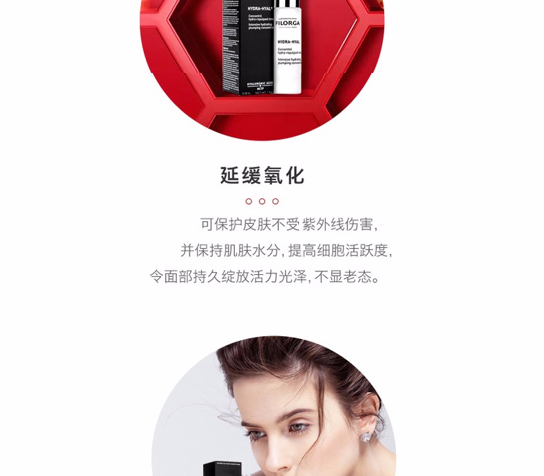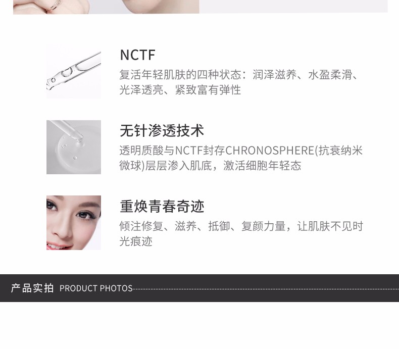 - 透明质酸具有渗透保湿锁水功效,保湿、细滑、丰盈肌肤,为肌肤提供及时长效的深层补水效果。