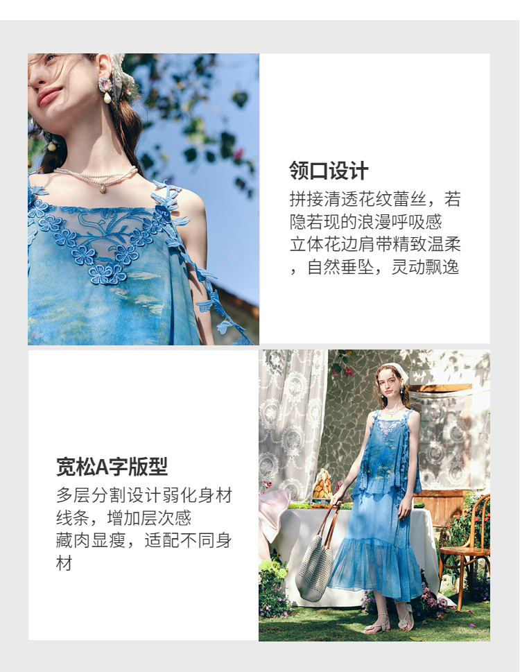 两三事 始夏蝉鸣 2026春季新款小清新蕾丝拼接印花花边吊带连衣裙