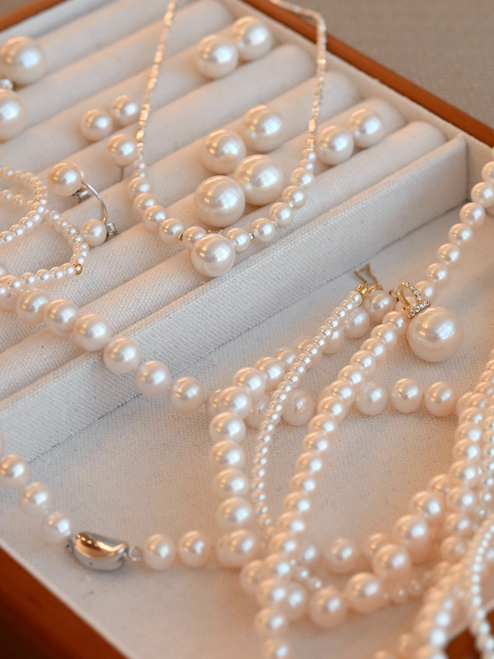 但我们毫不犹豫,就决定了要批发珍珠,自己来定制款式和配件,只因对这个光泽的珍珠一件钟情,市面上太少见了。