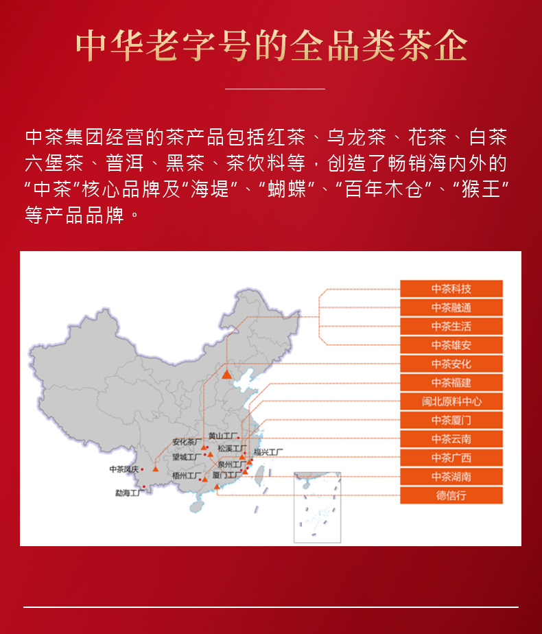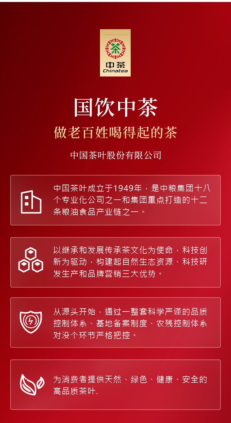 - 中茶是中粮集团十八个专业化公司之一和集团重点打造的十二条粮油食品产业链之一。中国茶叶以继承和发展中华传统茶文化为使命,秉承自然、生态、安全、健康的理念。