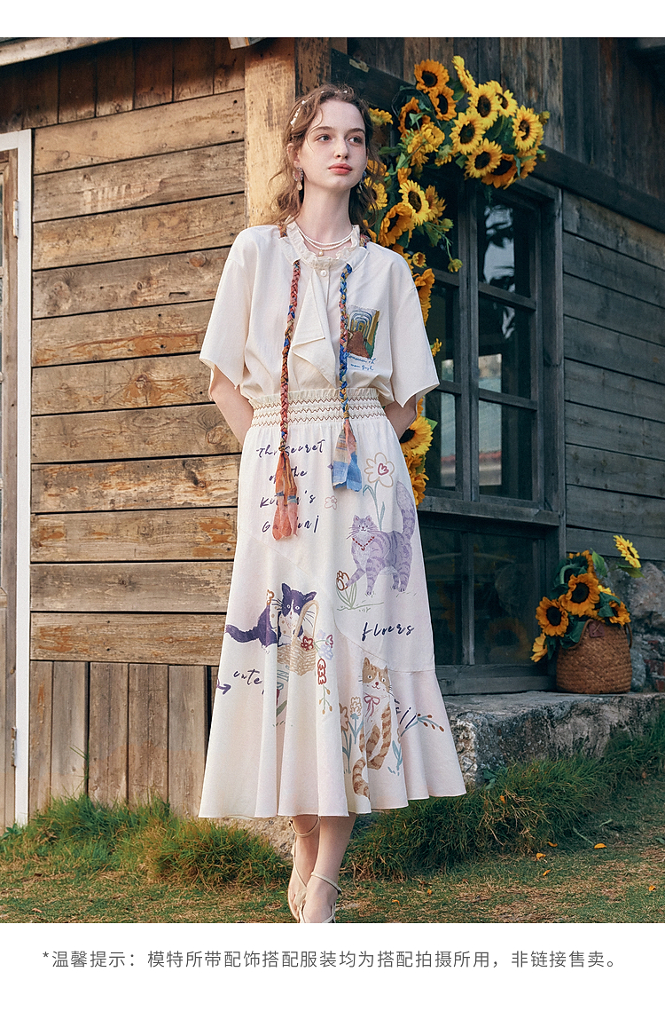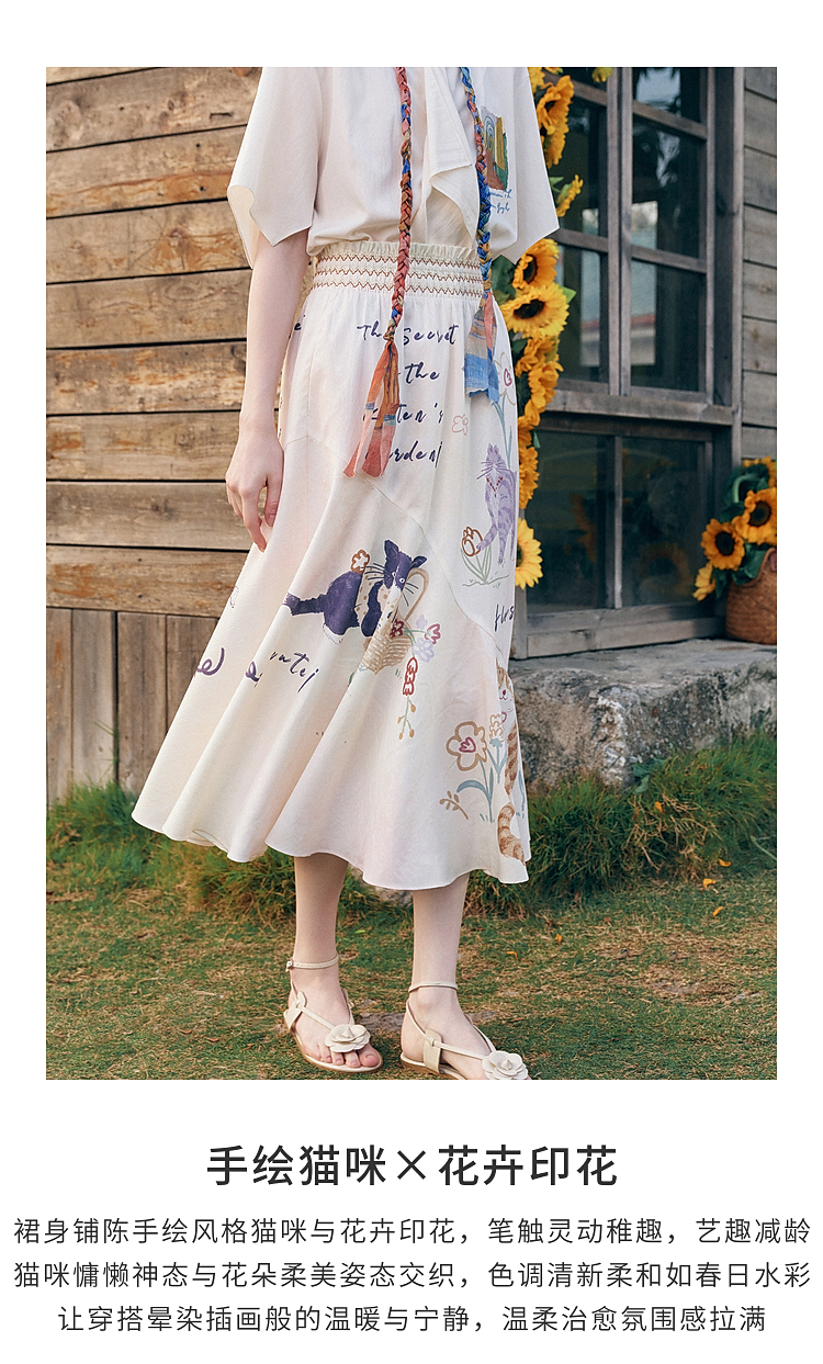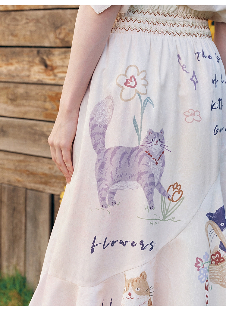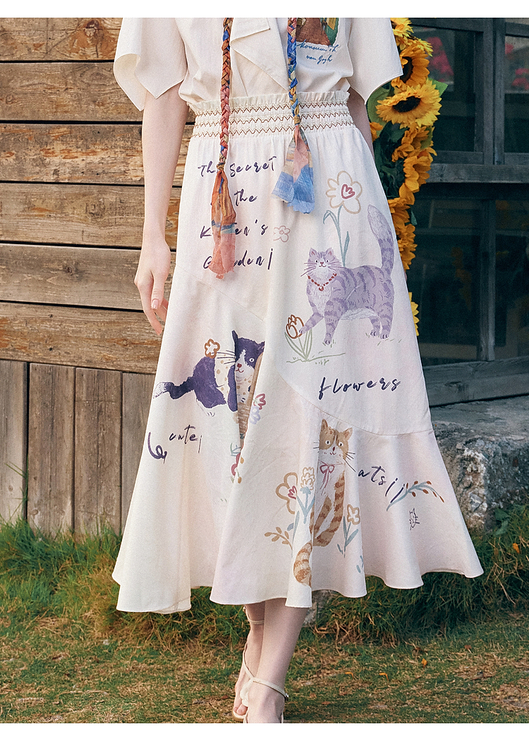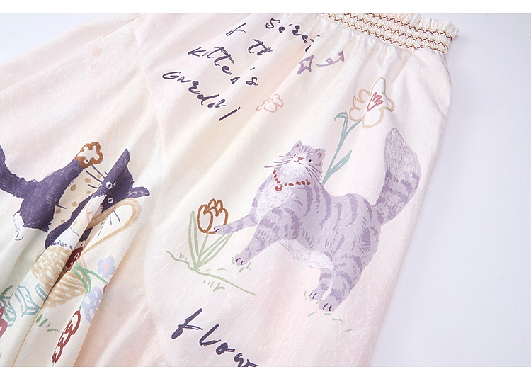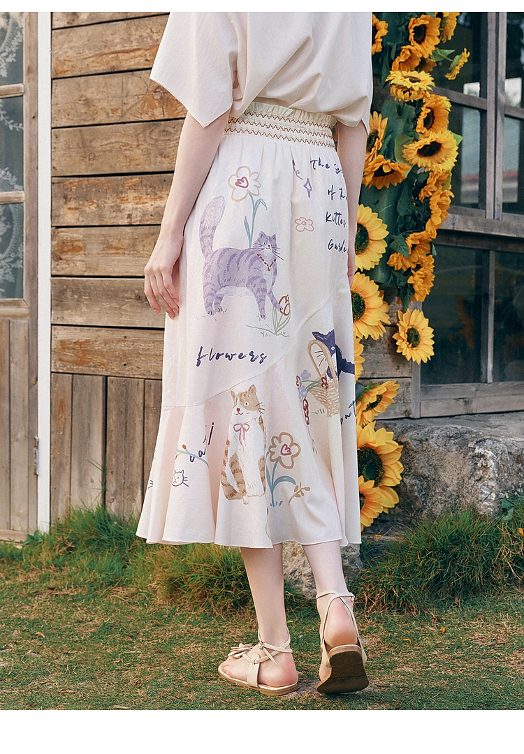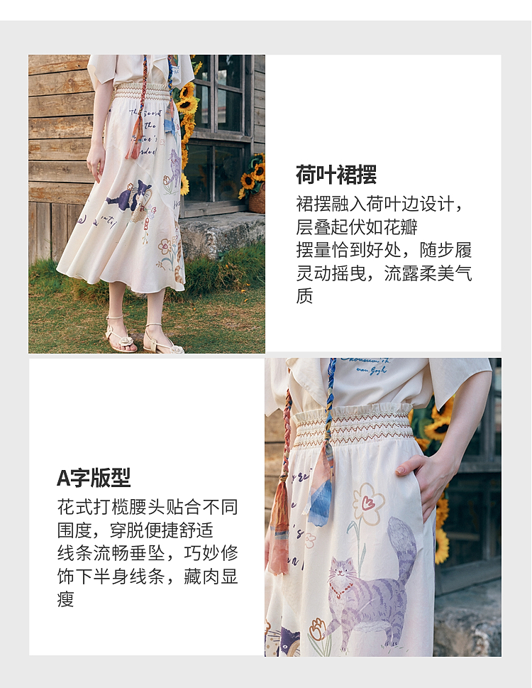 两三事心舟载月2026春季新款小清新猫咪印花荷叶边裙摆高腰半身裙