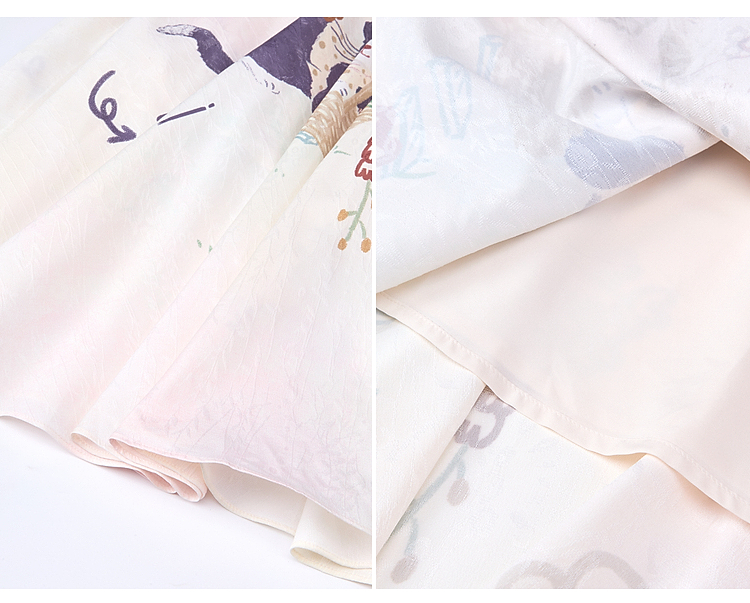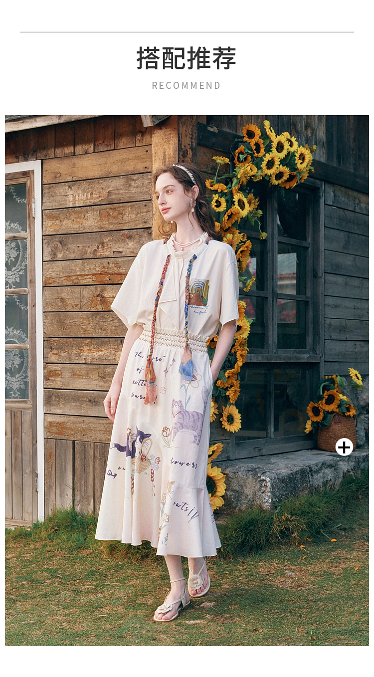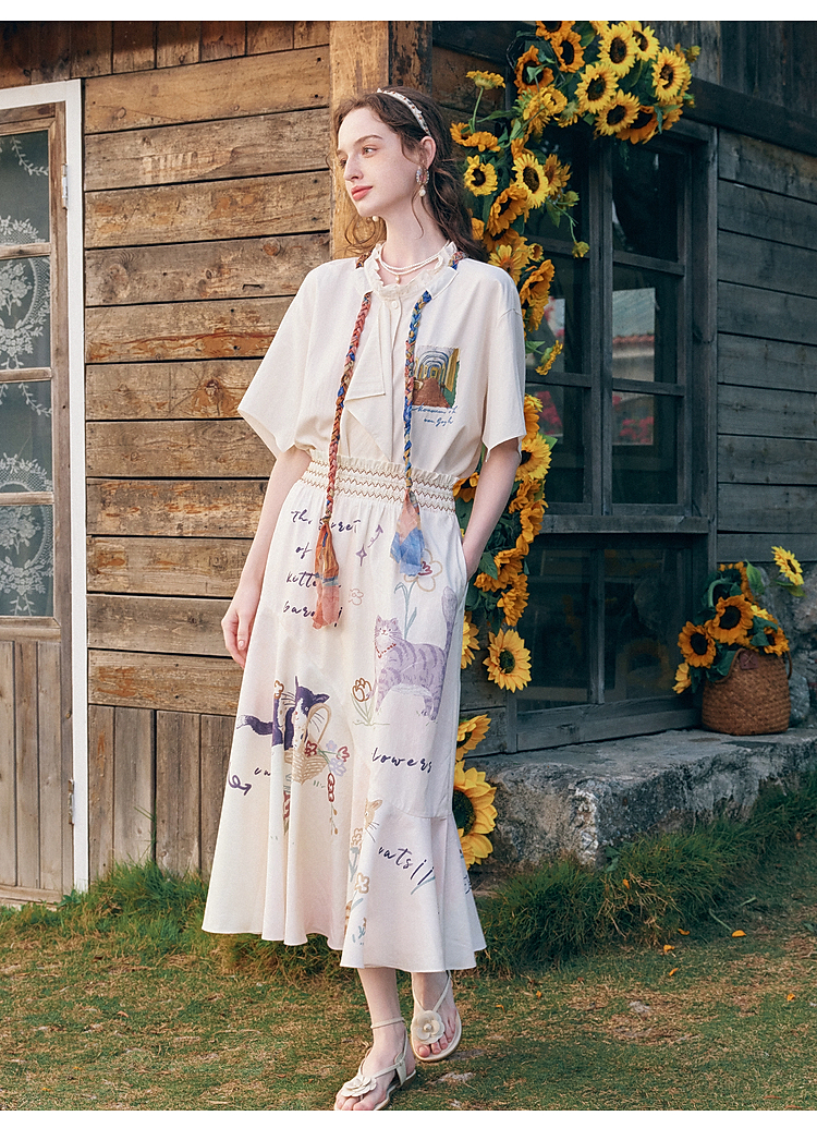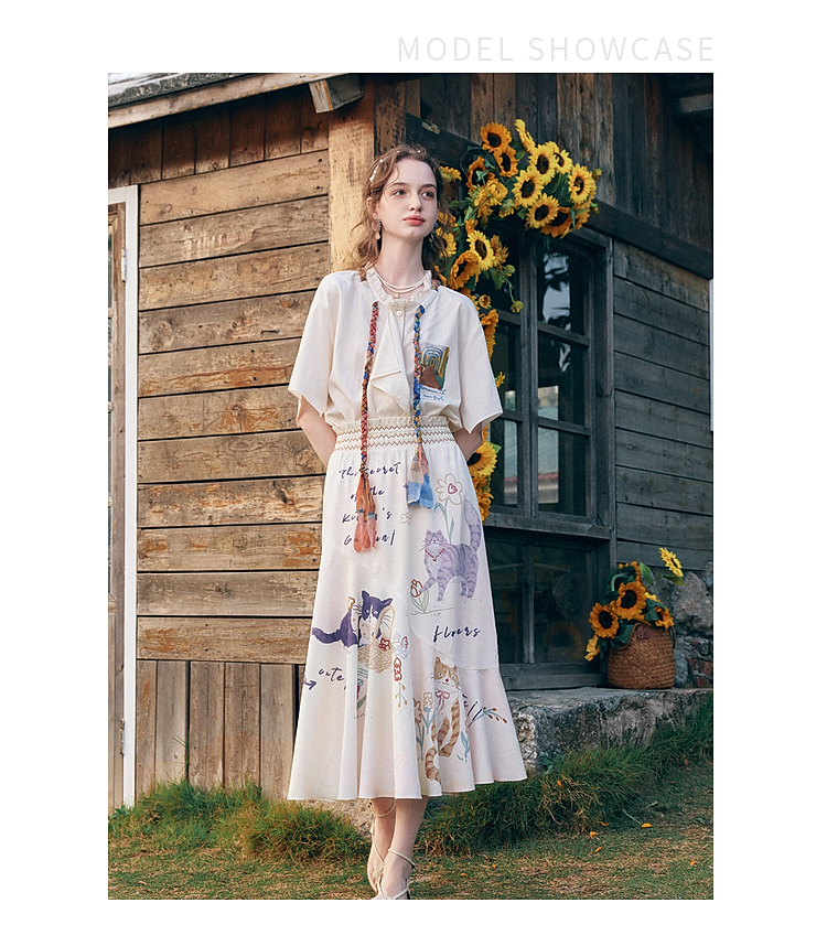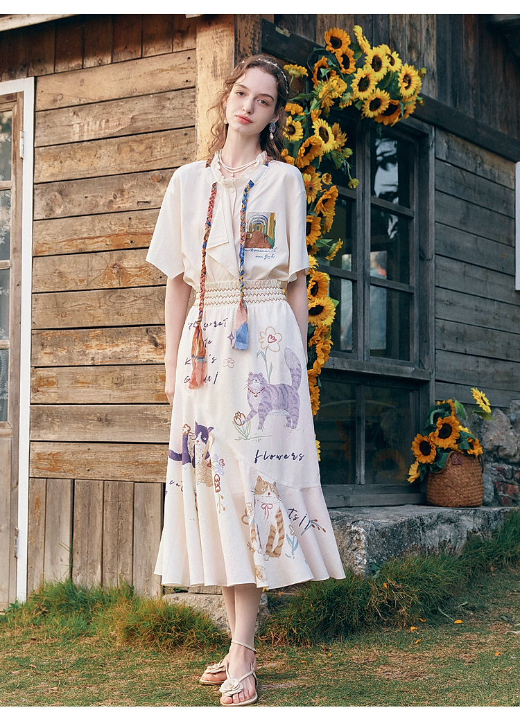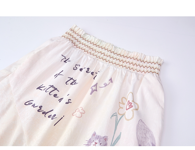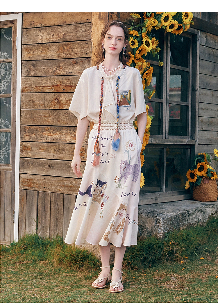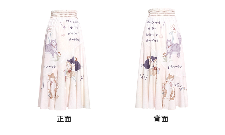 两三事心舟载月2026春季新款小清新猫咪印花荷叶边裙摆高腰半身裙