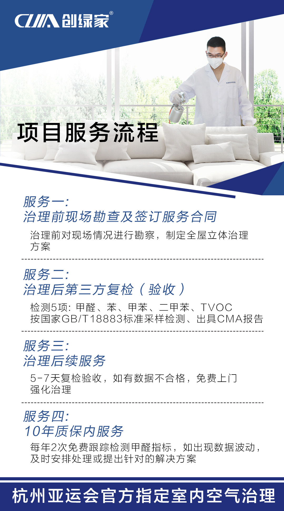 创绿家-除甲醛的服务保障:我们签订服务合同,治理后提供第三方权威检测机构上门检测验收,出具CMA五项数据报告;并且十年质保,并提供每年两次免费甲醛复测,为您家居住健康保驾护航。